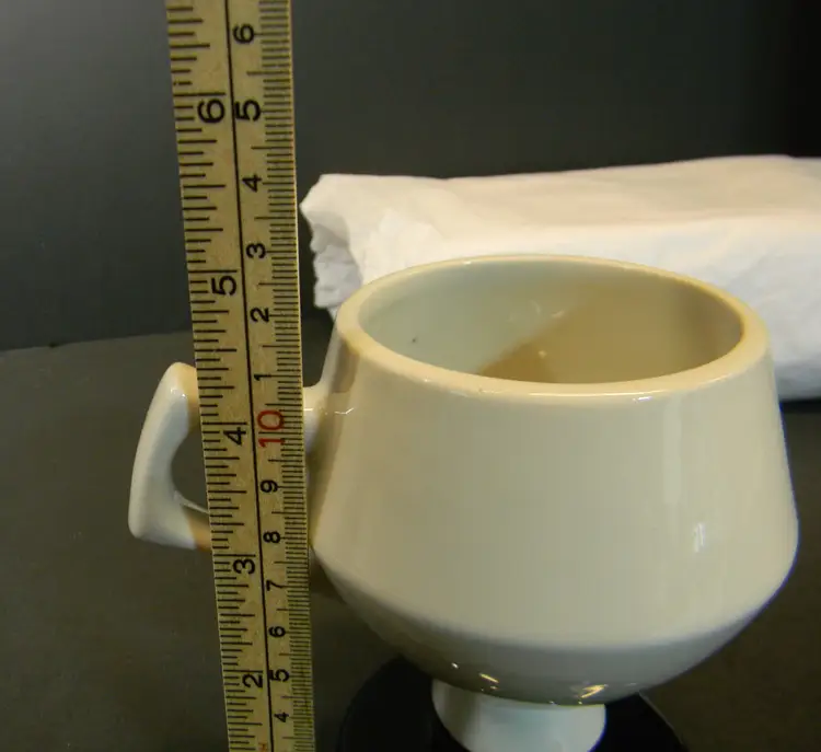 Hall Pedestal Coffee Mug also referred to as a goblet or Irish coffee mug A white/ivory faced bowl top and a contrasting black pedestal base Made of Stoneware/ceramic in the USA Produced in the 1960-1980's No chips or cracks or scratches used condition see all photos before purchasing