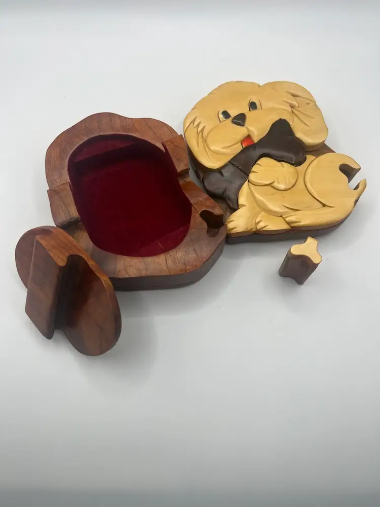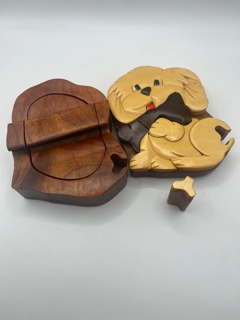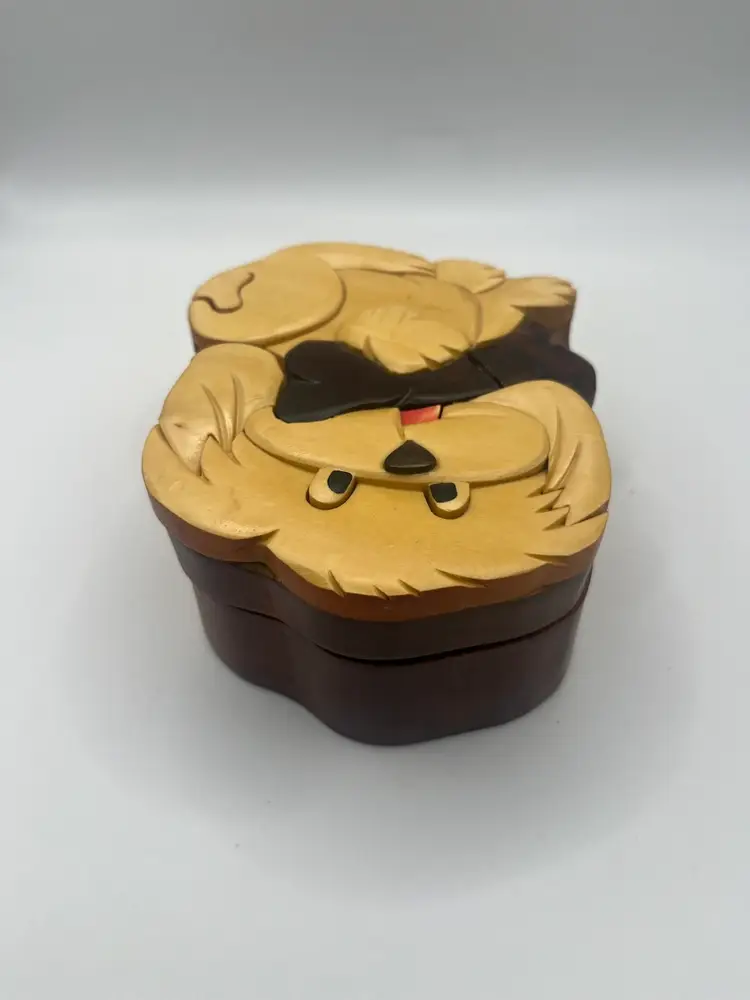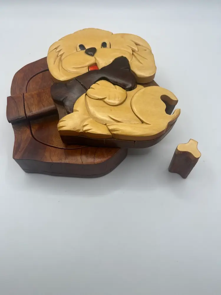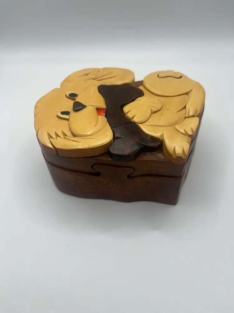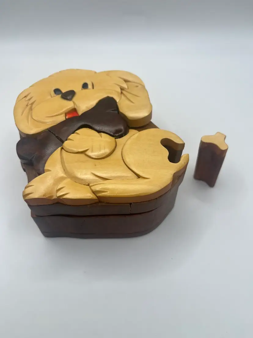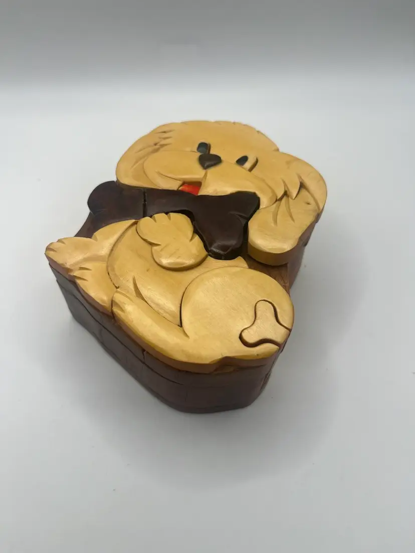 Adorable wooden puppy puzzle box in excellent condition. Approximately 5” x4” x 2”