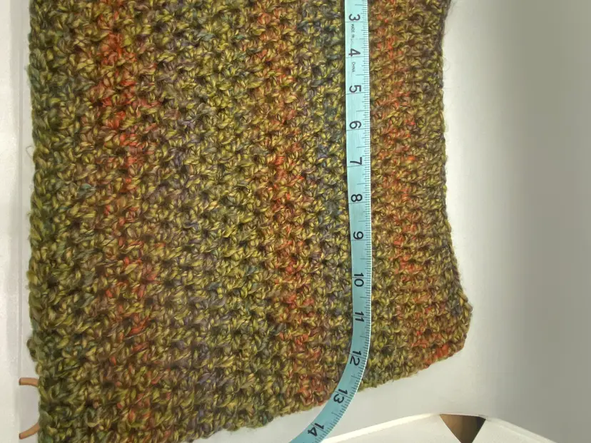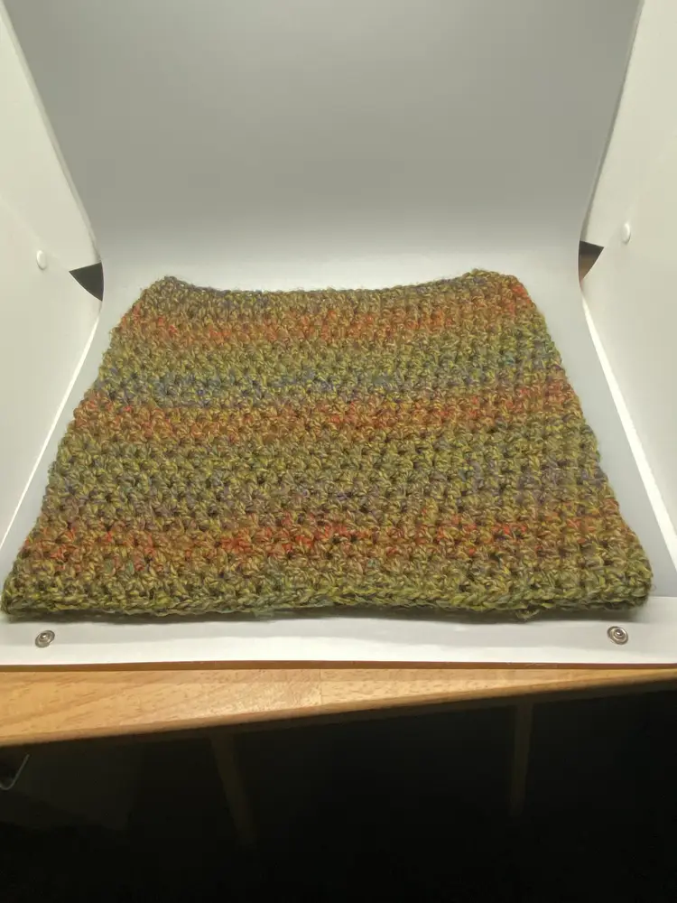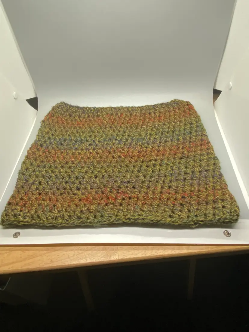Soft warm neutral autumn/winter colors (rust red, charcoal gray and olive green made with Lionbrand Homespun yarn approx. 13" wide x 11" long hand wash and dry flat for best results