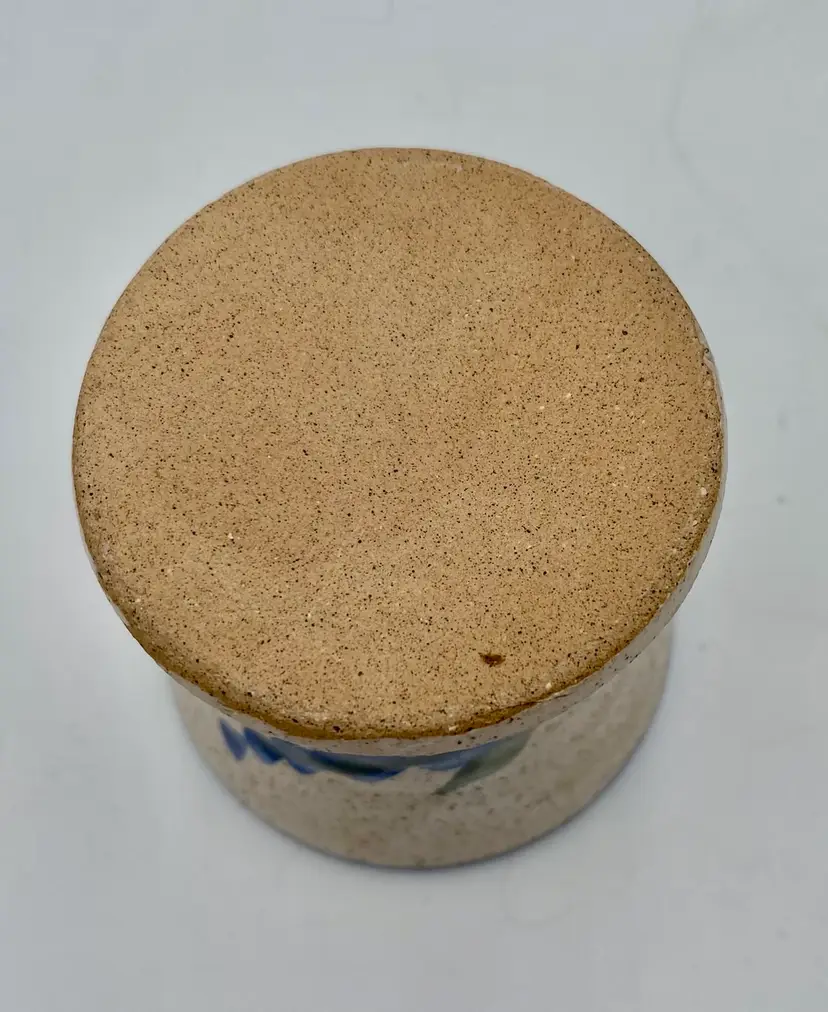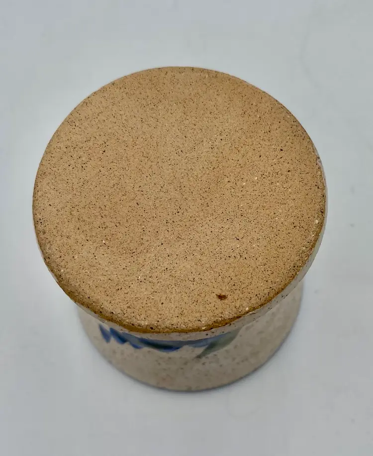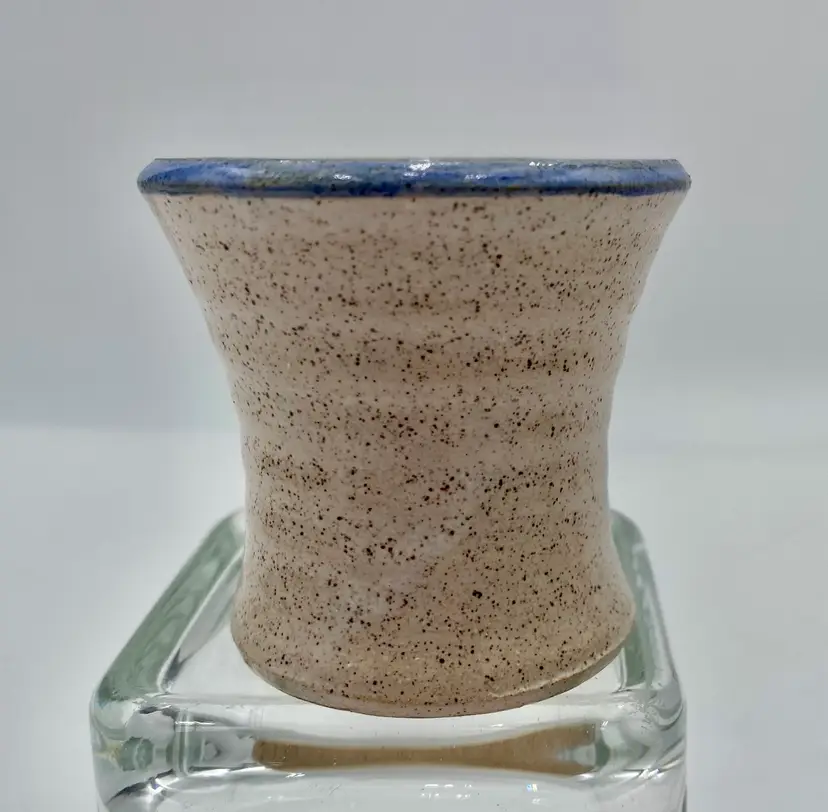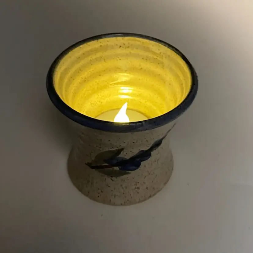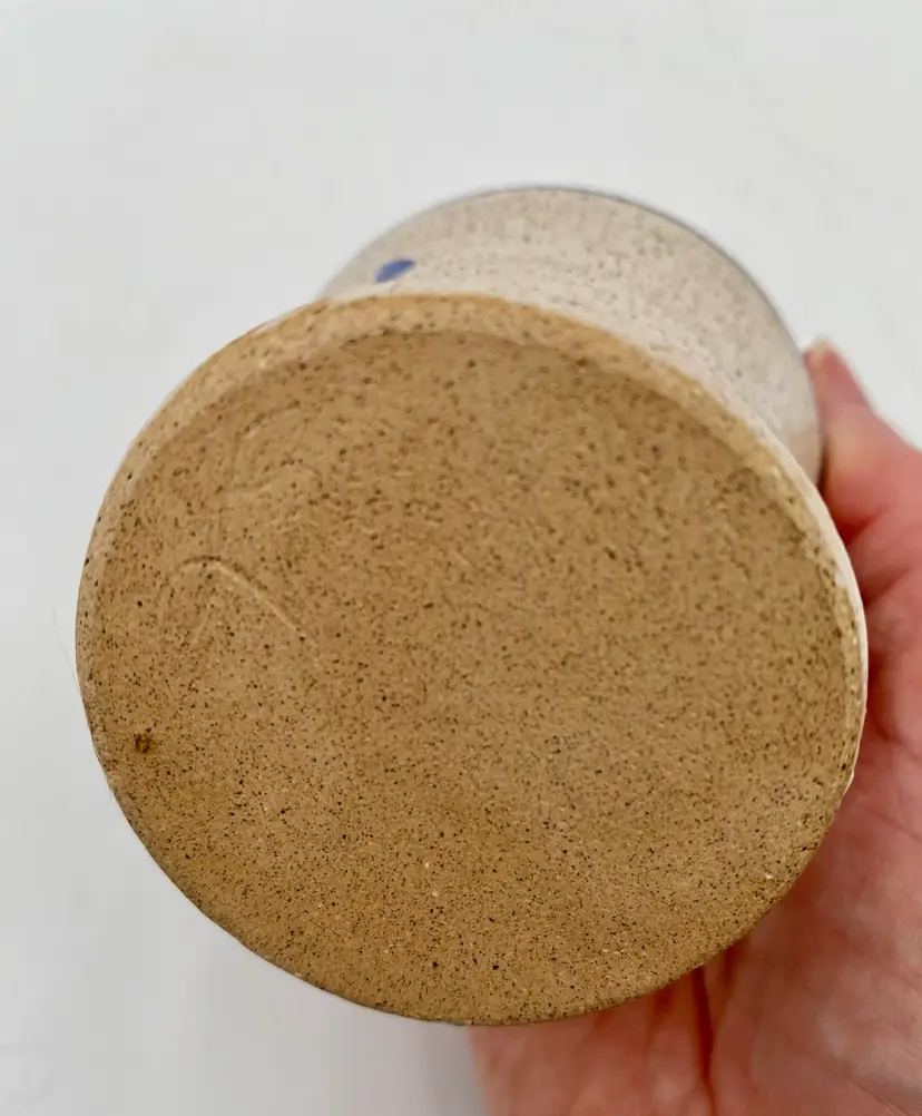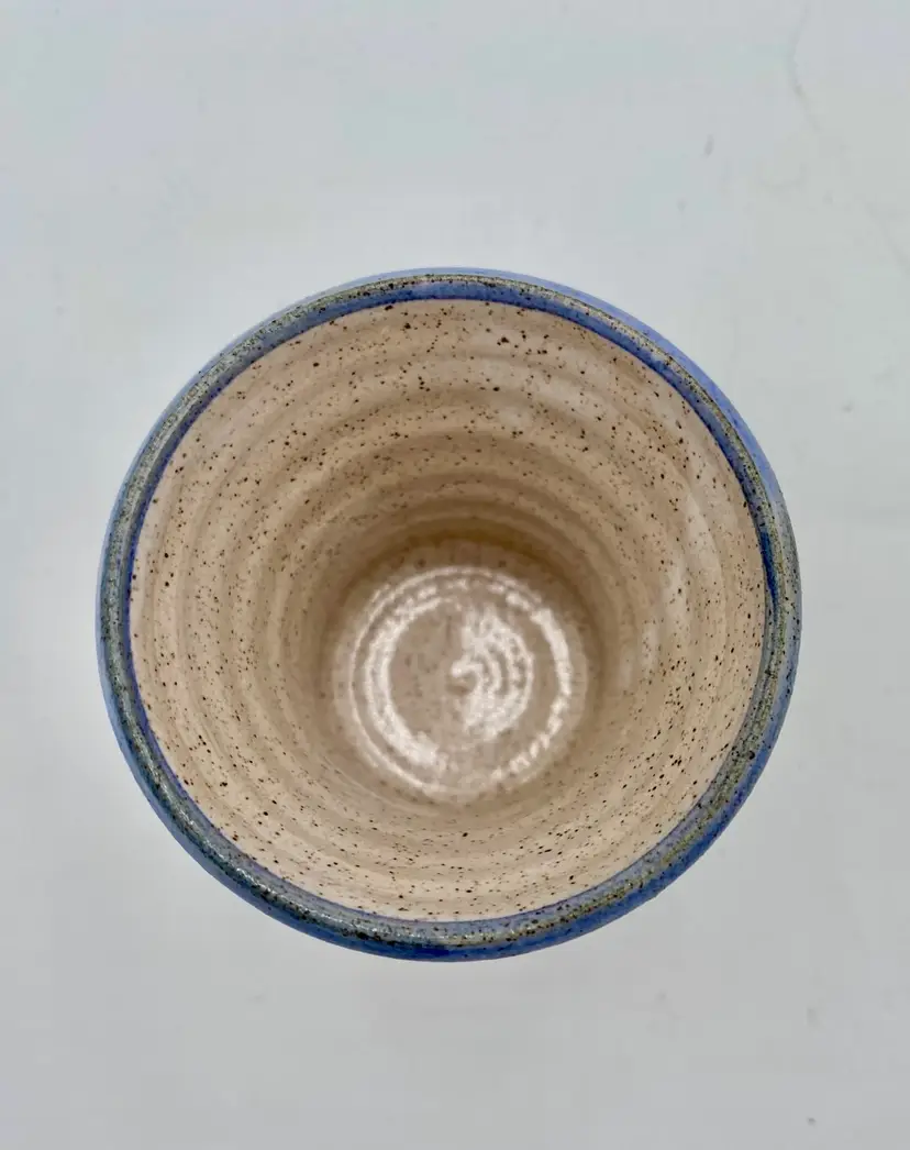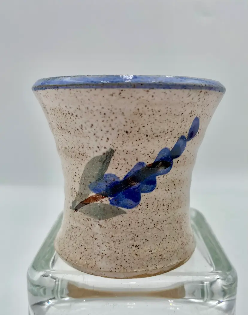 This hand-thrown studio pottery stoneware small flared vessel is a unique piece of art, signed by the artist. The piece features a blue floral stalk against a speckled cream background glaze. There is a blue ring around the rim. The piece is small, measuring 2.5 inches in height and 2.75 inches in width, the piece was crafted in the United States. It is signed with an upper case, script "L". This could be used as a cup, a small vase, or as a candle holder for a small pillar candle, votive or tea light.