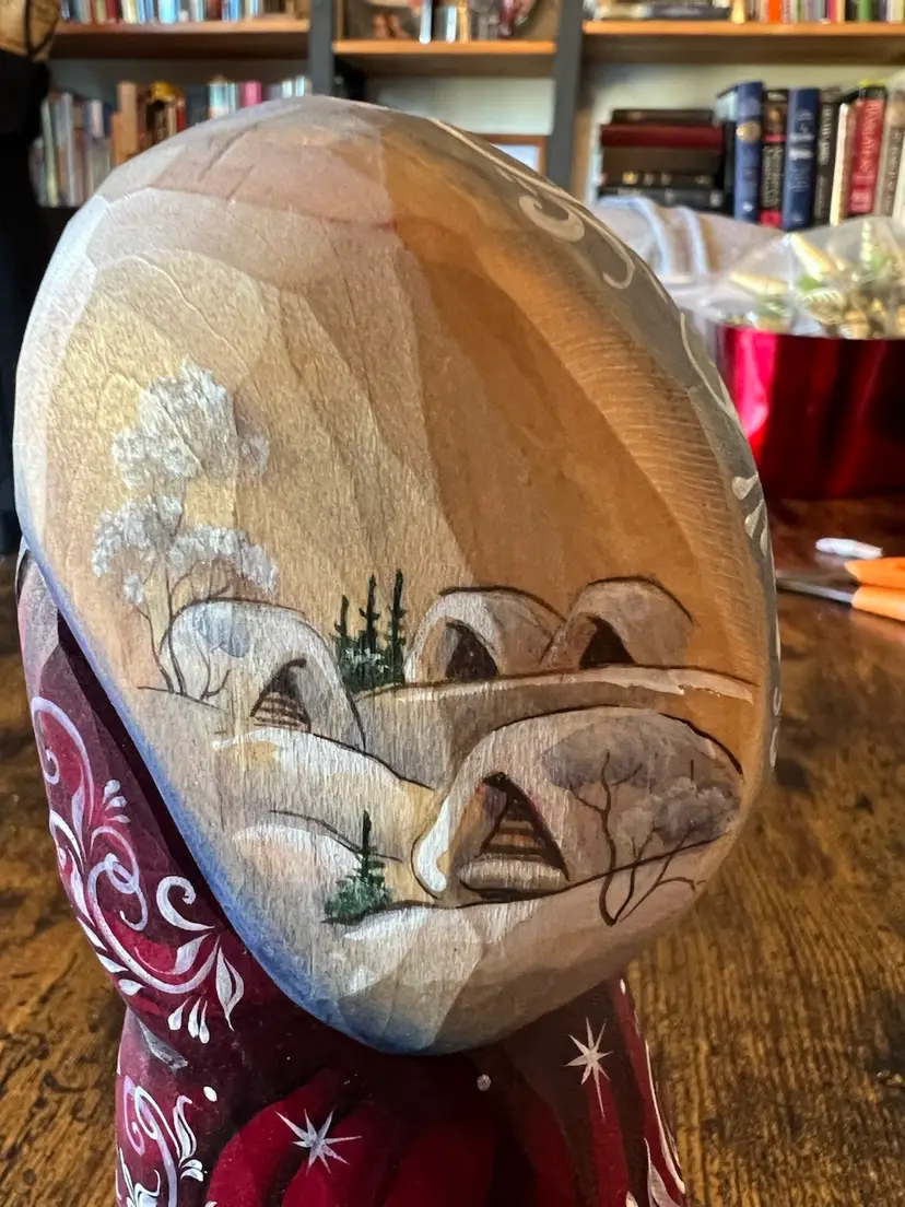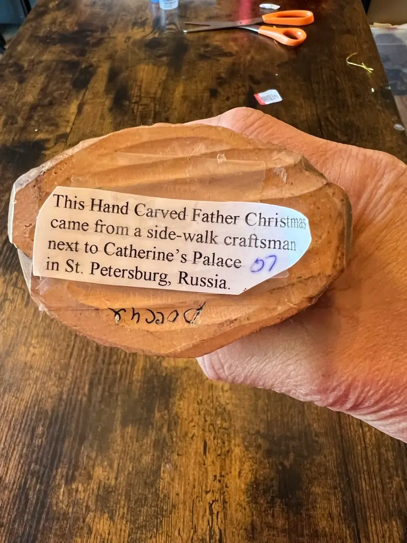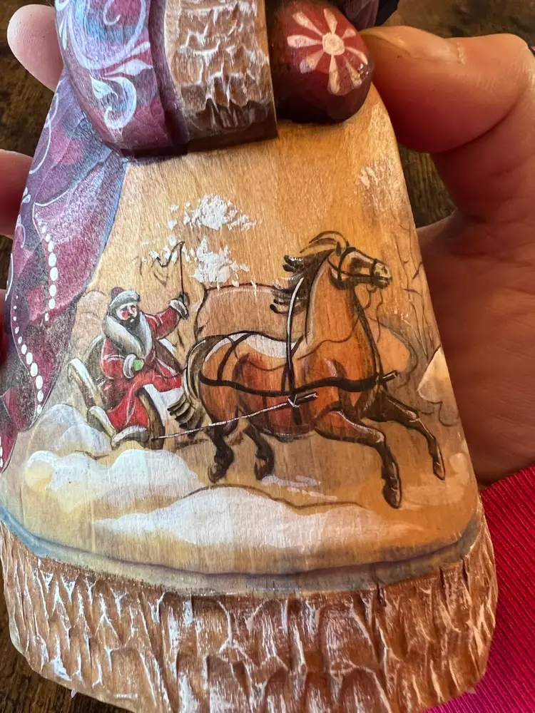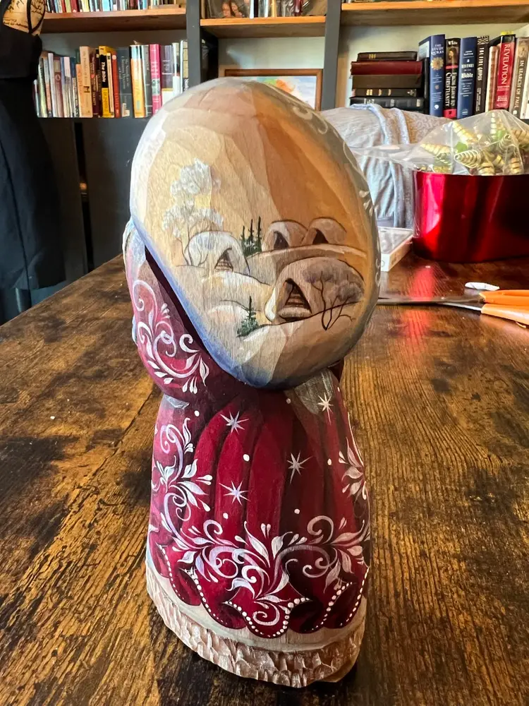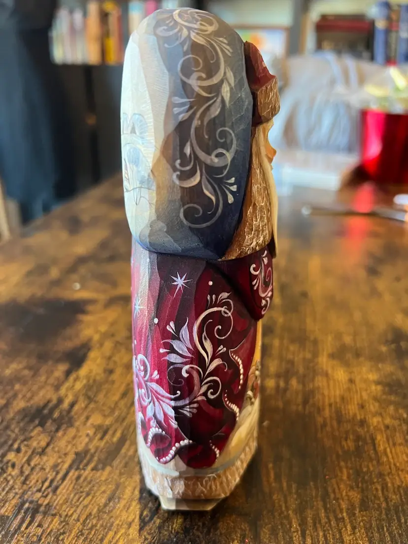 hand-carved and hand-painted Russian Santa Claus figurine, also known as Ded Moroz or Grandfather Frost. These figures are unique as each is typically an original piece of art, made from solid wood like linden or birch.
