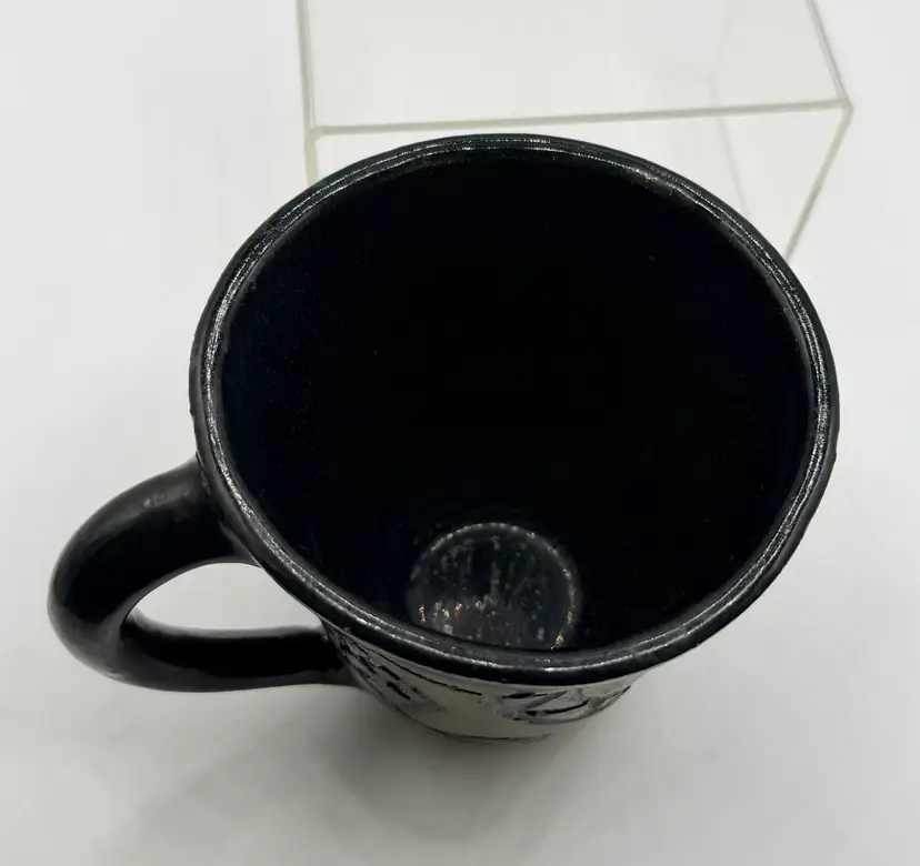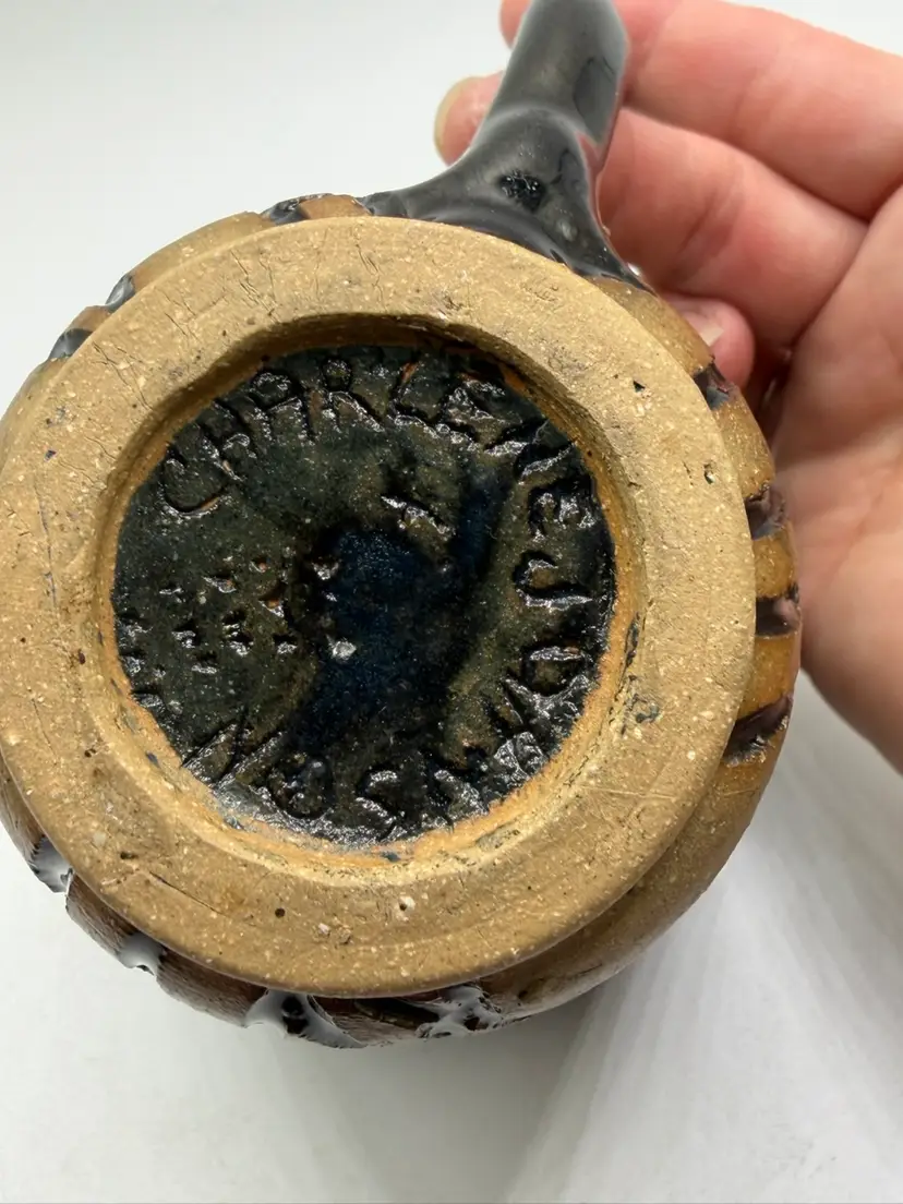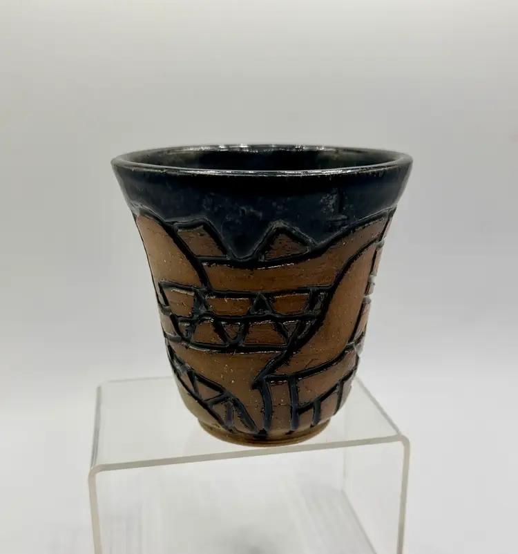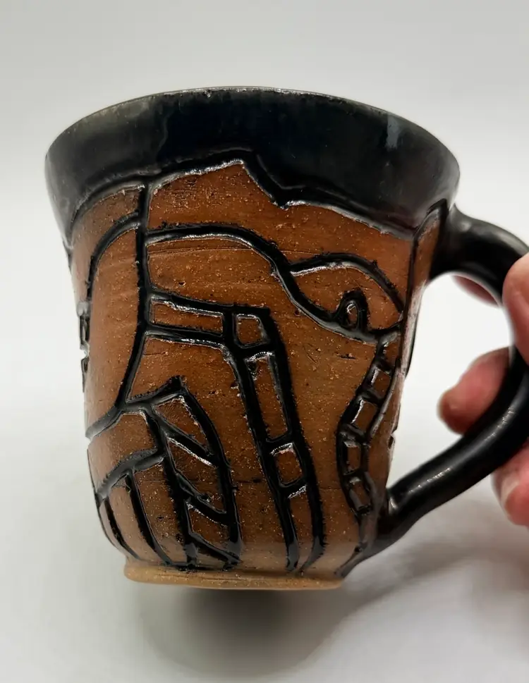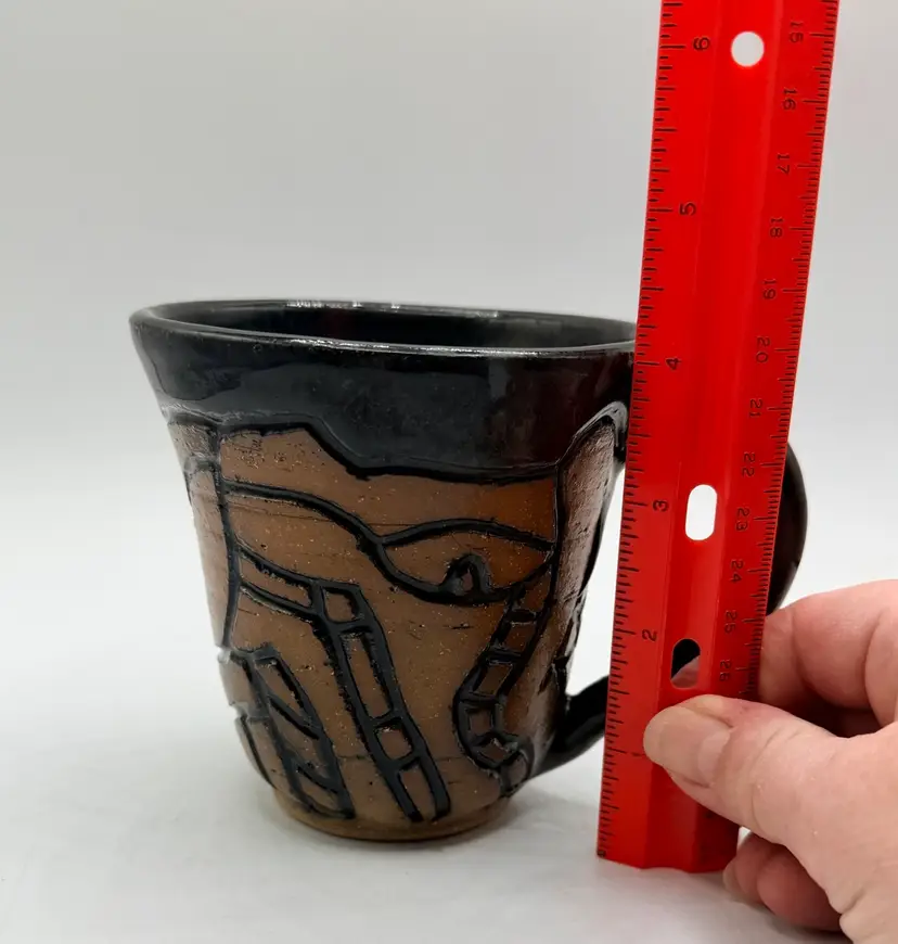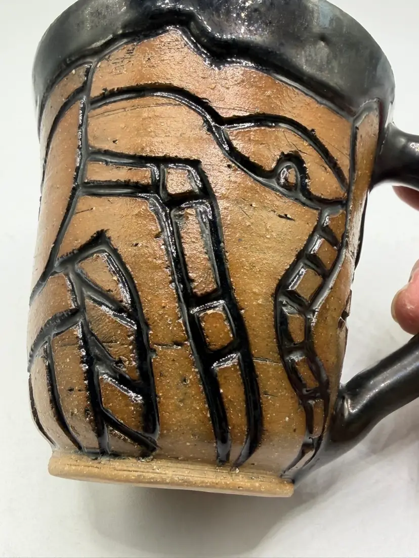 This handmade pottery mug features a unique abstract pattern carved into the clay, with a brown and tan color scheme. Signed by the artist, Charlene Johnson, this mug is not only a functional piece for enjoying hot beverages but also a decorative item for any home. Standing at 4.25 inches tall and made from clay and ceramic using pottery production techniques, this mug is a truly one-of-a-kind handcrafted piece that showcases craftsmanship and artistic flair.