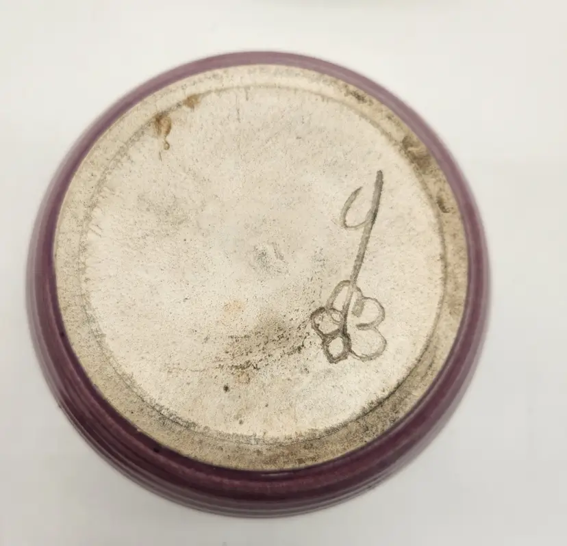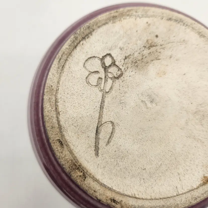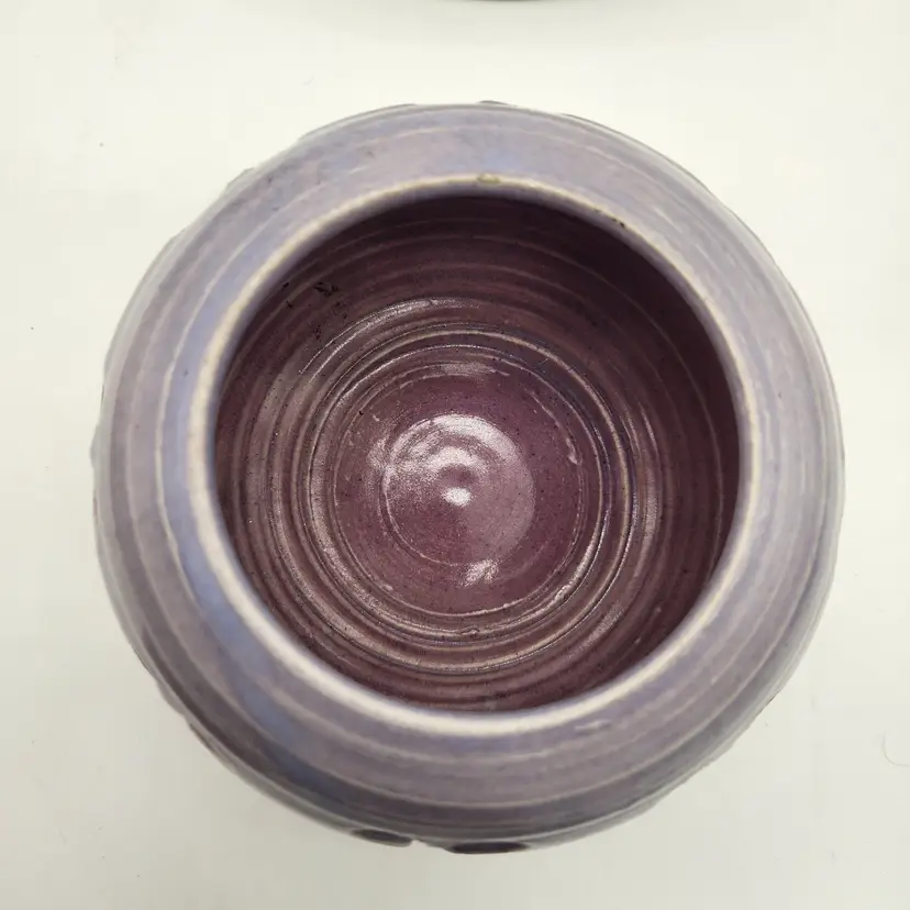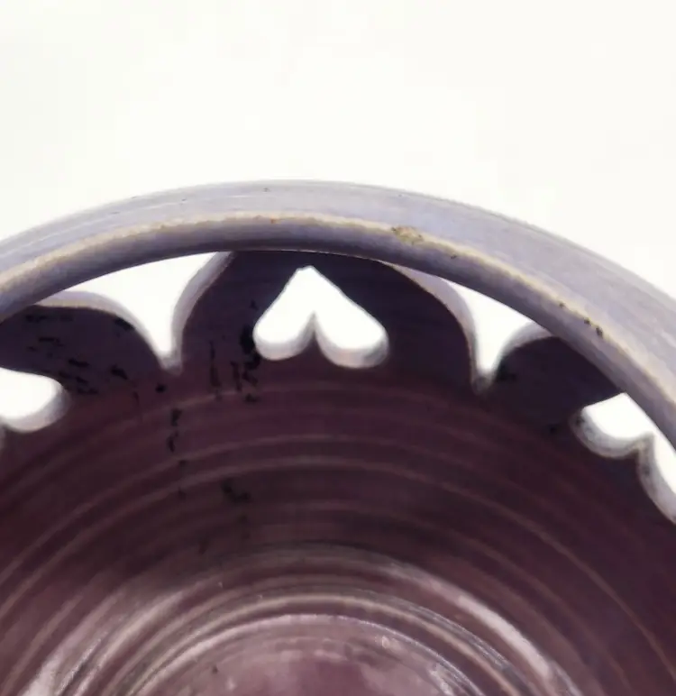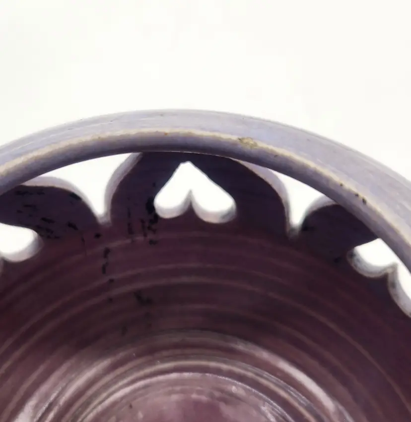 The perfect gift for the person in your life who loves romance and candles! Large and small heart cutouts run perfectly spaced around this beautifully-made holder. The glaze is semi-gloss with horizontal striping that was characteristic of studio pottery from the late 20th to early 21st century. The piece is signed with what looks to be a stylized daisy but I was unable to pinpoint the artist. Tea light included. Measurements: 3 1/4" opening at rim, 6" in diameter at widest point, 4 1/4" tall Like New Condition: one tiny chip on upper rim (see photo). Keywords: pottery, handmade, ceramic, lantern, candle holder, tealight, valentine, romantic, gift, table decor, centerpiece, luminous, artisan, purple
