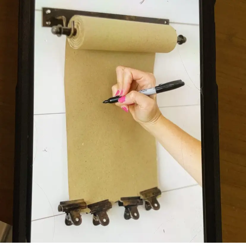 List your weekly menu plan, schedule or verse of the week on this metal bracket with kraft paper scroll. Complete with hardware for mounting on wall.