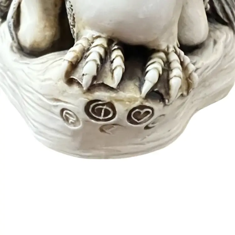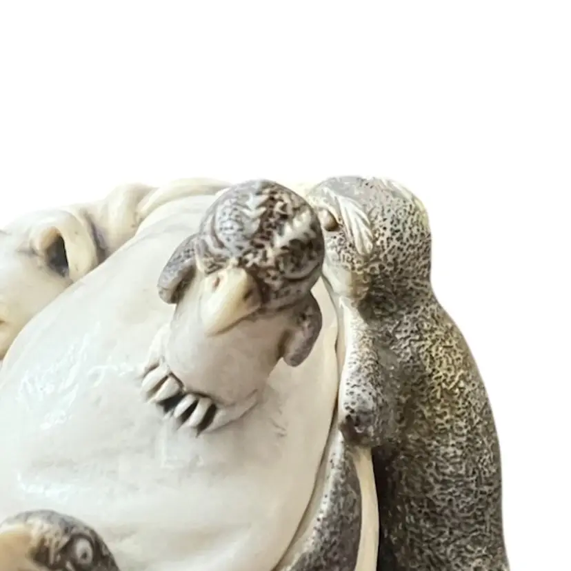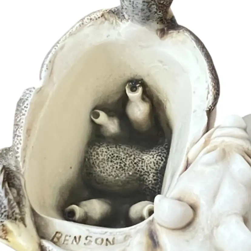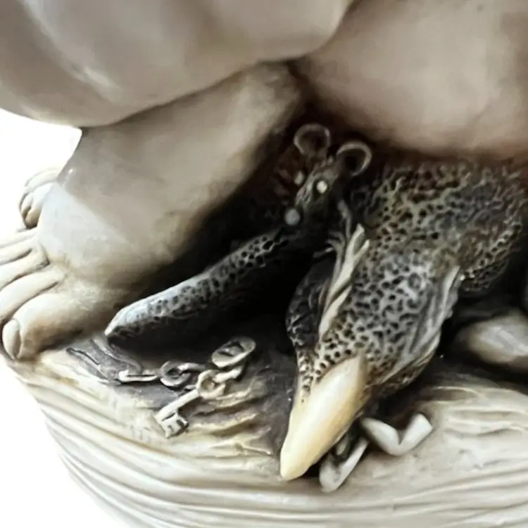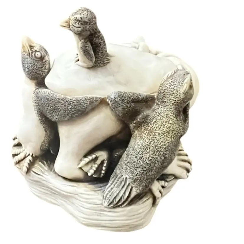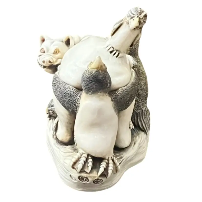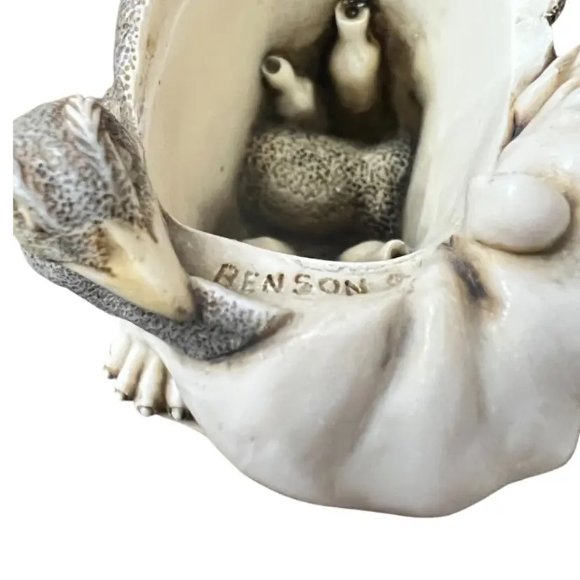 CARVED BY PETER CALVESBERT IN 1997 RELEASED 6/1/1997 THEN RETIRED 10/1/1997. Following their friend Murphy on a mad adventure to the North Pole, the two penguins are trying to push the polar bear off Murphy, who is trapped underneath as he scrambles to pick up his keys. Oblivious to the excitement is a young penguin asleep on the magnetic pole on top of the polar bear’s back, which handily serves as the lid handle. The mouse is dangerously close to the bear’s bared teeth. Inside are Murphy’s four beer bottles. Look for the hidden inscription, “JC 1875,” a reference to the oldest woman in the world, Jeannie Calmont, celebrating her 122nd birthday in France at the time of carving. “Benson 9” on the rim refers to a 9-year-old horse that Peter sometimes borrows to ride with Andrea. Hallmarks include ©, heart, HBC logo, ed.#, and Pc.