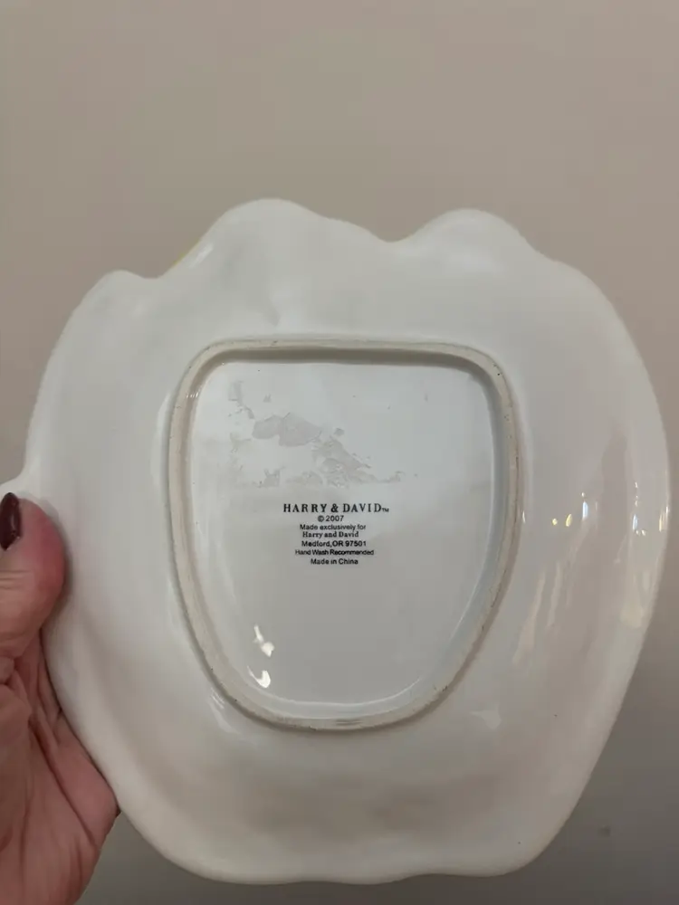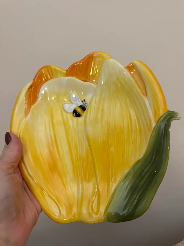 Harry & David hand-painted yellow ceramic snack plate with a bumblebee accent. 8” X 8”