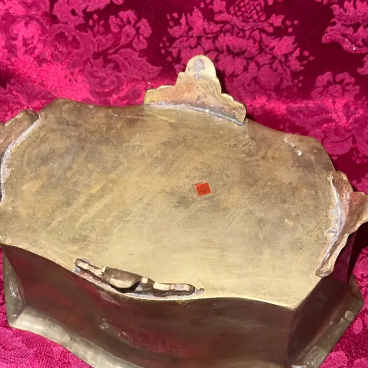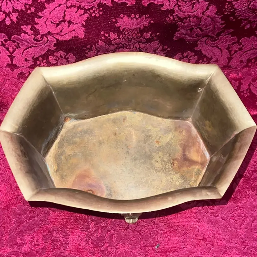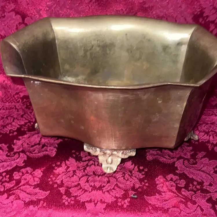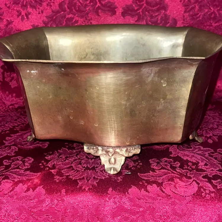 Heavy vintage brass bowl or planter, featuring rectangular shape with a flared rim and decorative feet.