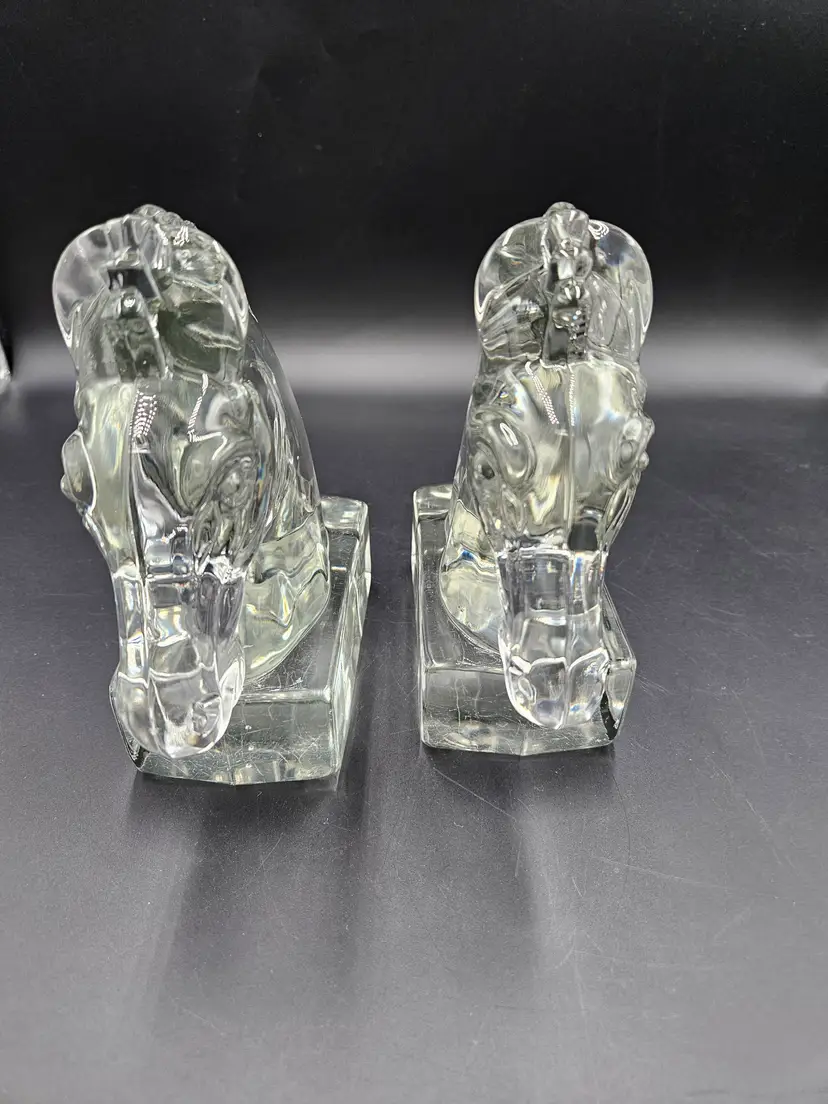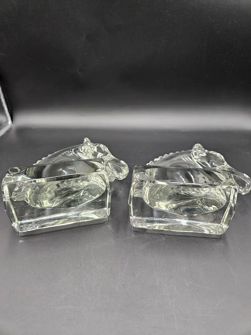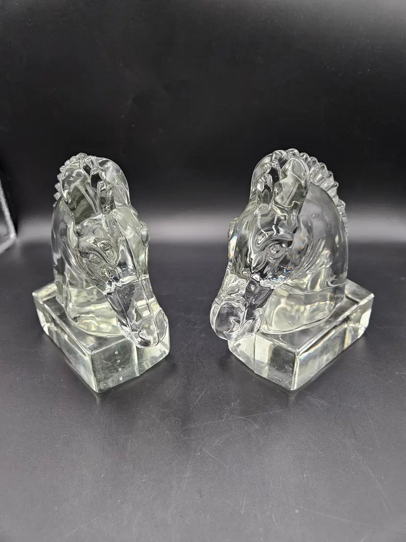 #BIN23 Heisey Clear Glass Horse Head Bookends