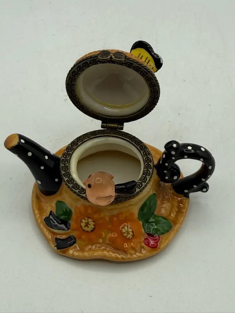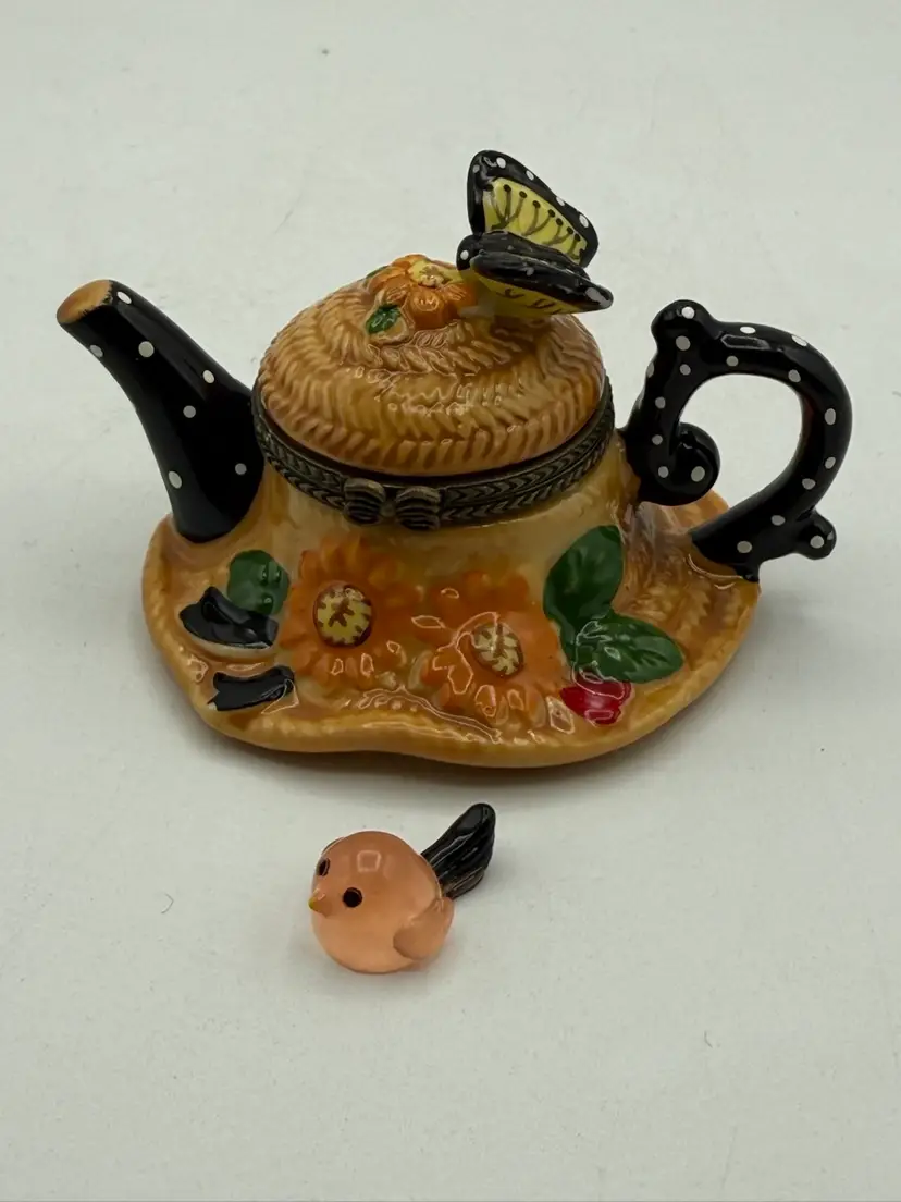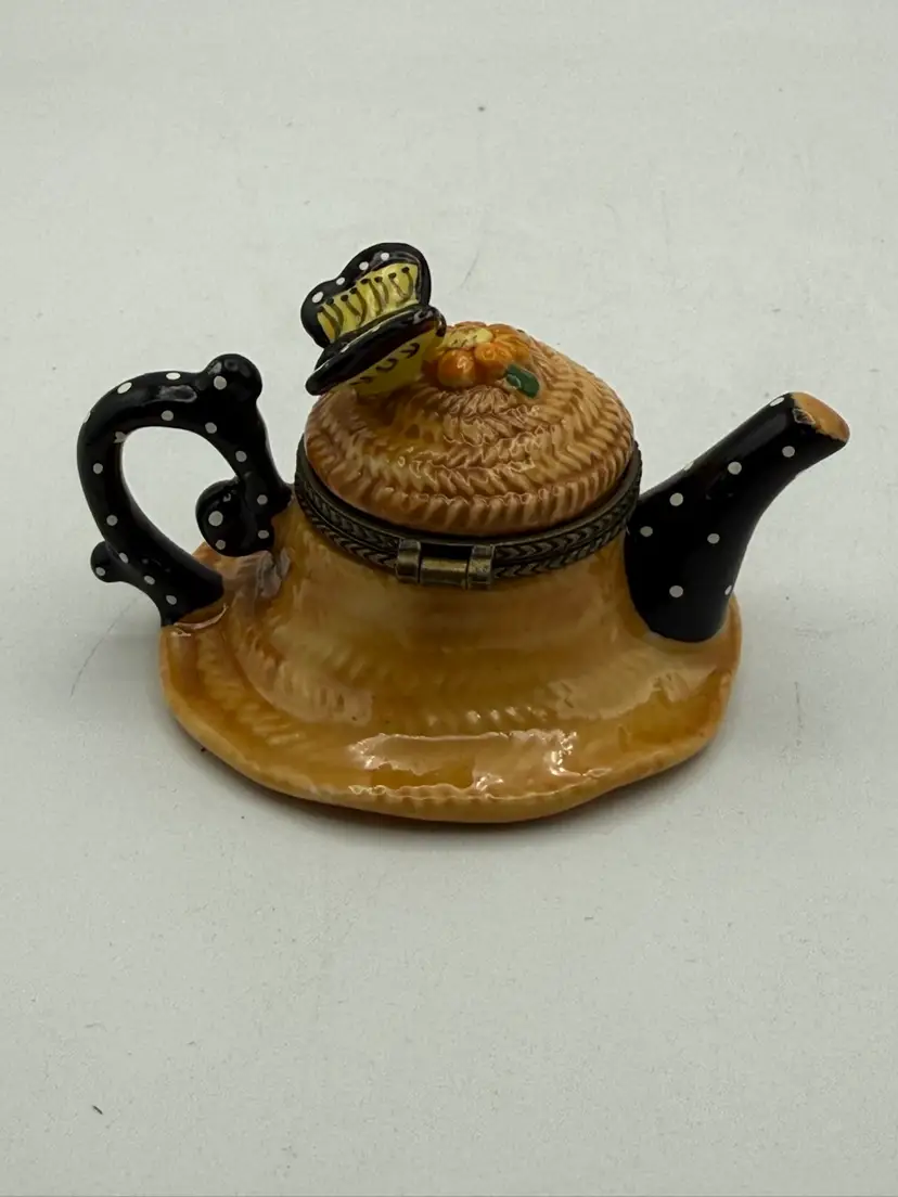 This is such a sweet spring teapot made to look like a straw hat with a butterfly.