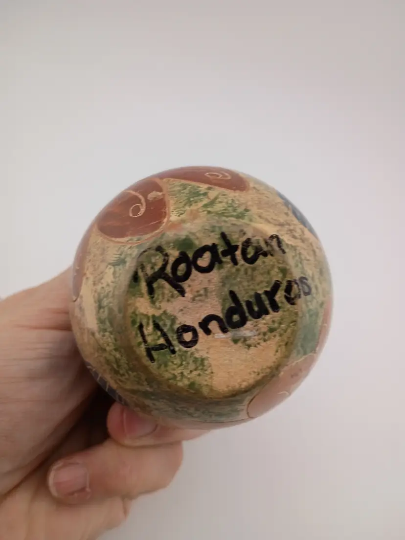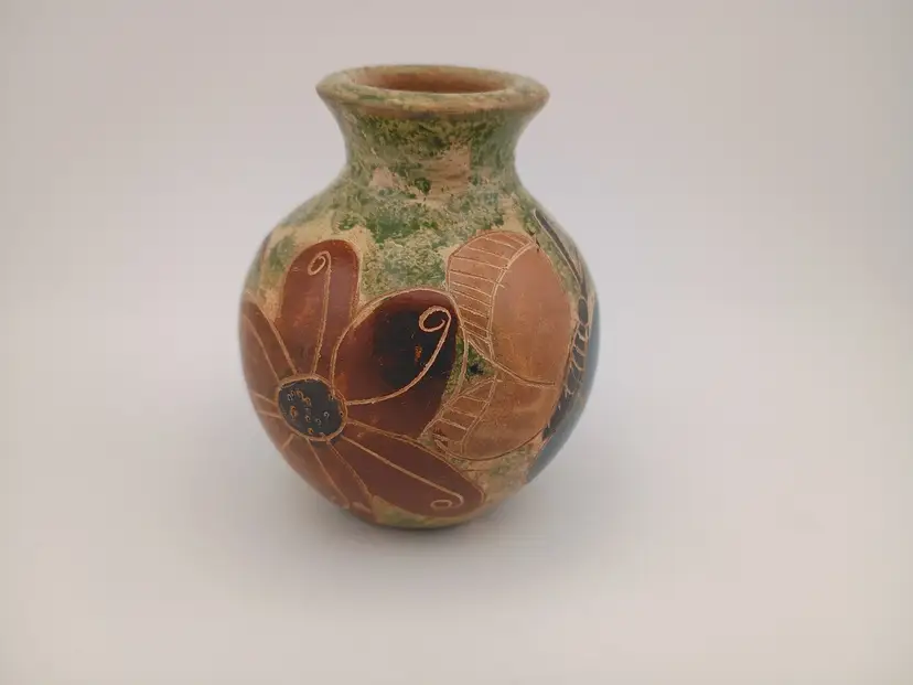 It's a pretty little bud vase from Honduras, incised with butterly and flower design. It's 3" tall and in excellent condition with no chips or cracks.