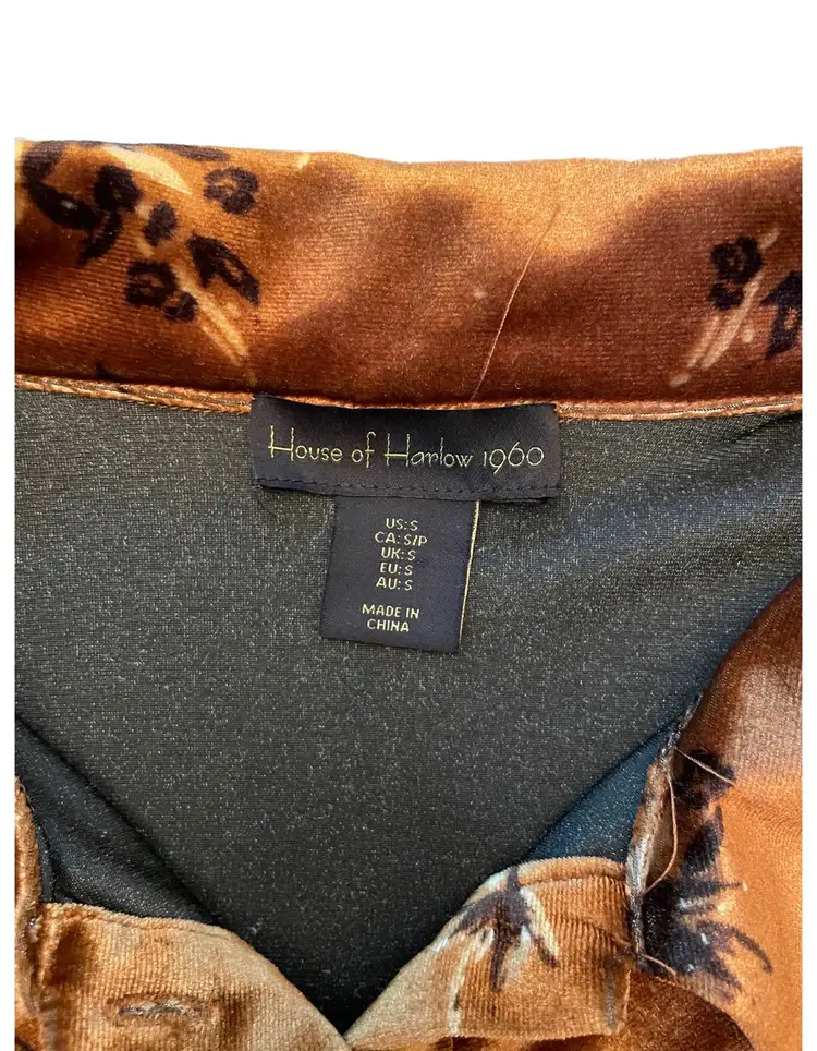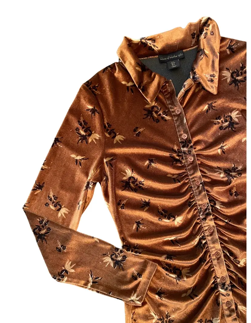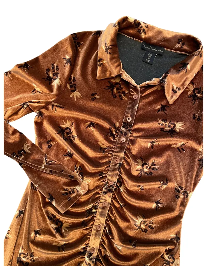 House of Harlow Revolve Crushed Velvet Floral Mini Dress Size Small Excellent condition!! $188 Original Retail 96% Polyester 4% Spandex Front button closure with ruched detail, subtle shimmery crushed velvet finish, floral print, collared neckline Approx pit to pit (flat lay) β 17β Approx length (shoulder to hem) β 33β G / 400