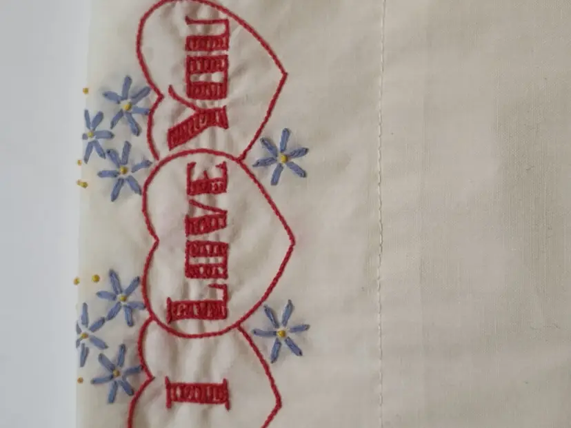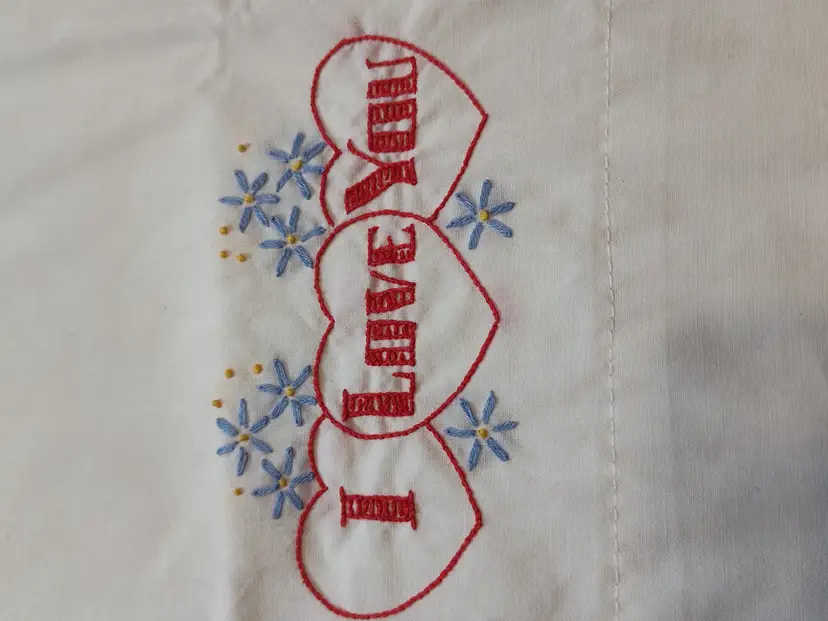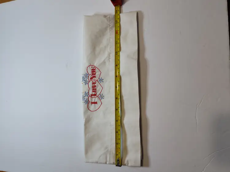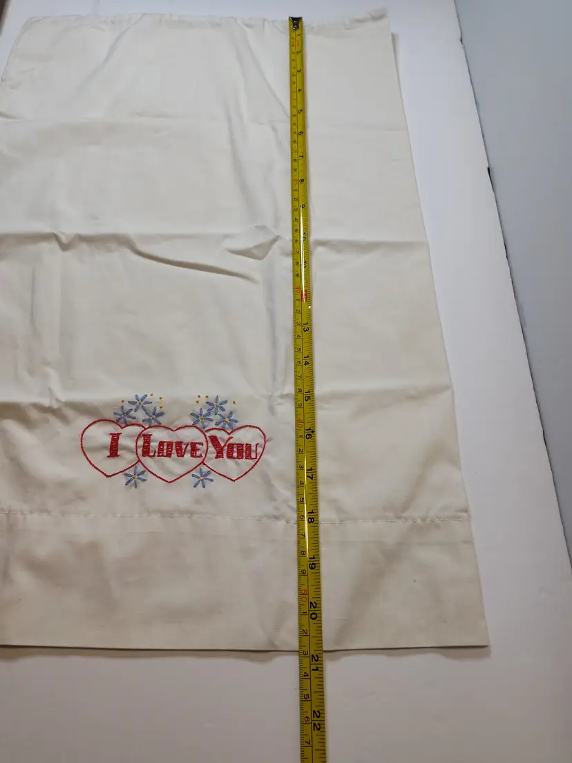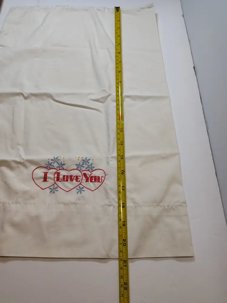 Small white pillow case with 3 hearts & I Love You embroidered on end