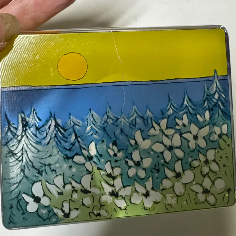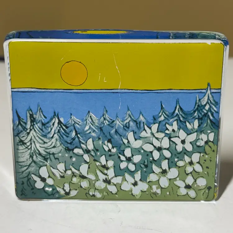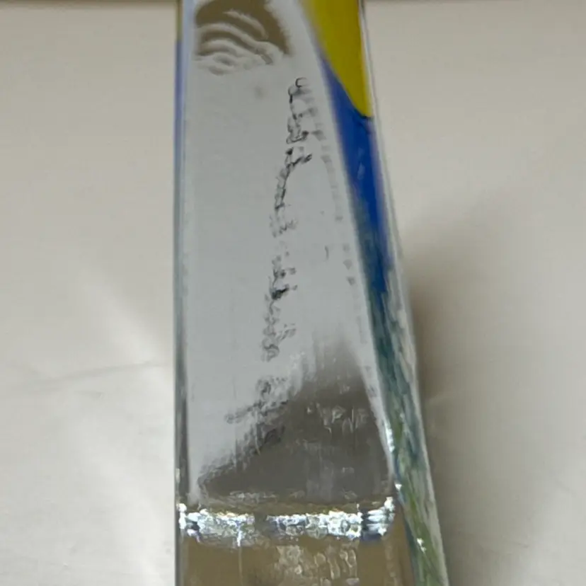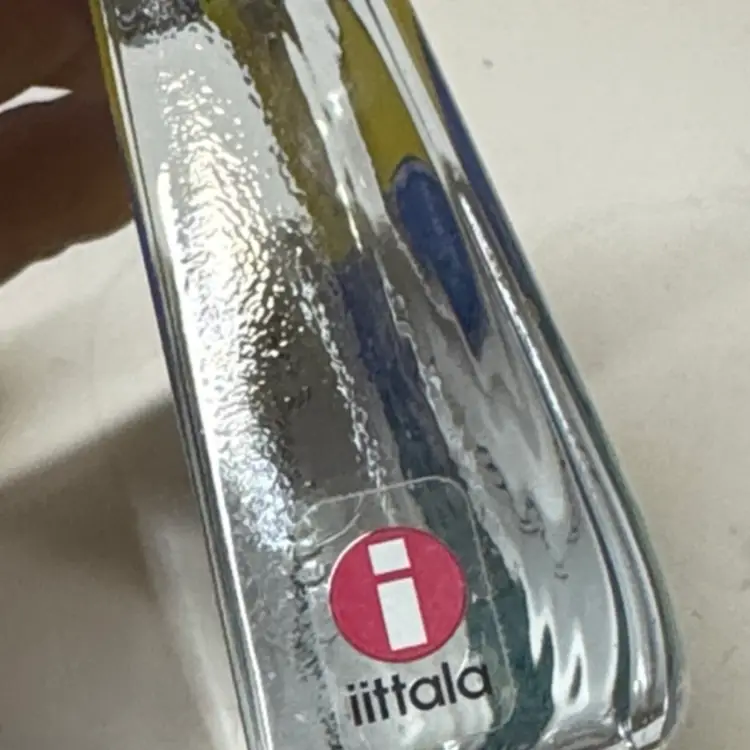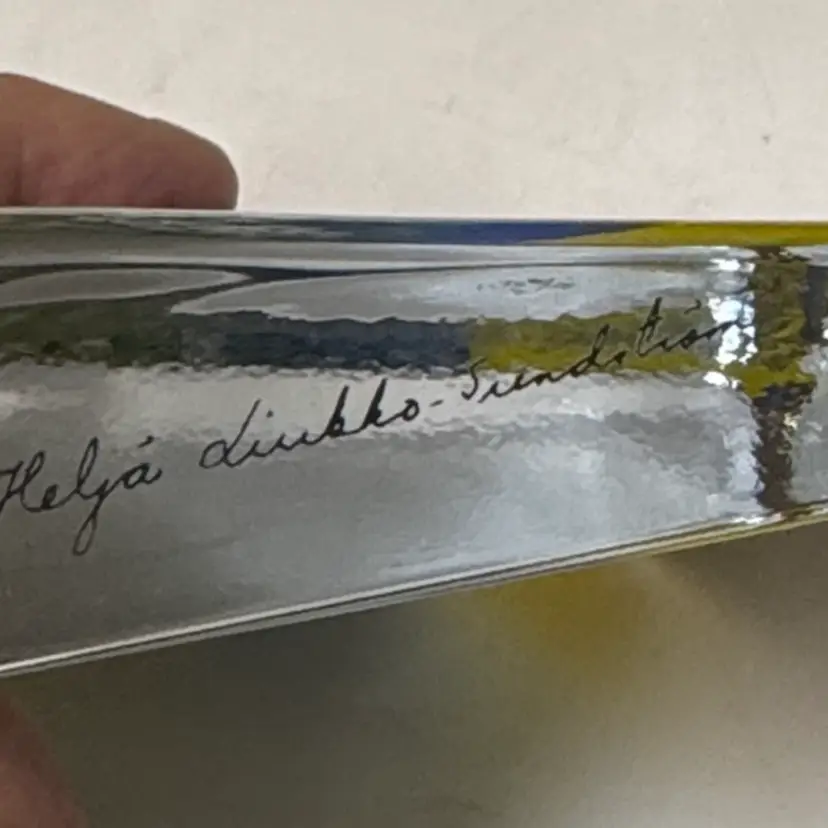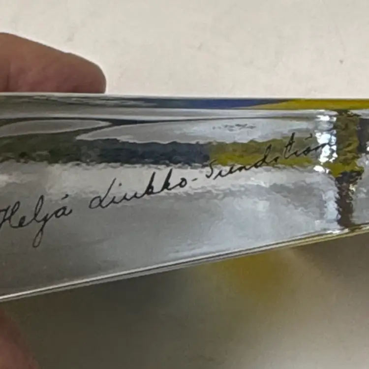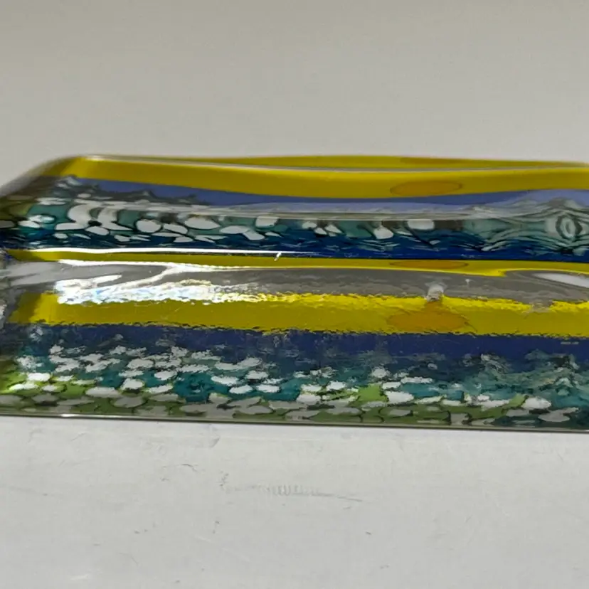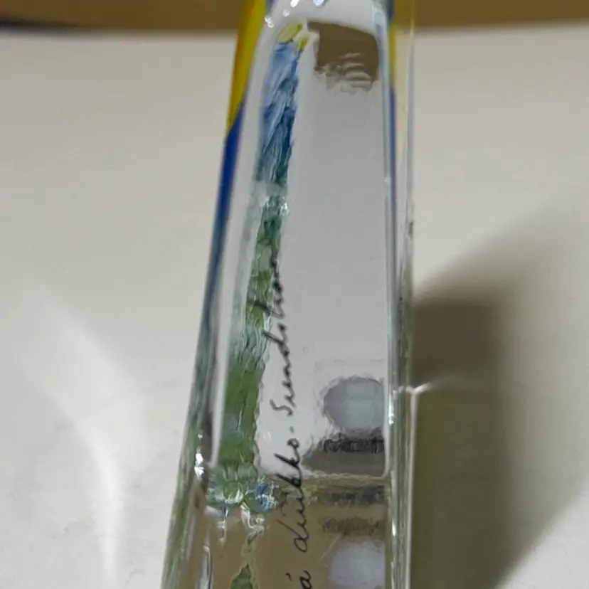 Enhance your home with this stunning glass art piece featuring a vibrant yellow and blue landscape. Perfect for adding a touch of nature to any room. IITTALA Heljä Liukko-Sundström Warmth of the Sun Glass Card Paperweight Finland 4” by 3.25” tall by 1” Signed by the artist with the original sticker Excellent condition with no breaks or chips there is one scratch in the paint From Finland, designed by Heljä Liukko-Sundström, who worked at the Arabia Art Department. The design, painted on the back of the clear glass, features a landscape scene with white flowers, pine trees, a blue sky, and a yellow sun. These glass cards are designed to stand freely on a flat surface, allowing light to shine through the artwork. (87123263)