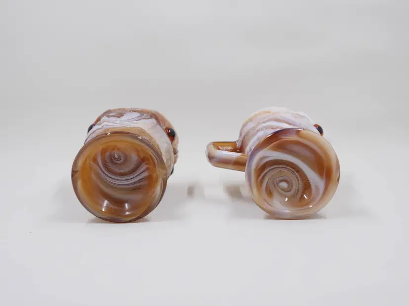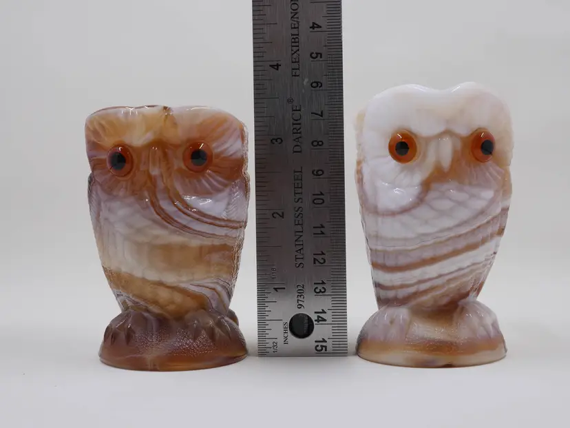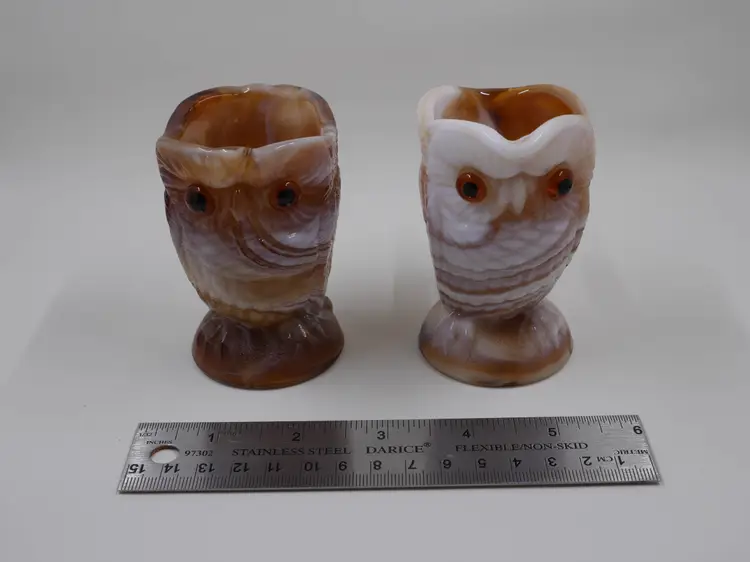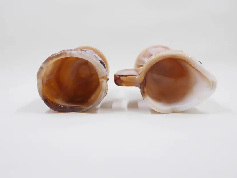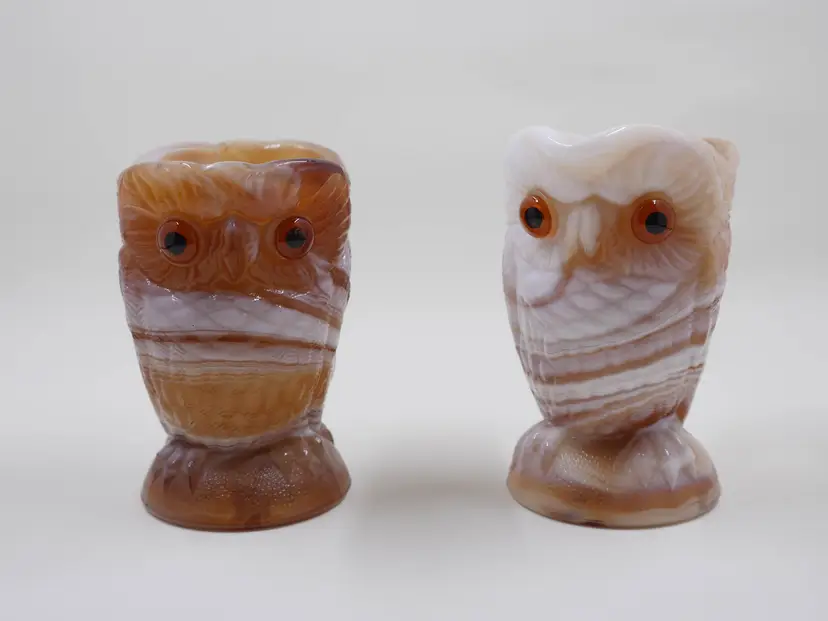 This is a two-piece set consisting of a creamer and a sugar bowl, both in the form of an owl. The opaque glass has a unique, marbled or swirled effect in tones of caramel brown, cream, and white. The owls feature textured feathers, prominent circular eyes, and small beaks. The creamer has an applied handle, and the sugar bowl is an open-top vessel. The base of the pieces are marked with a molded "IG" for Imperial Glass. The set stands approximately 3.5" tall.