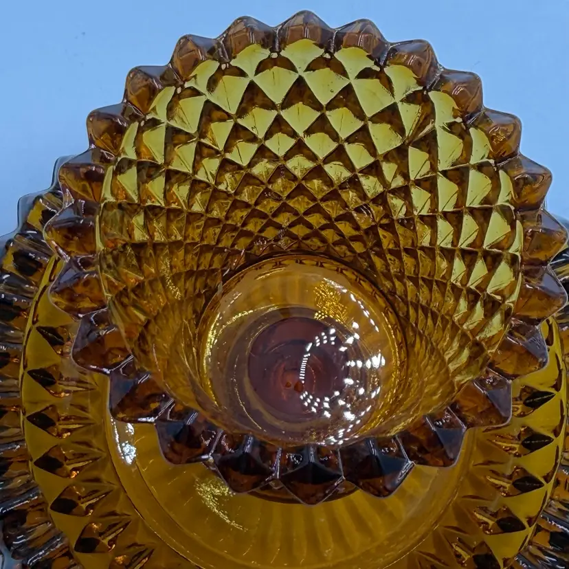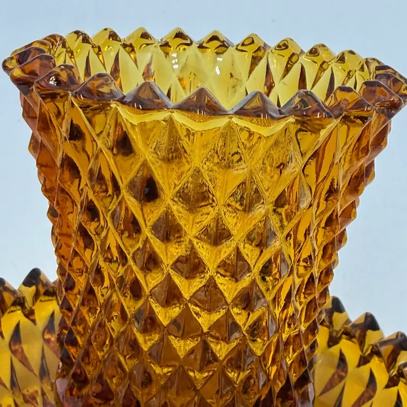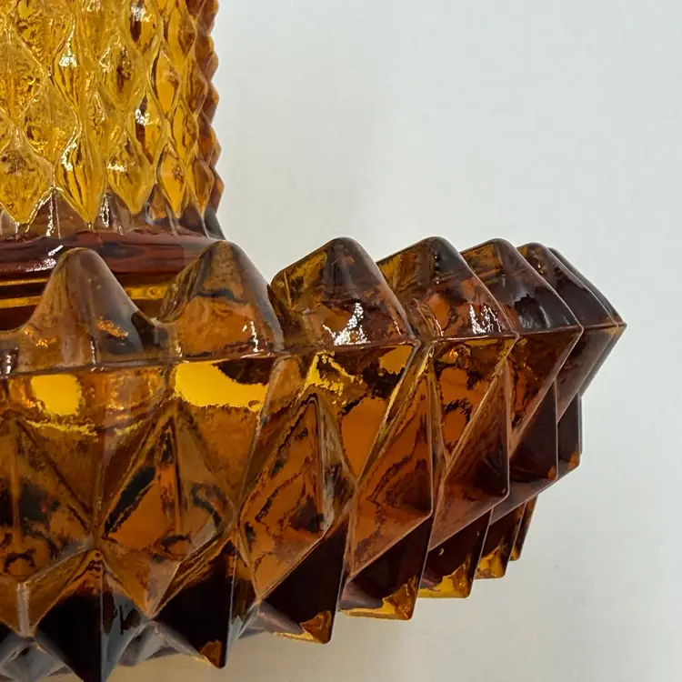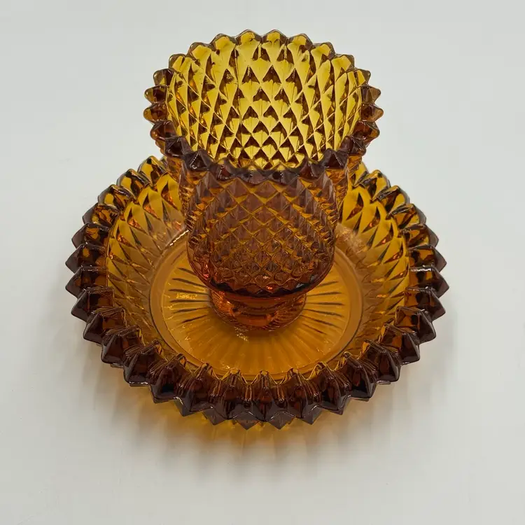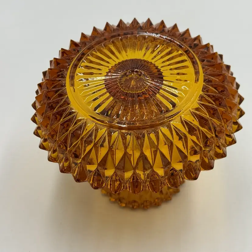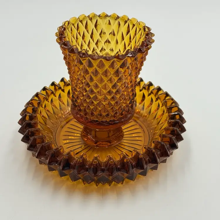Add a touch of vintage elegance to your home decor with this beautiful candle holder from Indiana Glass. The Amber Diamond Point design adds a classic and timeless look to any room. Measures approximately 4 inches tall and 5 1/4 inches in diameter. Condition is used but in good condition. Does not have any chips or cracks.