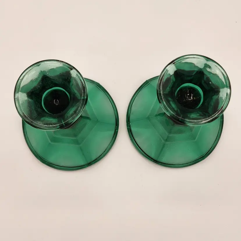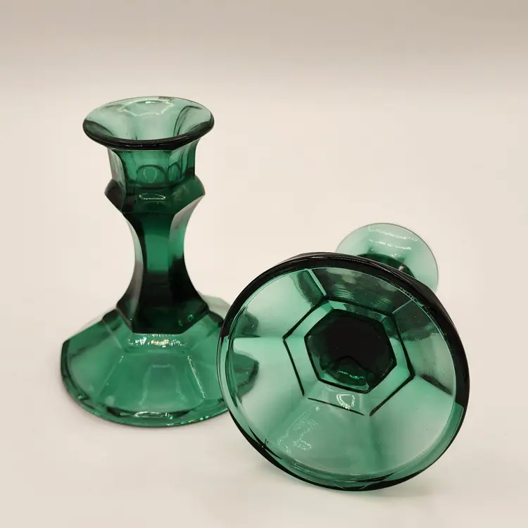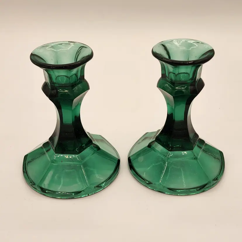 Indiana Glass Teal Green Glass Taper Candlesticks – for the pair. Excellent used condition. No chips or cracks. Color matches the teal green goblets in my listings on NikNax