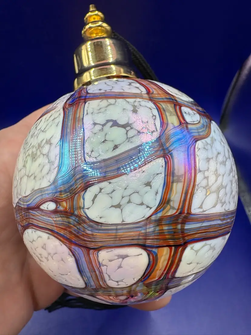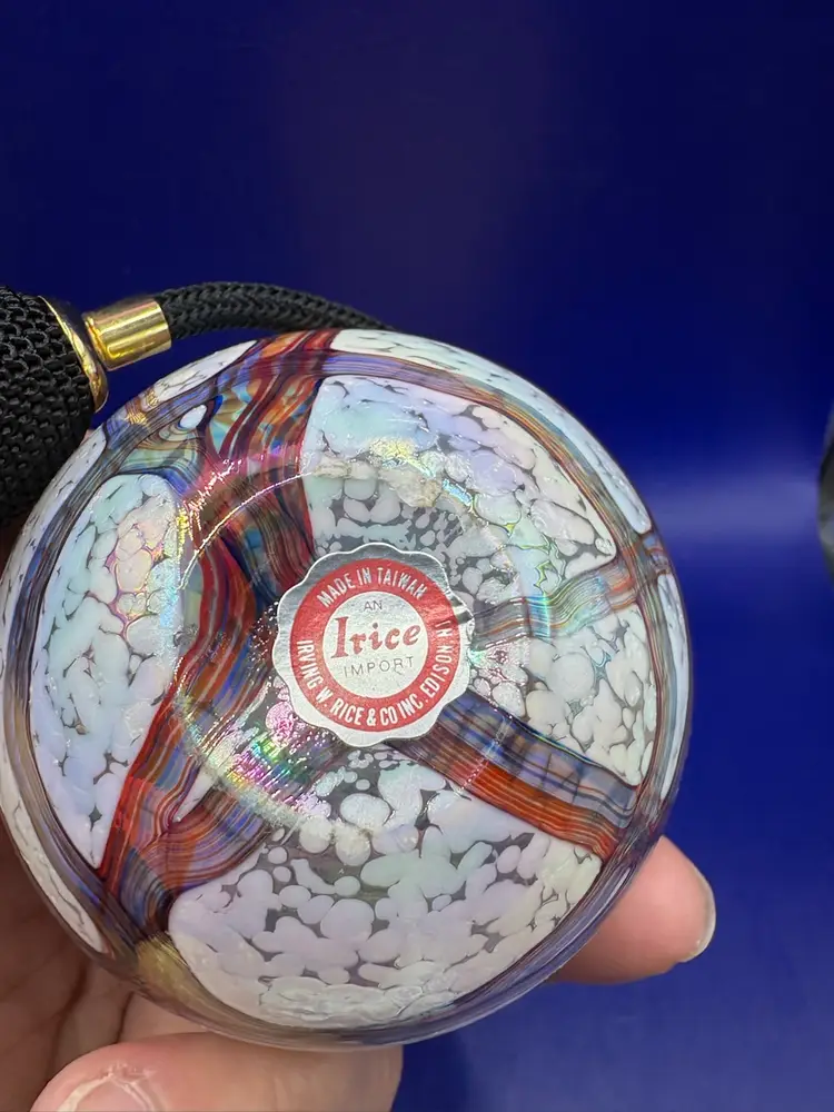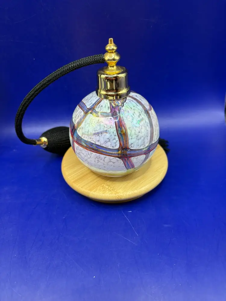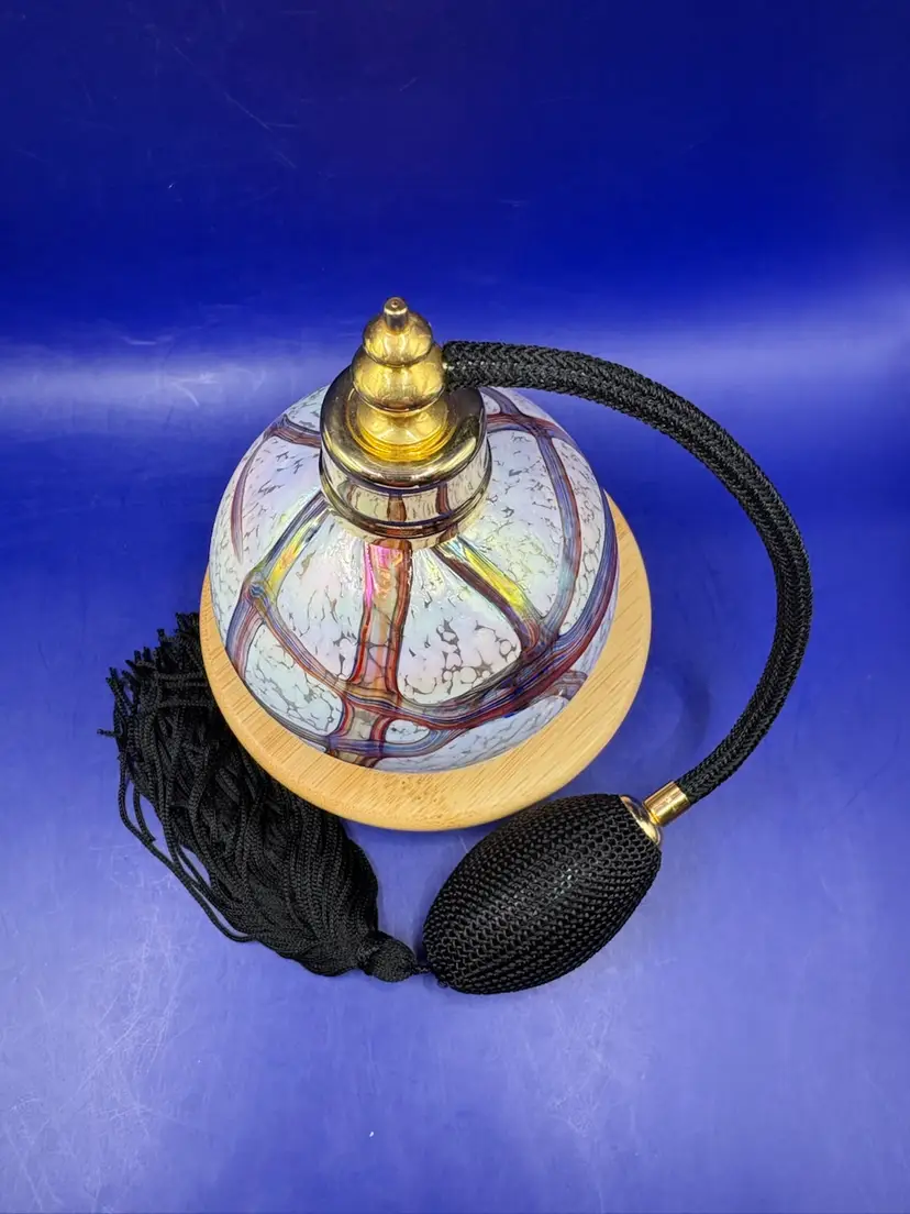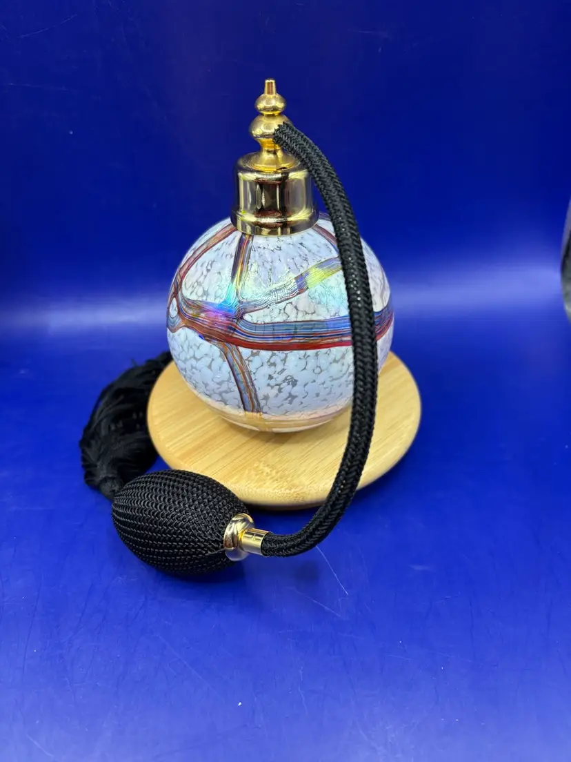 Irice perfume bottle with fringed atomizer Iridescent design Trial height is 4 1/2 inches, bottle itself is 3 inches and width 3 1/8 inches In excellent condition