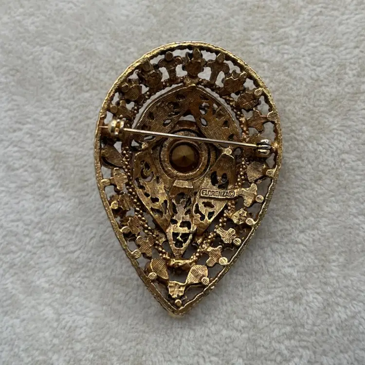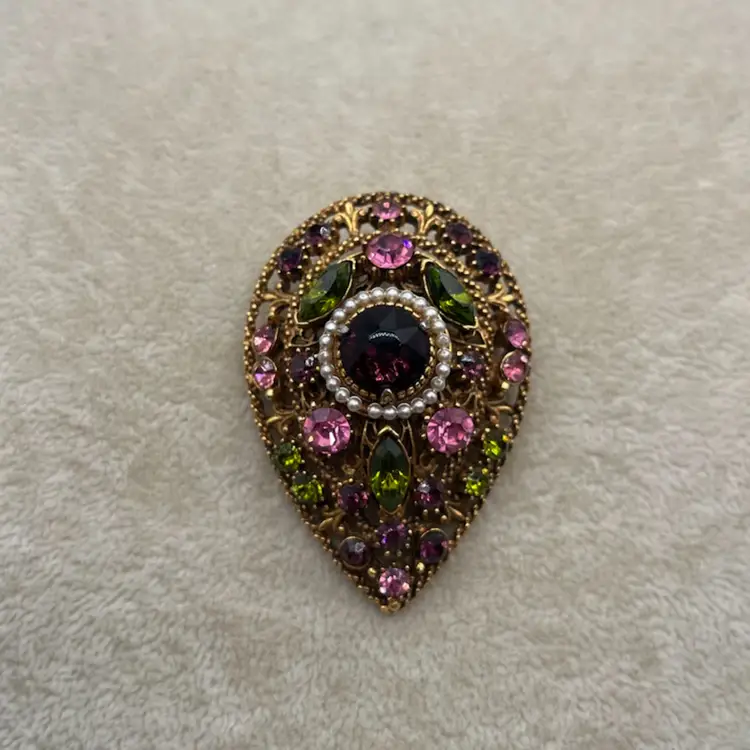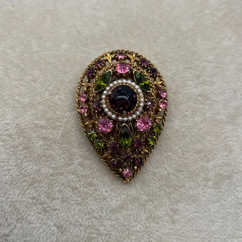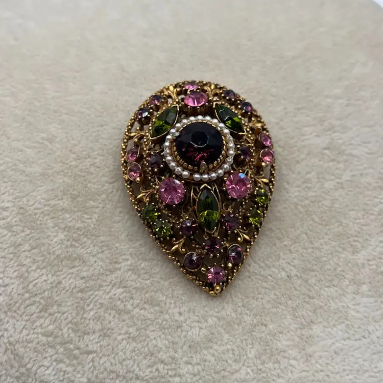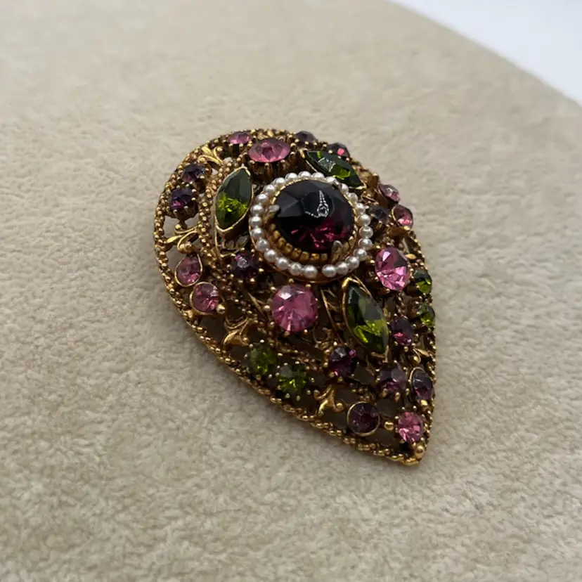 I personally replaced one of the large green crystals that was missing by sourcing the exact vintage green color Swarovski crystal and carefully and precisely gluing it in just as the others are crafted.