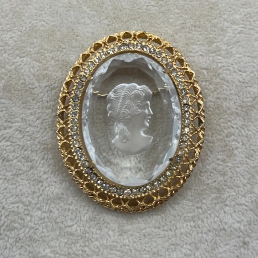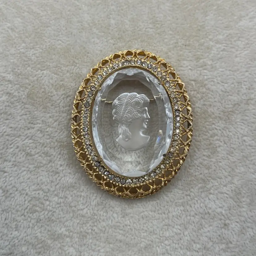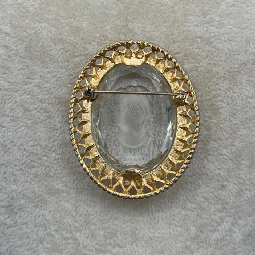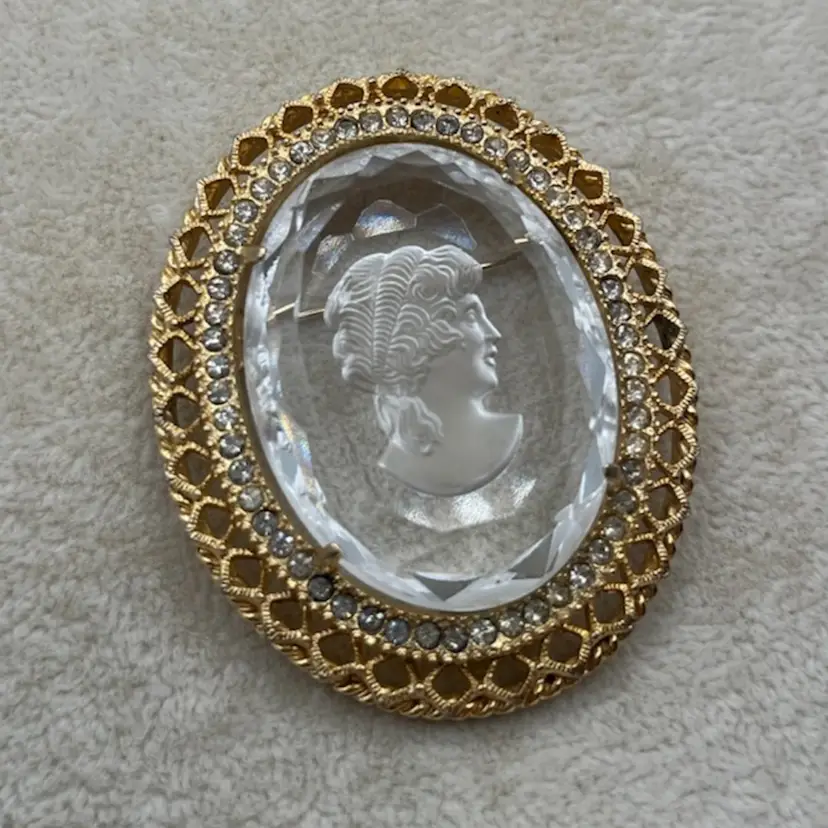 #J24 - Vintage Intaglio Glass Faceted Clear, Gold Tone Portrait Woman Brooch Pin