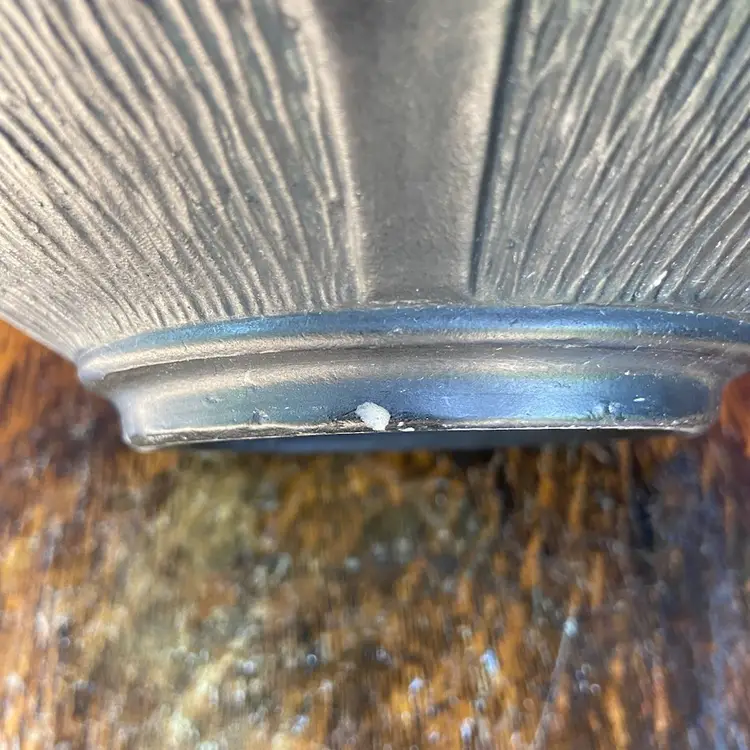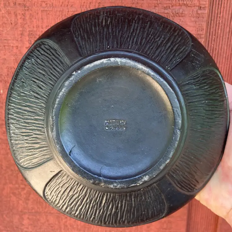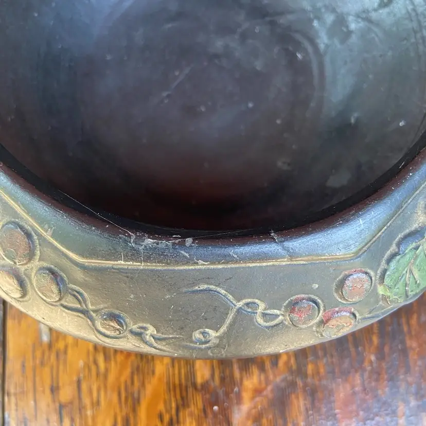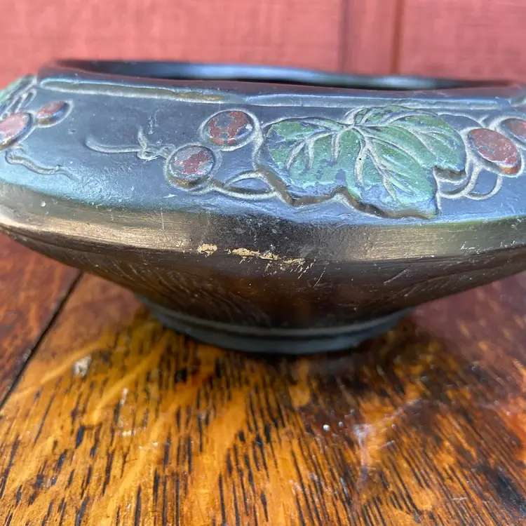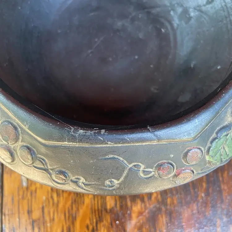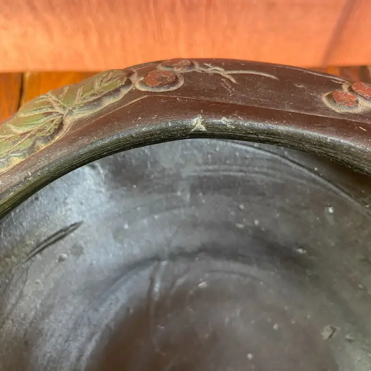 Approx 7”w (opening 4 13/16”) x 2.75”h. Preowned condition. No cracks. Could potentially be Tokanabe pottery and a bowl to hold a flower frog. Please see images for condition - faded paint / glaze, scratches, chip along bottom edge.