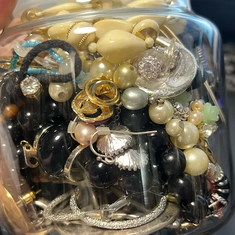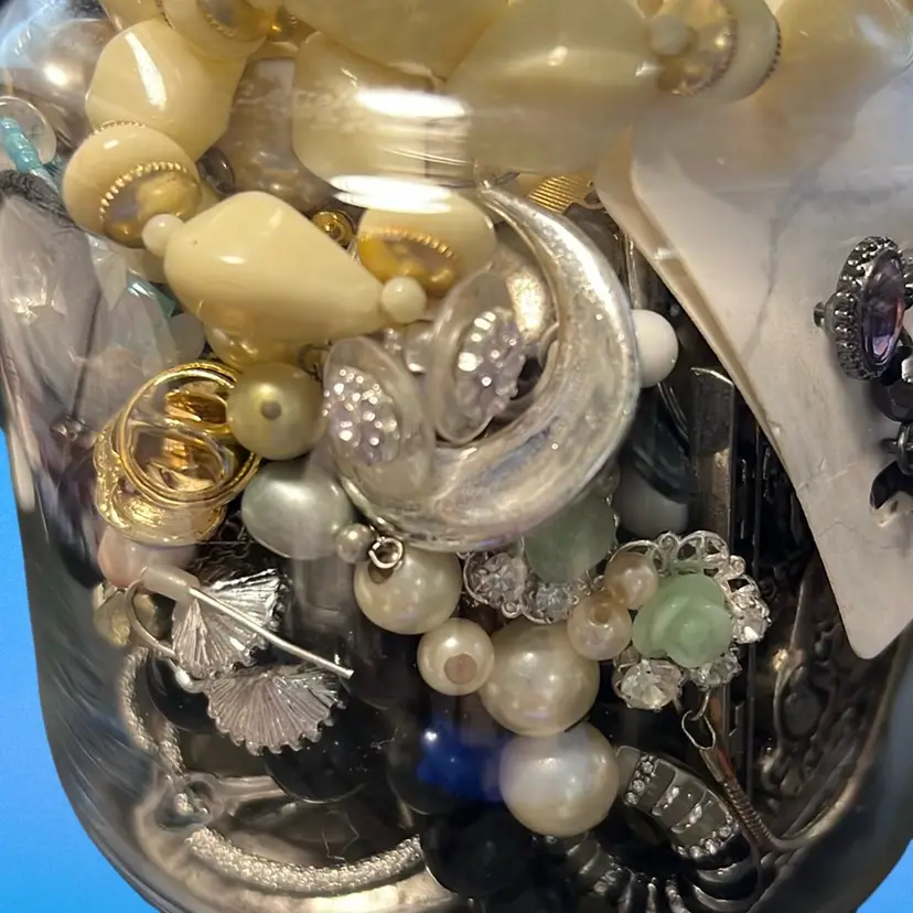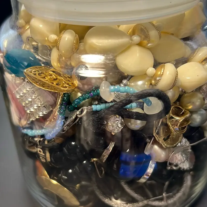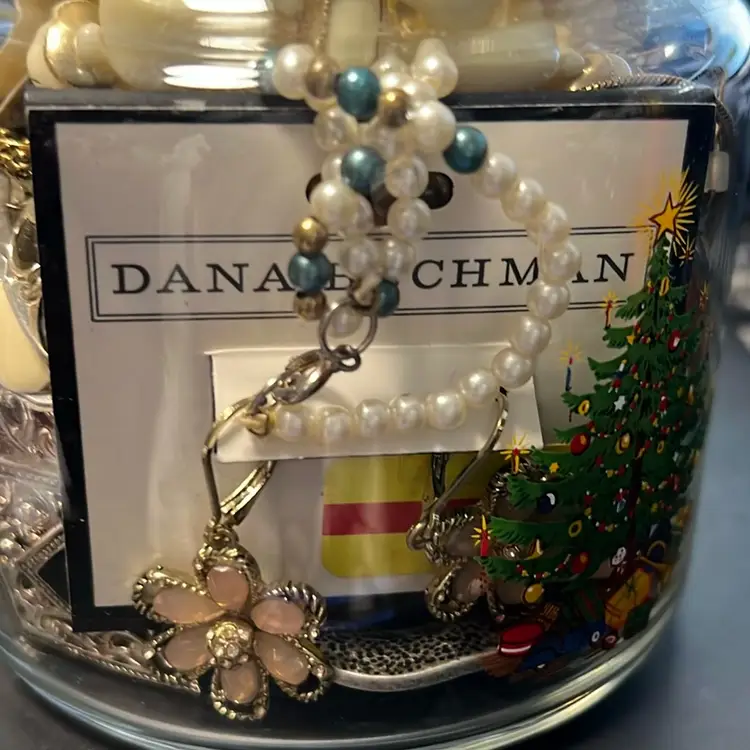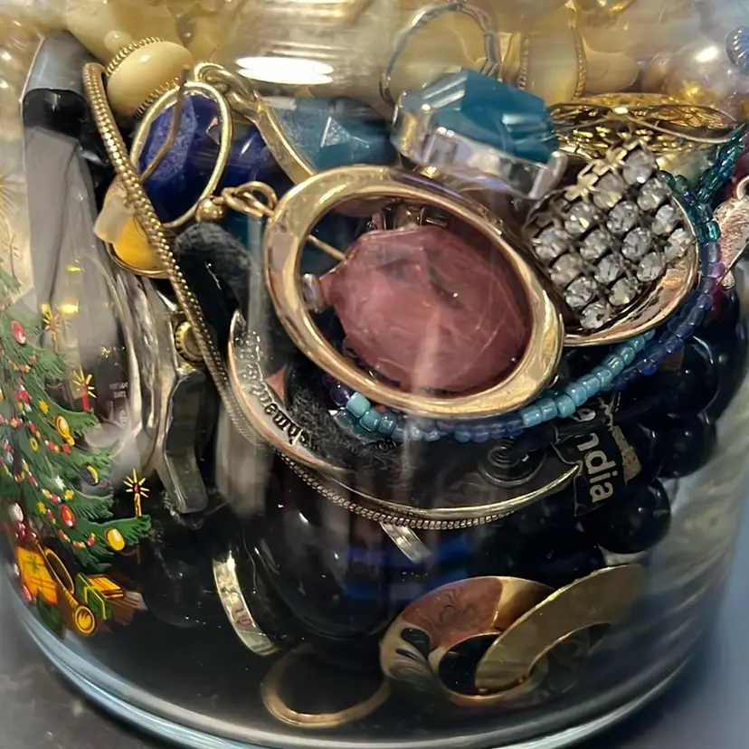 Jewelry Jar, Christmas Candy Jar Filled With Vintage And Modern Wearable Jewelry. Earrings, Bracelets, Necklaces, Pins, Some Brand New With Tags , 1.12 Pounds. Great Christmas Gifting Pieces