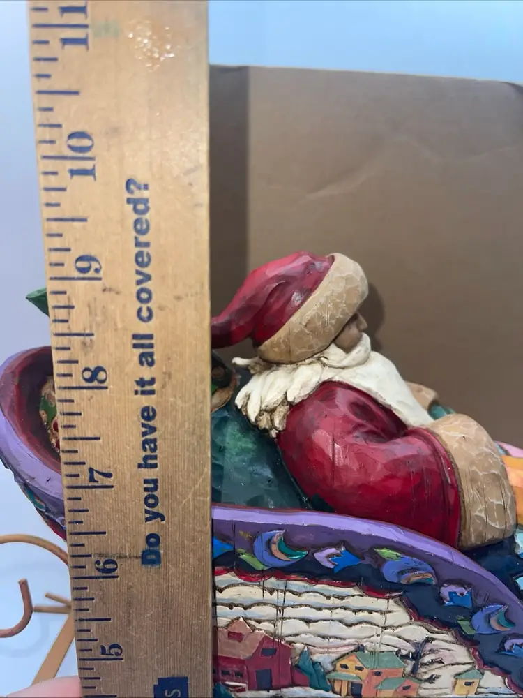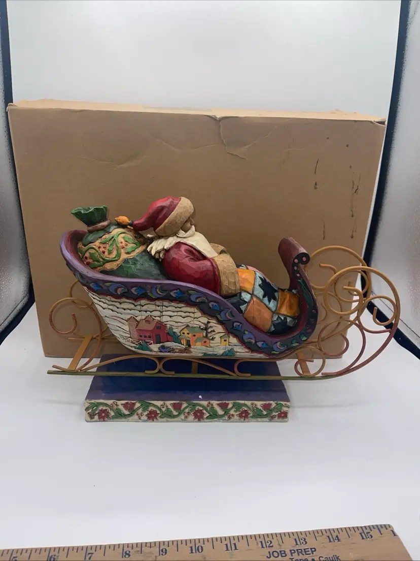 This comes an original box it’s titled delivering Joy item number 117719T from 2004. It’s Santa and a sleigh it measures approximately 14 inches long in about 9 1/2 inches high. Please see all photos ask any questions you may have there is no damage noted. I’m also listening one of the dashing reindeer with a green blanket.
