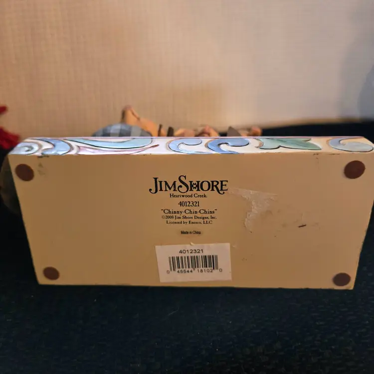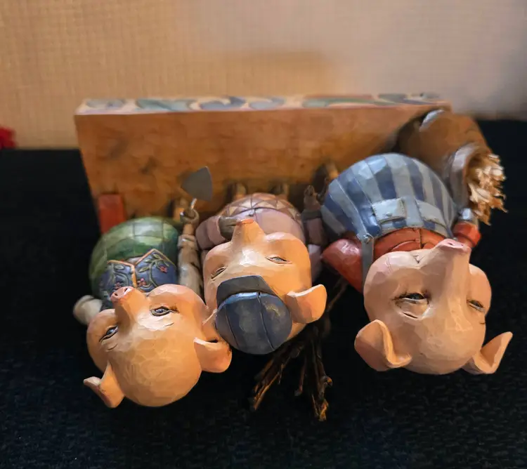 Three little pigs Figurine created by Jim Shore. Item # 4012321 is a retired piece from 2008. Part of the Heartwood Creek collection. Features intricate quilt patterns and design motifs inspired by European and American folk art. Three little pigs standing on a decorative base. Stands 5 1/2" tall, 7 1/4" wide and 3" deep. In perfect condition. No box. Great item for Jim Shore collectors