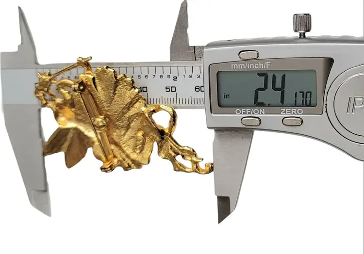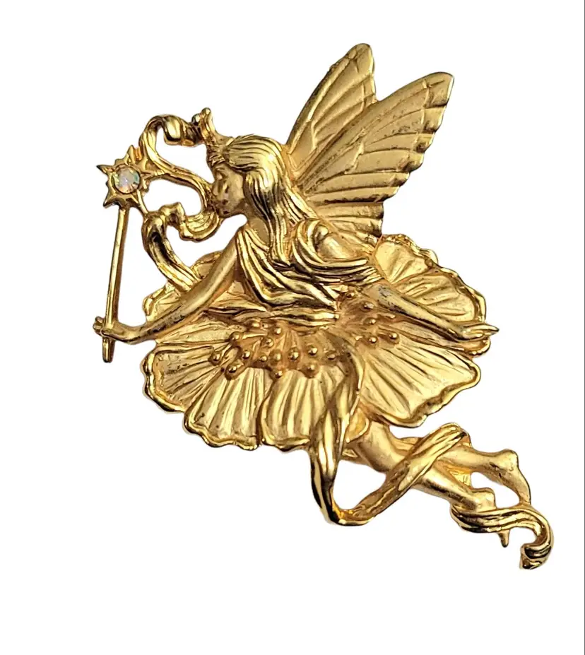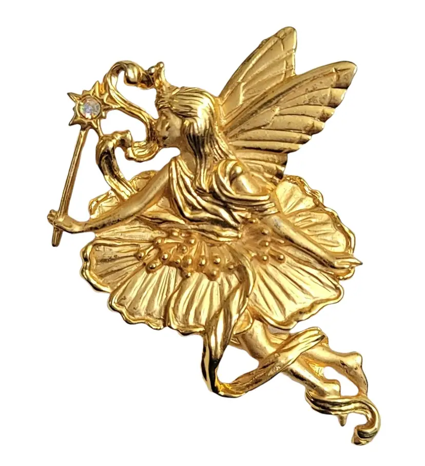 JJ jewelry has been widely collected over the course of the company’s production. This Fairy Brooch features a magical fairy-winged ballerina waving a wand with a star on the end, centered with an Aurora Borealis crystal. Marked ©JJ on an oval cartouche at the back. Measure approximately 2.4-inches. The pin functions properly and is in good vintage condition. Truly, will make a great addition to your collection