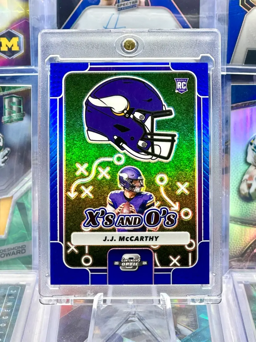 J.J. JJ McCarthy Mcarthy 2024 Panini Contenders Optic Rookie RC X’s and O’s Blue Prizm Serial Number Numbered #’d #’d /99 Holo Silver SP Short Print Insert Parallel University of Michigan Wolverines Minnesota Vikings NFL Football Card