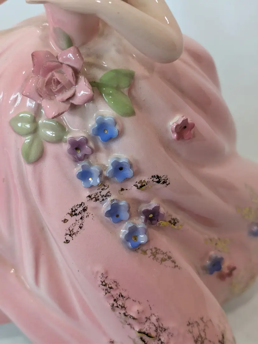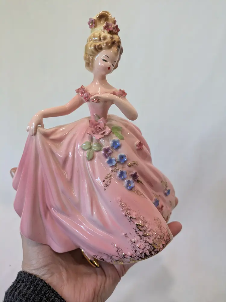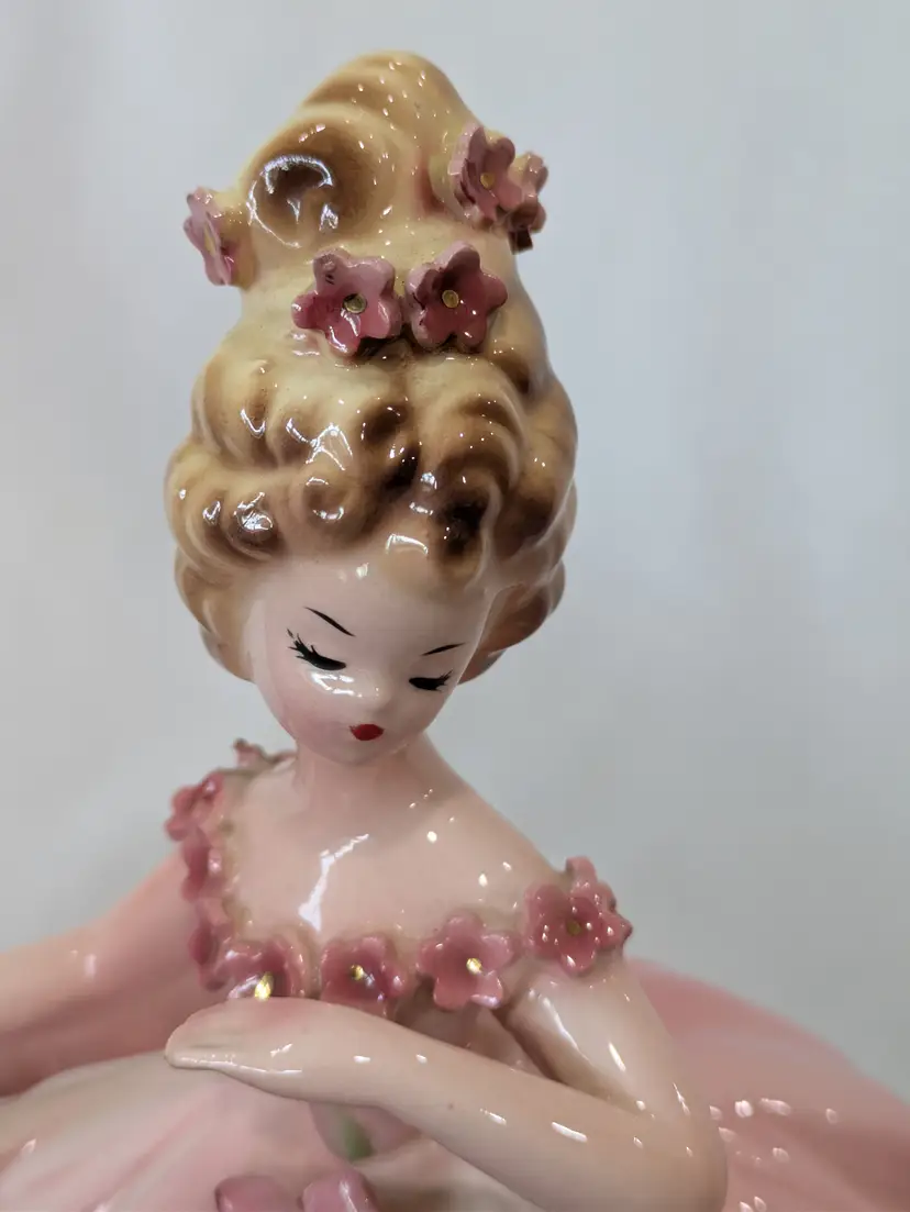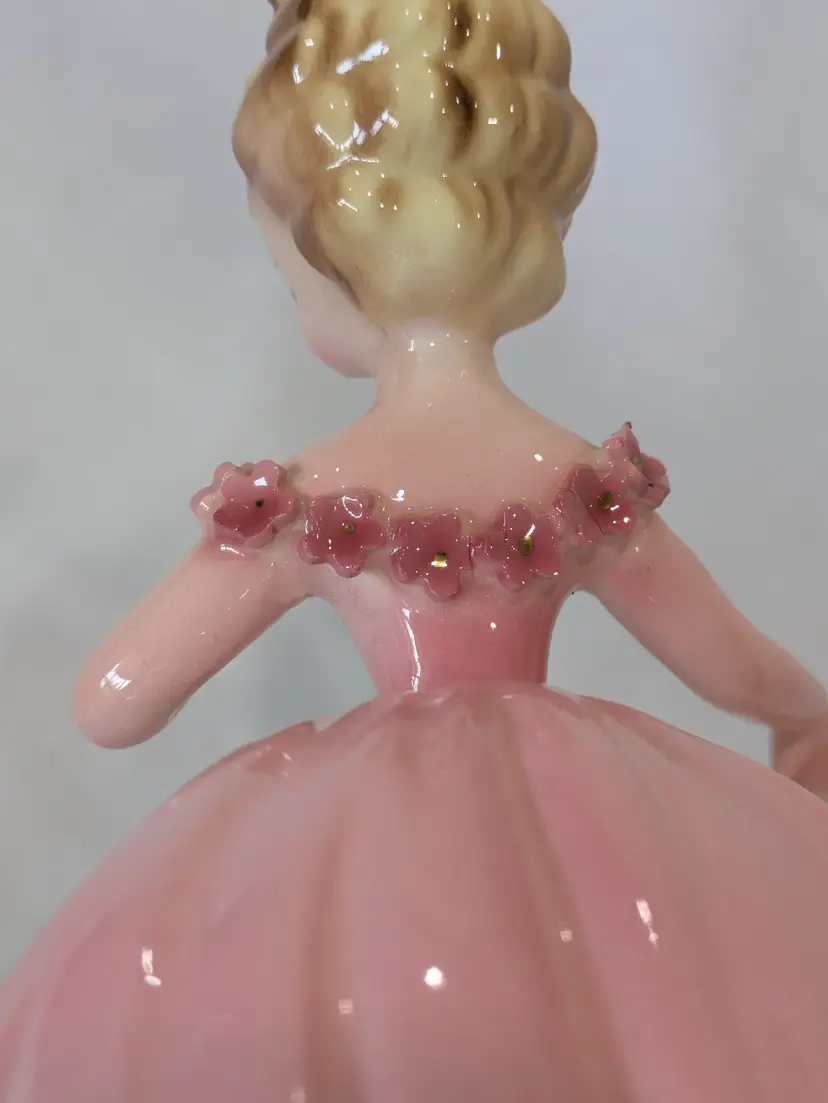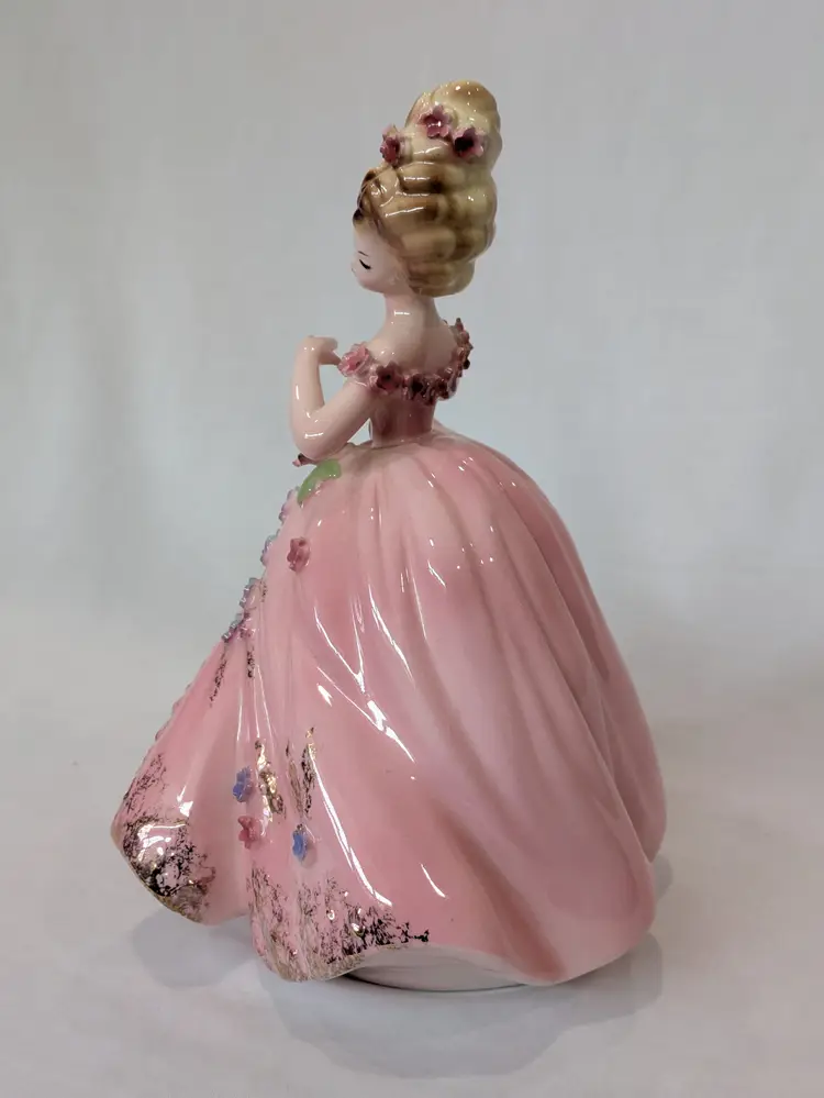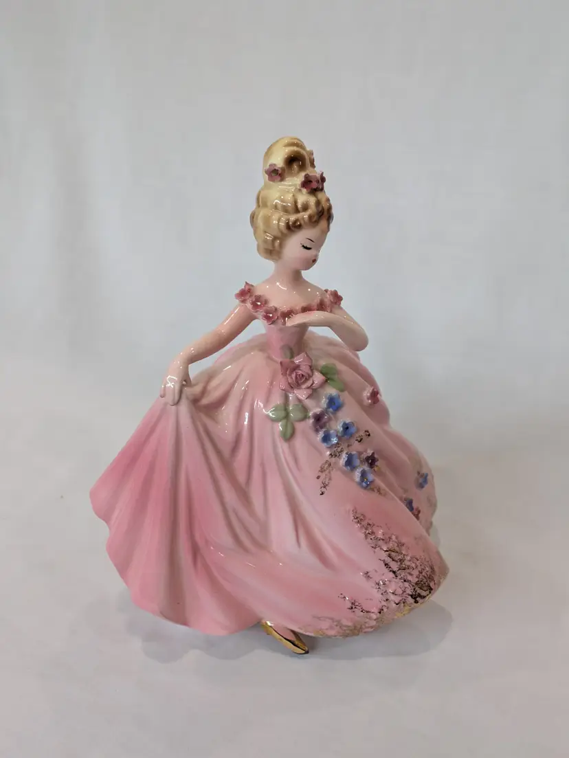 Up for consideration is this beautiful Josef Originals Porcelain Doll figurine from the Japan era 1962-1982 Sweet Sixteen collection. This is the lovely "Party Dress Girl" featuring a gorgeous pink ball gown with lots of gold detail and multicolor flowers. Fantastic movement to this piece- she is poised to dance the night away! She is in flawless vintage condition with a smooth high gloss finish, no chips cracks or repairs! She has lived her life in a curio cabinet, she has her Josef Original label and is signed on the base. Nice Large size to the figurines in this line, she Measures 7.75" tall. Rare to find especially in flawless condition. Collector fave!
