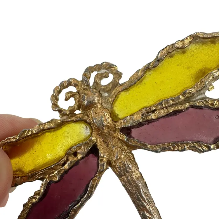 Joy Plique A Jour dragonfly brooch featuring yellow and purple poured resin wings. Metal is worn in some areas. Clasp is a little loose. Measures approximately 3.5” long. Marked “JOY” on back