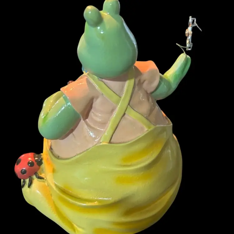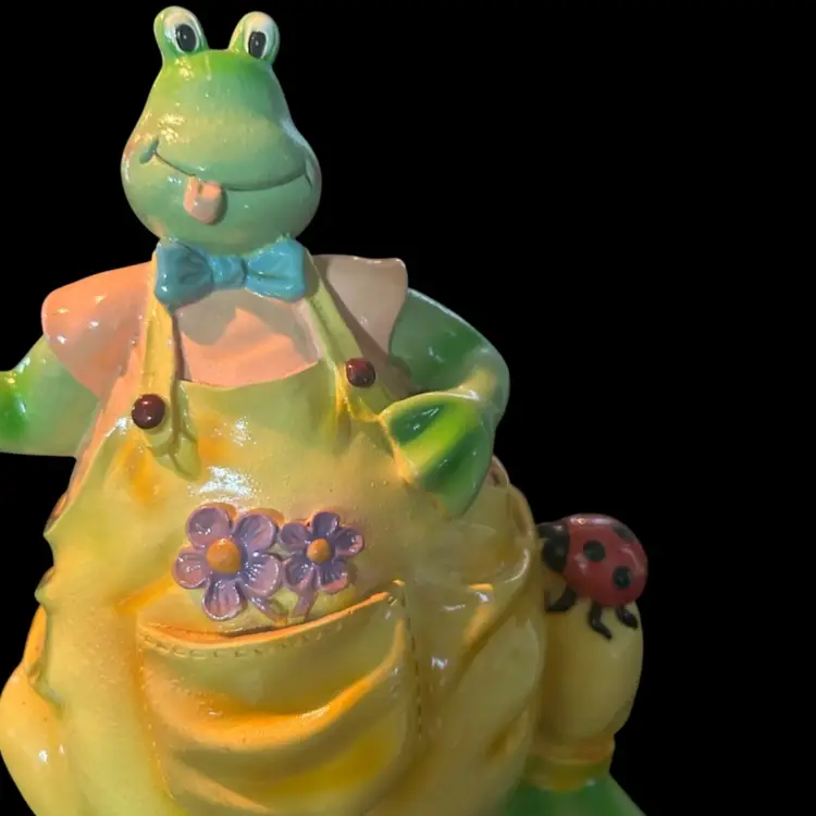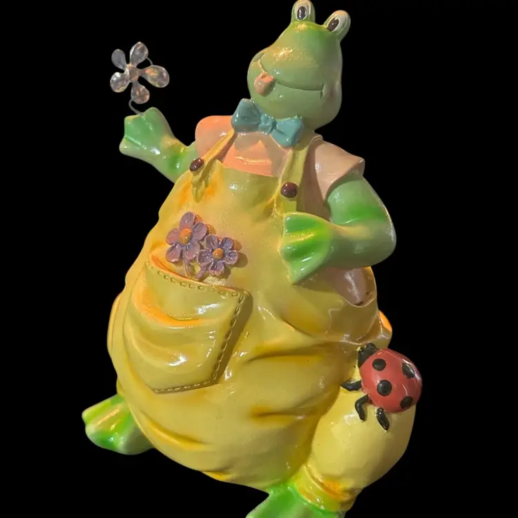 This cutie with his yellow overalls, cute blue bow tie, holding a flower in one hand, flowers in his pocket and lady bug resting on his knee is in mint condition and measures approximately 7” tall and 6 1/2” wide. (BSA1.5)