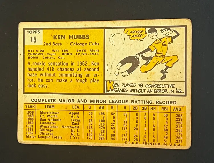 Ken Hubbs 1963 Topps #15 NL Rookie of the Year Chicago Cubs