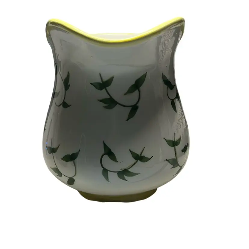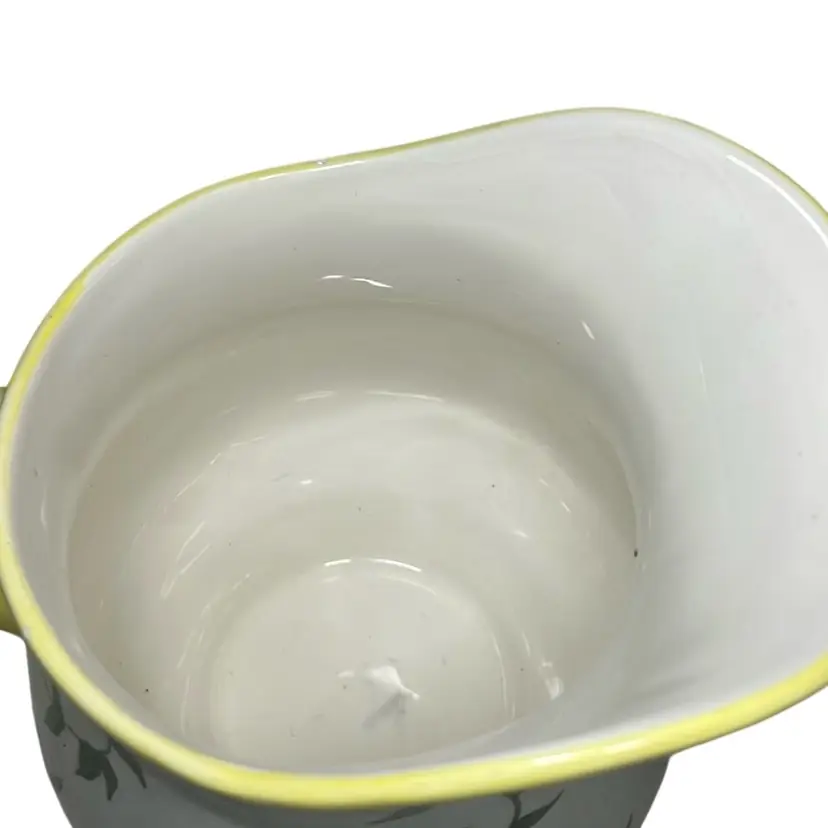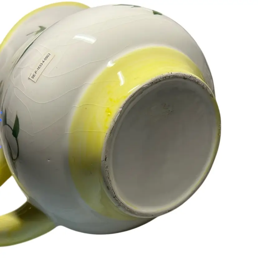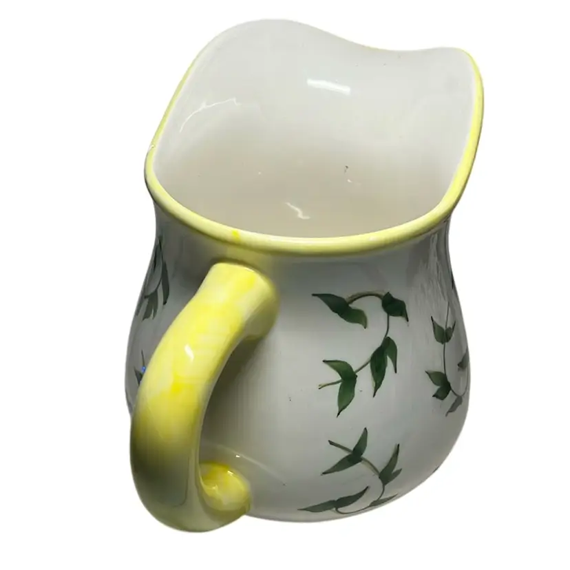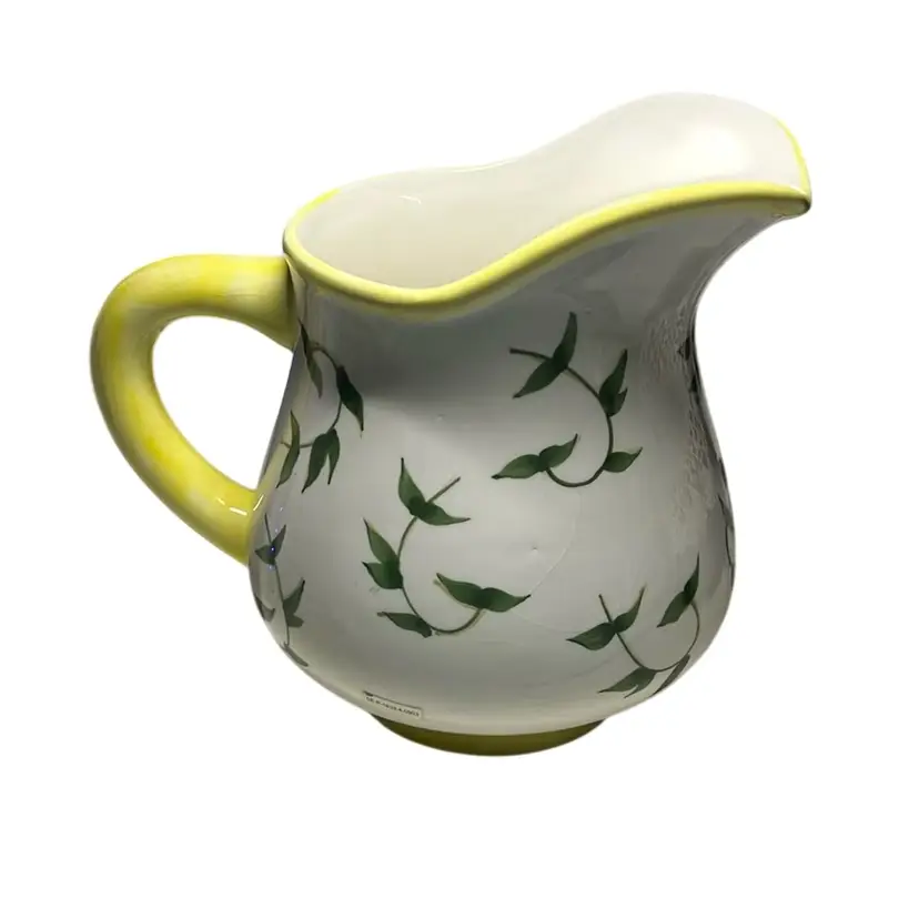 Yellow & white - no makers mark. Featuring green leaves. Pitcher has crazing and one tiny glaze chip on rim Measures 8” tall & 9” wide