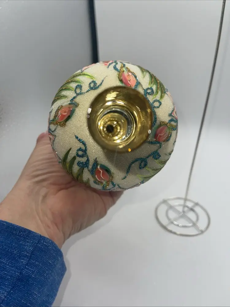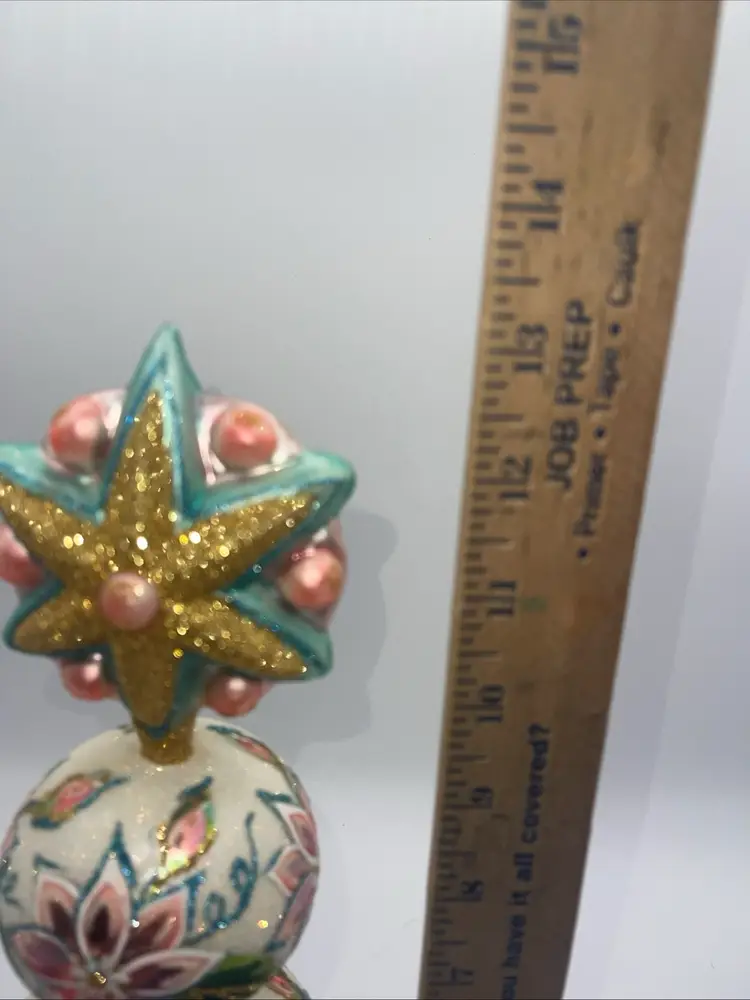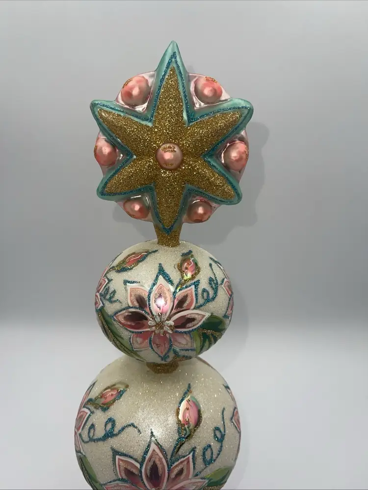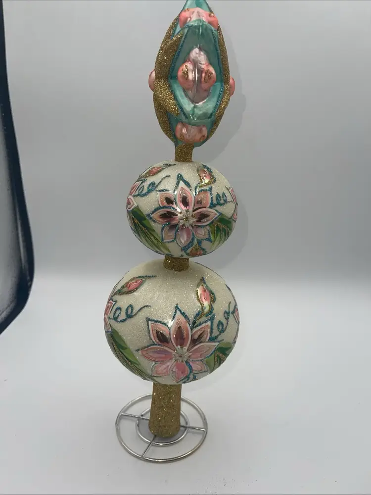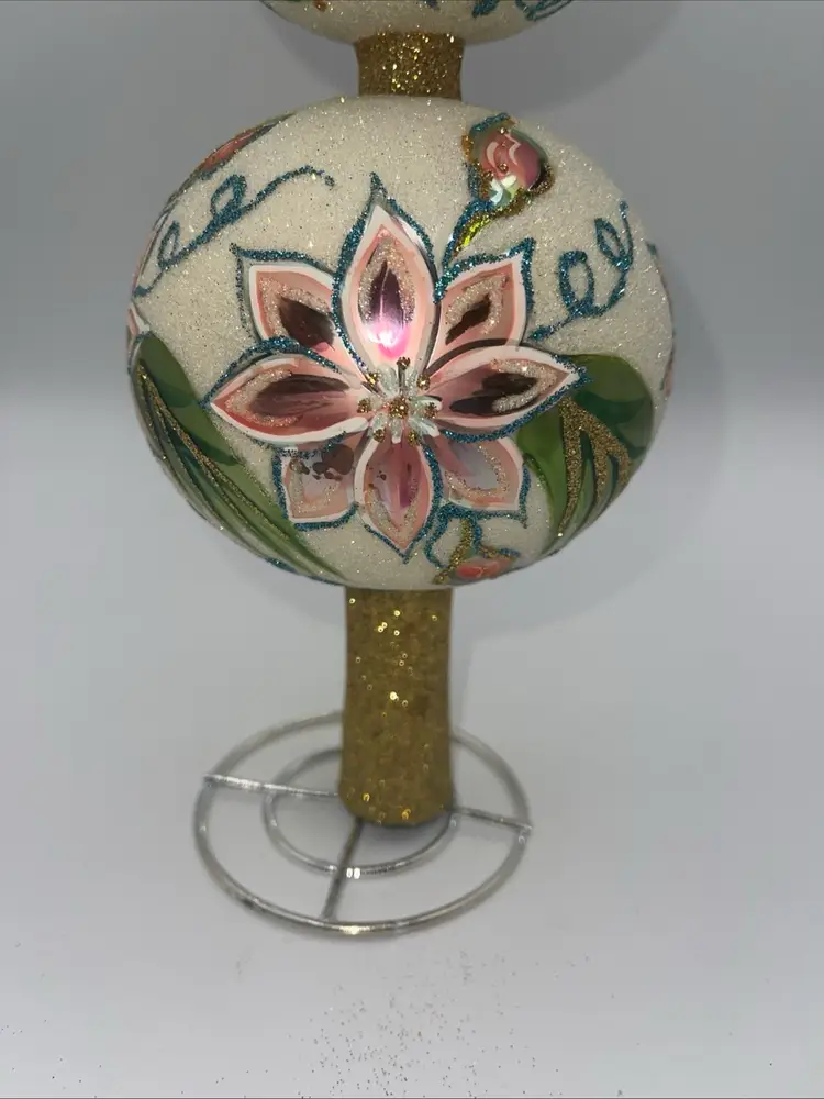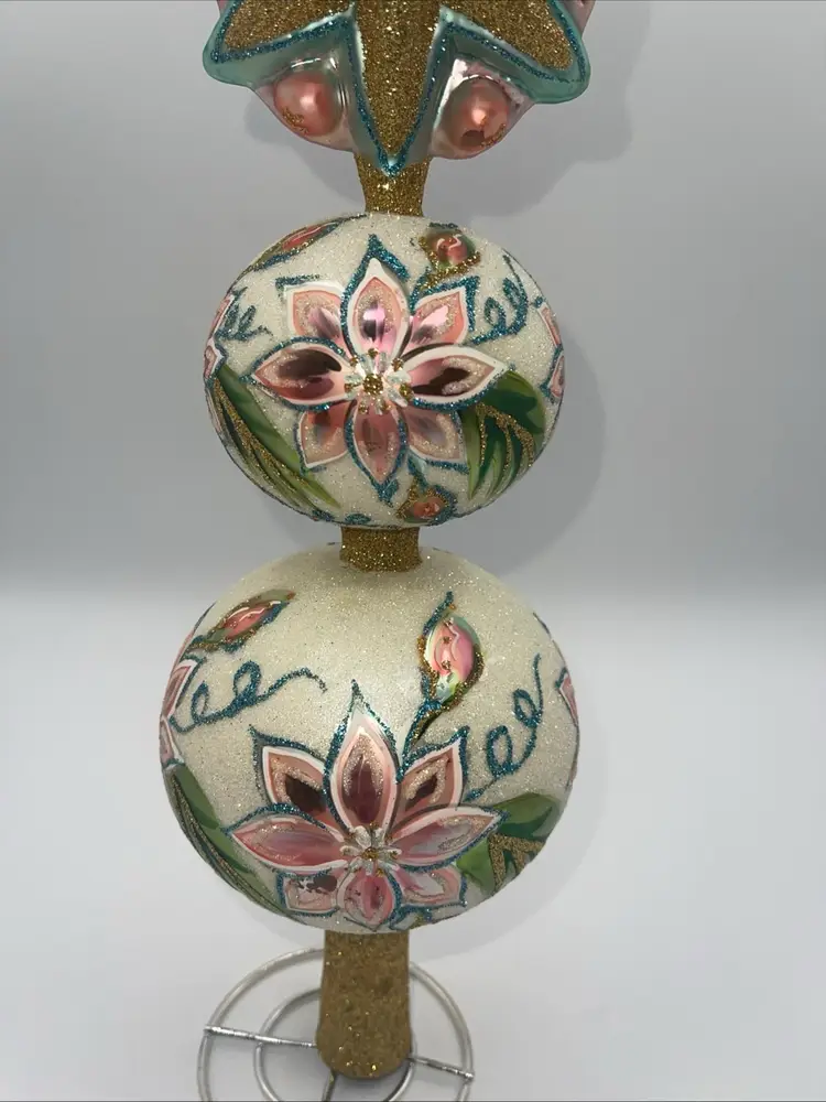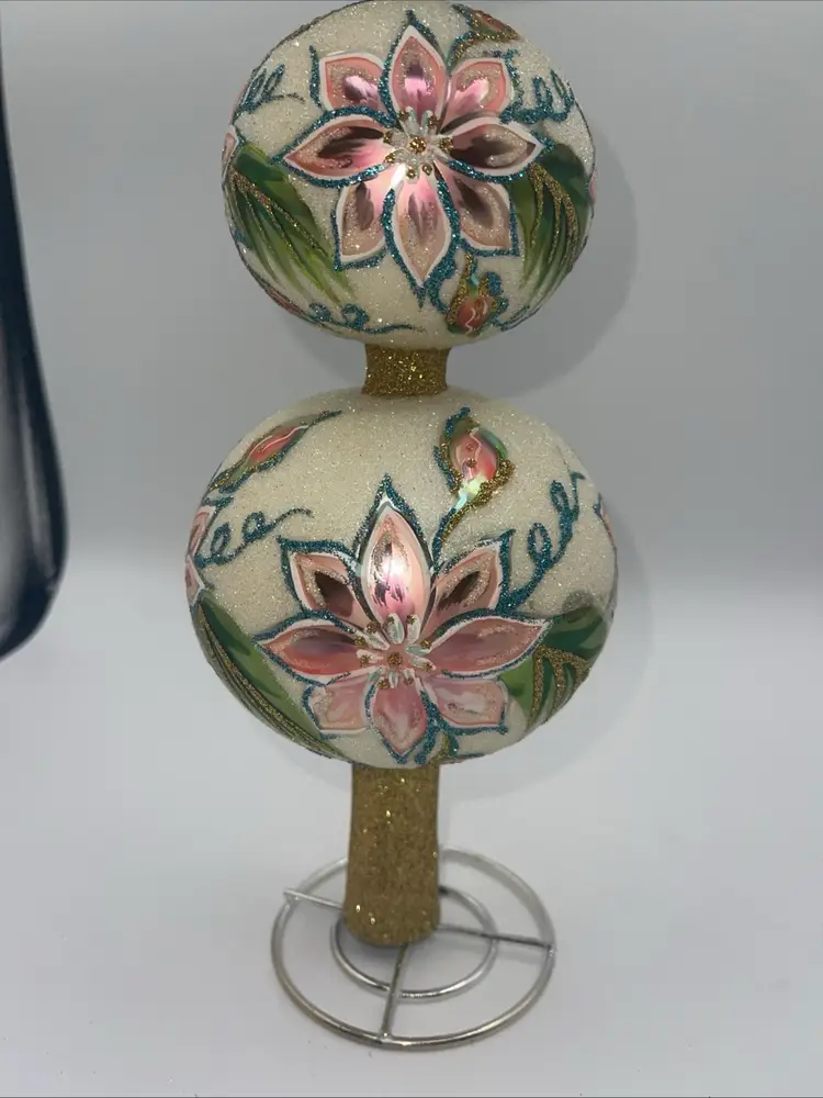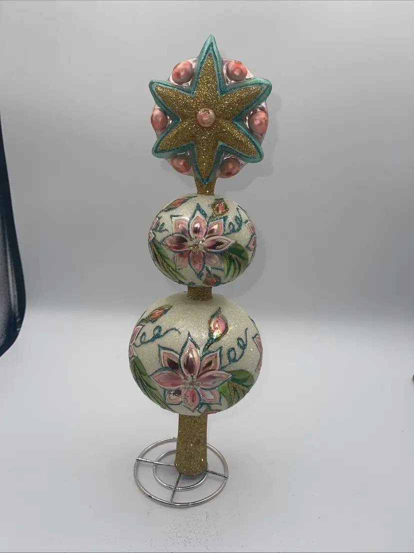 This is a beautiful FINIAL it has pink poinsettias on each of the balls. I’ve taken pictures all the way around so you can see lots of glitter, and on the top is a star with glitter the colors are pink white blue green there are no chips or cracks. It is in good used condition. Please ask any questions you may have. It’s 13 inches tall thank you for looking.
