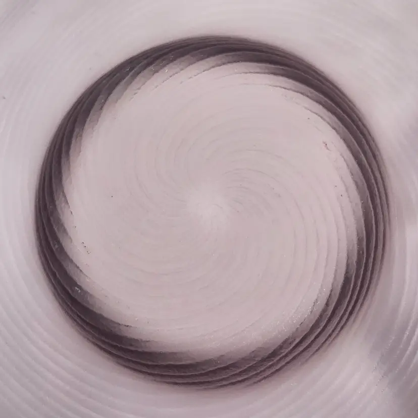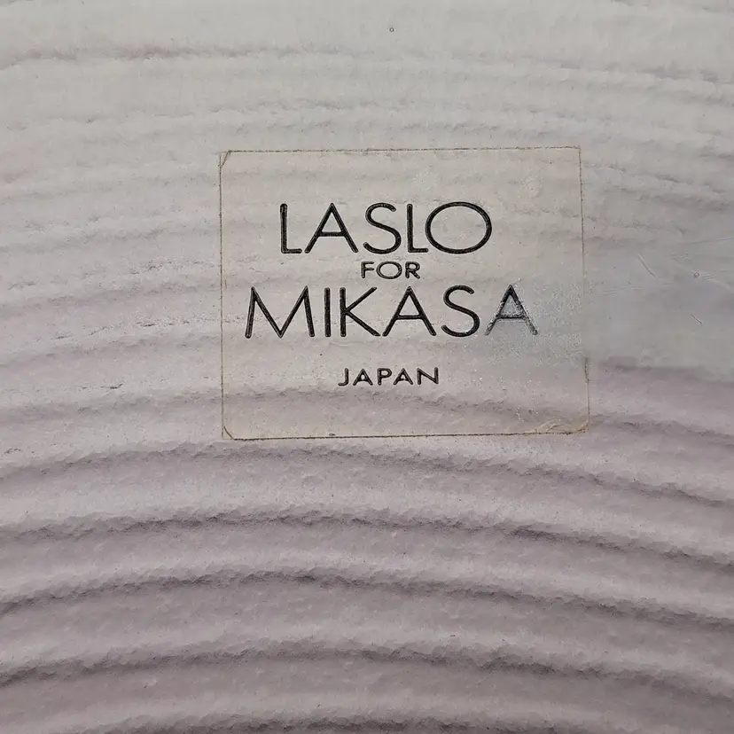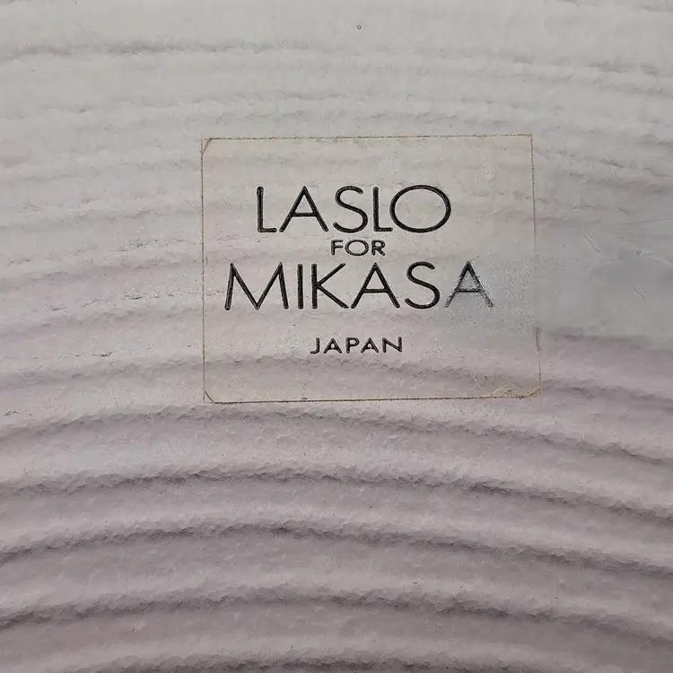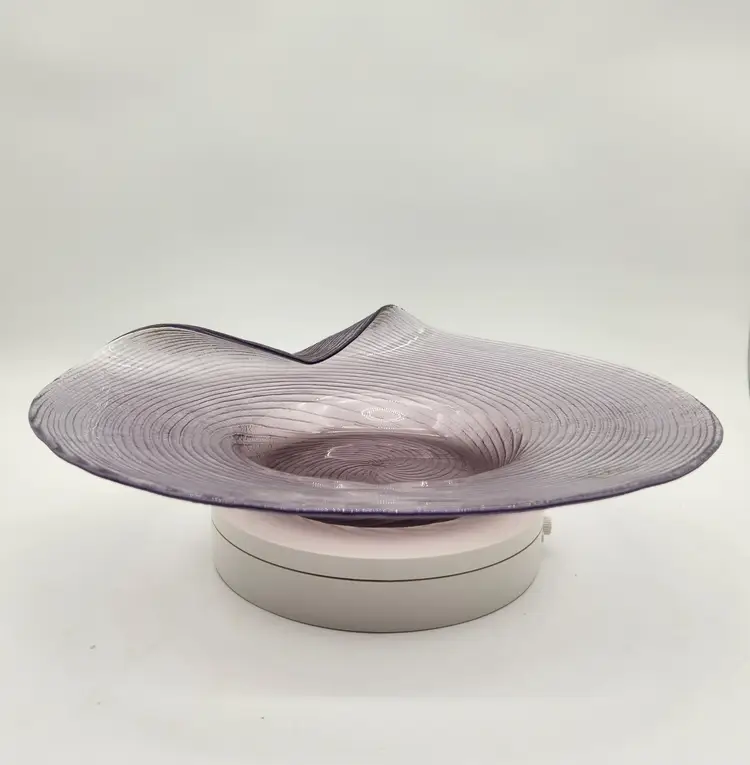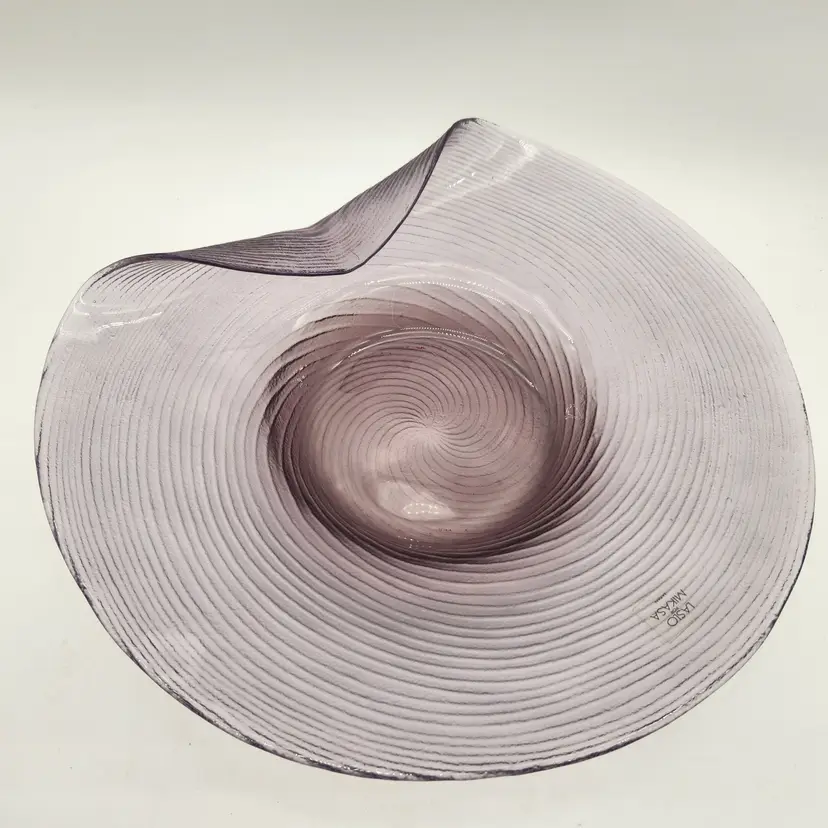 Swirls upon swirls known as "filigrana" give this dramatic piece its shape and its drama. Here Larry Laslo was known for creating distinctive pieces for Mikada in the 1980's. This piece shows his style of blending modern art shapes with traditional elegance. Filigrana is a classic, historic technique that originated with the master glassblowers of Murano in the 16th Century using fine canes or rods of glass that are fused and shaped into various patterns. The process involves pulling, twisting, layering, heating, and finally blowing the canes to encase the designs. Brand New Condition: no chips or cracks. Measurements: 15" in diameter, 12 1/4" in diameter at fold over