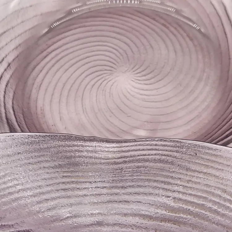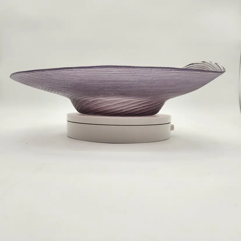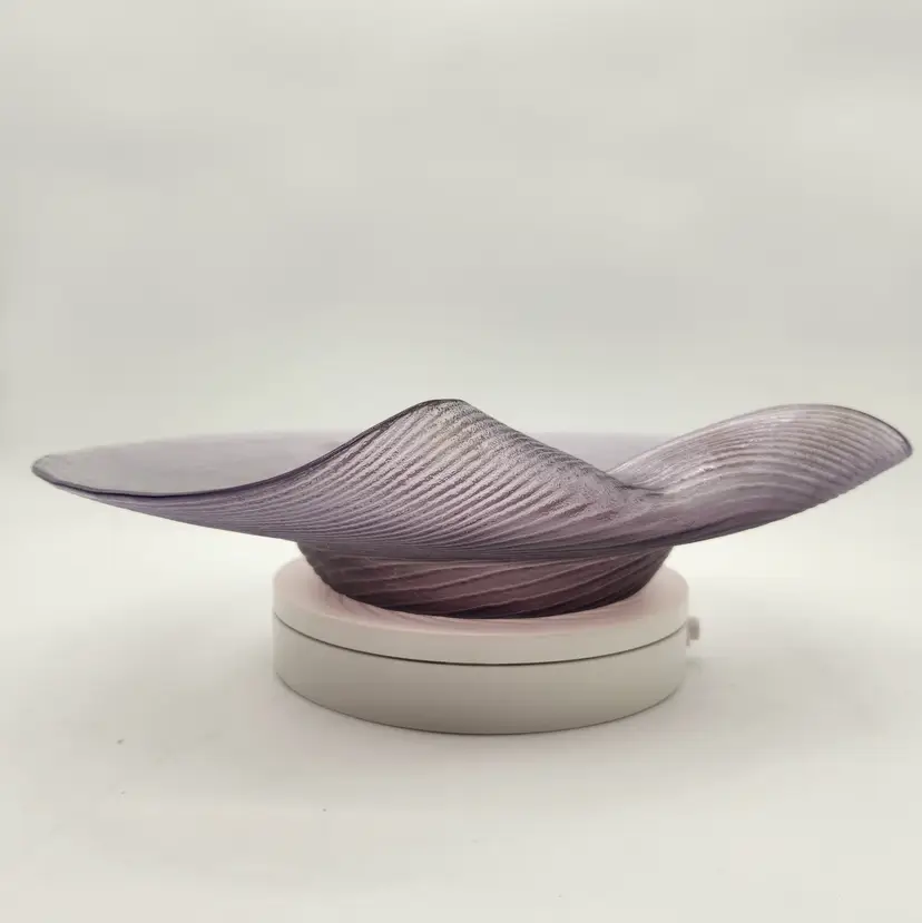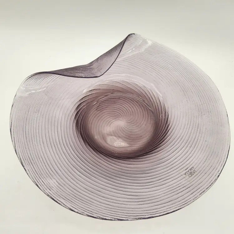 Keywords: glassware, art glass, accent piece, table decor, handmade, swirl pattern, amethyst color, Japanese artistry, decorative bowl, vibrant hue, unique shape, mid century modern