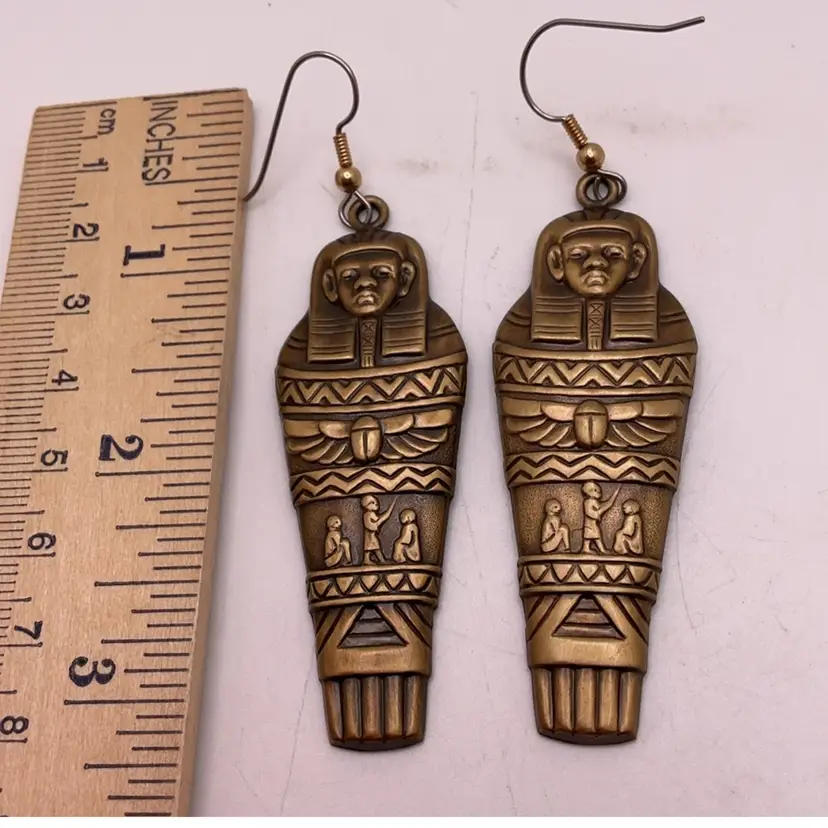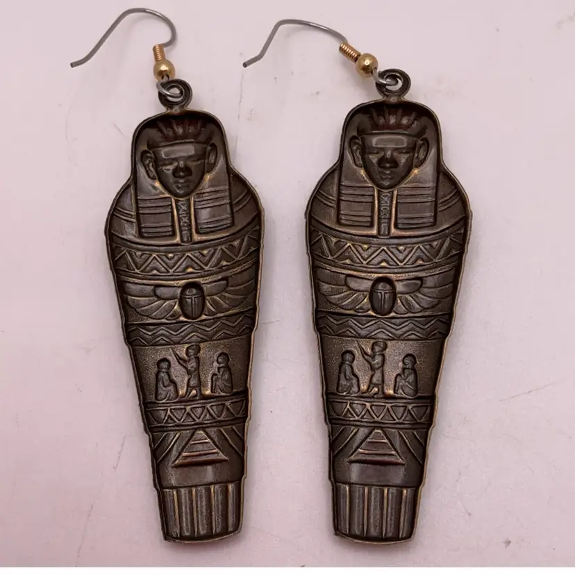 LBB VTG Egyptian Revival Hieroglyphs Mummy Sarcophagus Scarab Earrings Brass Tone 3.25”