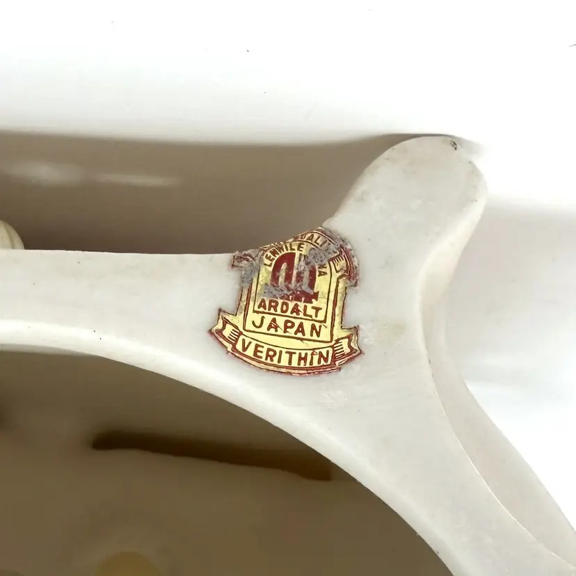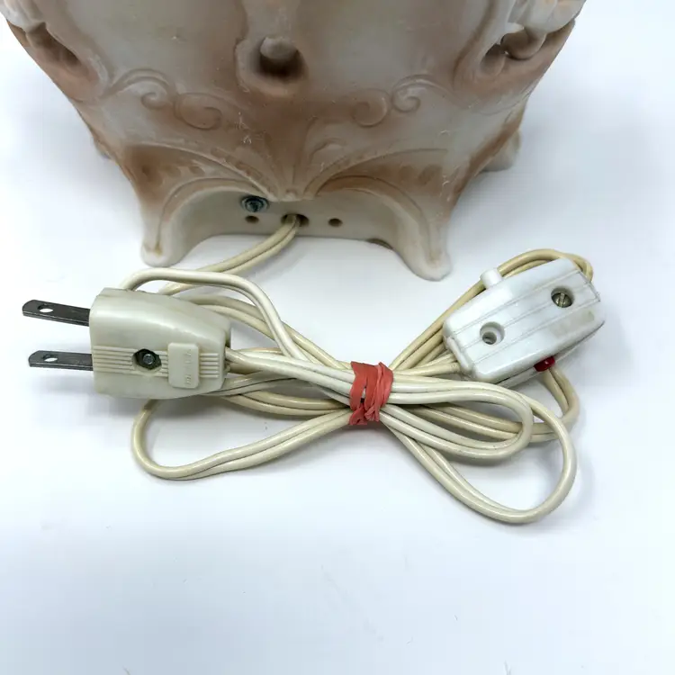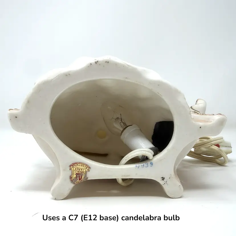 Details: • Maker / Line: Lenwile China, A.A. Ardalt, Verithin (label) • Model / Marking: 7939 (hand/ink-stamped) • Origin: Japan (label) • Era: c1958-1966 • Materials: Bisque porcelain / ceramic body; electrical cord with inline switch • Measurements (approx): 6" H x 6.75" L x 5" W, Weight: 1 lb 3 oz • Color / Finish: Ivory/tan bisque with lilac/lavender accents; green detailing; sculpted floral/scrollwork • Lighting: Tested working (photo shows lit) • Cord/Plug: Original cord and plug present (visible age toning)