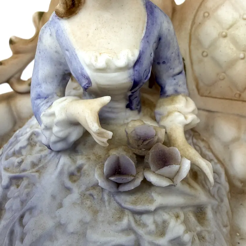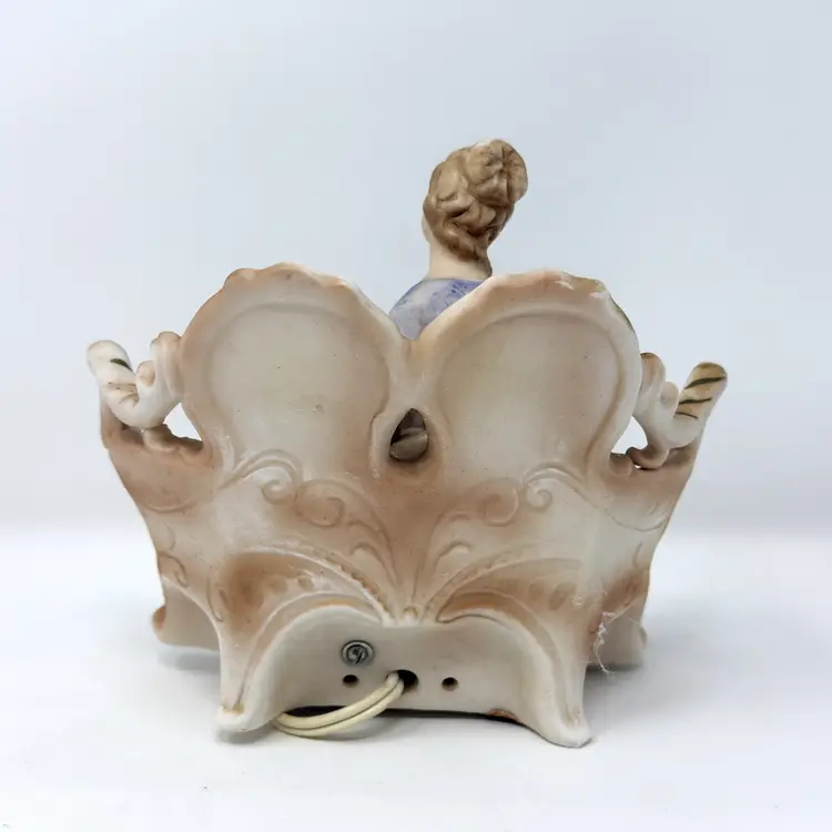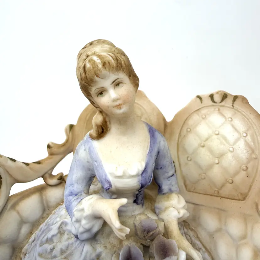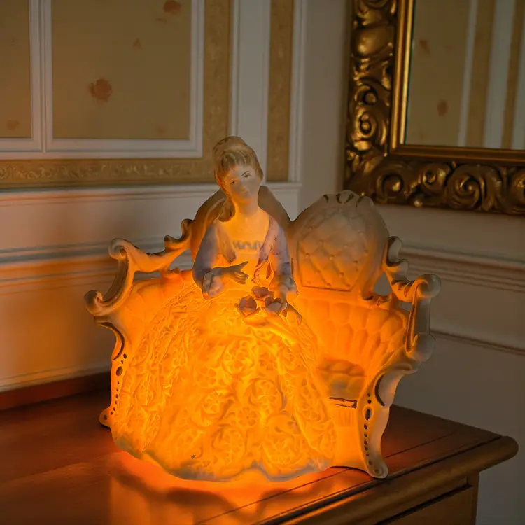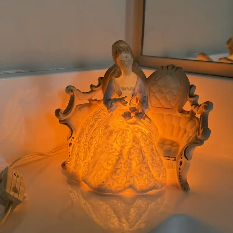 Vintage Lenwile Ardalt ‘Verithin’ lady-on-settee night light—bisque porcelain glow lamp with original cord; soft Victorian charm for cozy bedside décor at home!