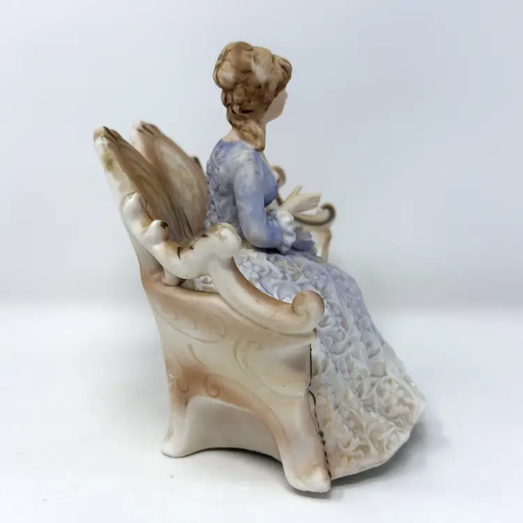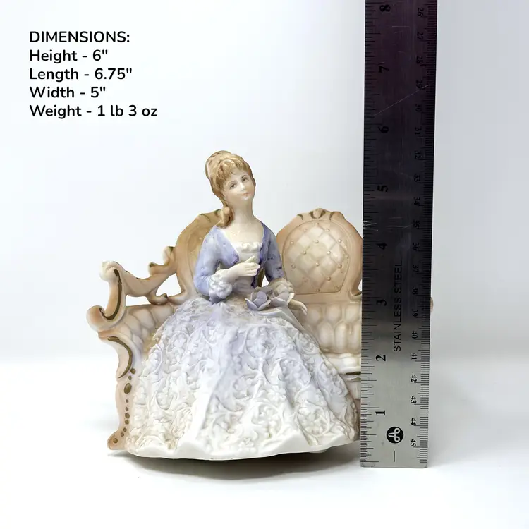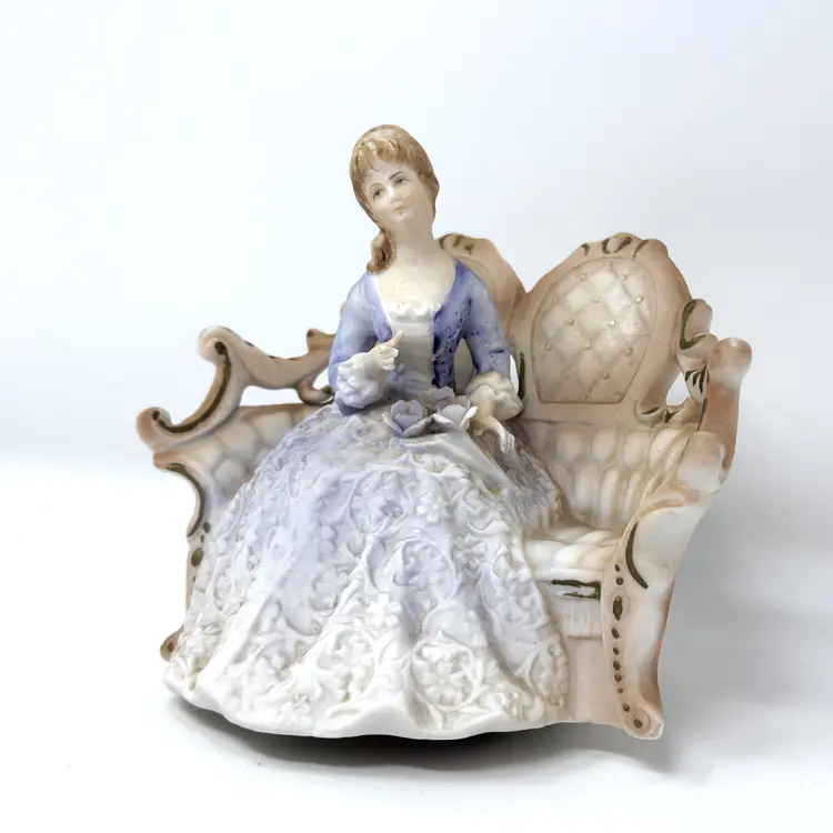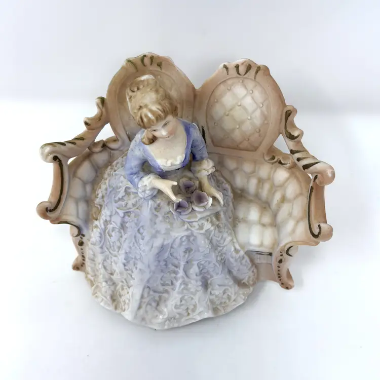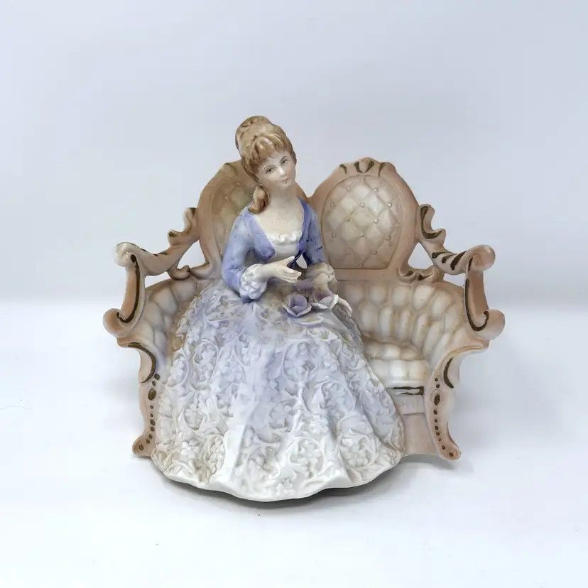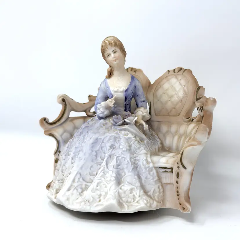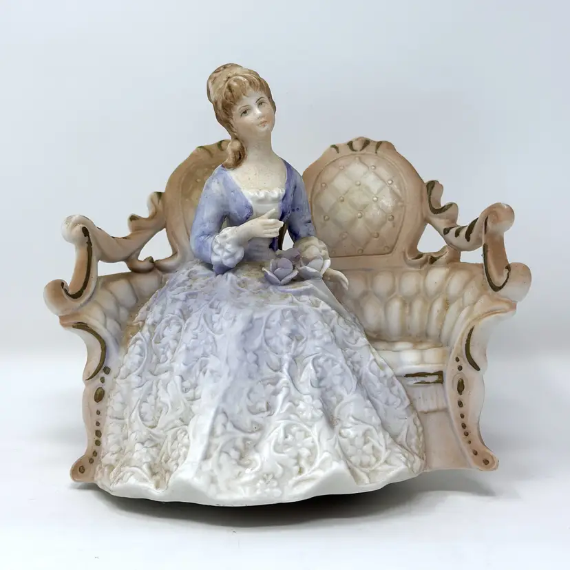 A sweet vintage Lenwile China / A.A. Ardalt figural night light featuring a seated lady on an ornate settee. When lit, the bisque porcelain glows warmly through the lace-like gown relief—perfect for a cozy bedside nook or a romantic shelf vignette. (Comparable examples are commonly identified as Lenwile/Ardalt “Verithin” Japan imports, model 7939.)