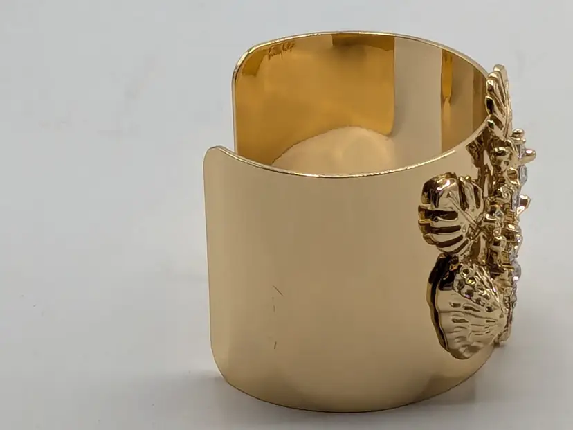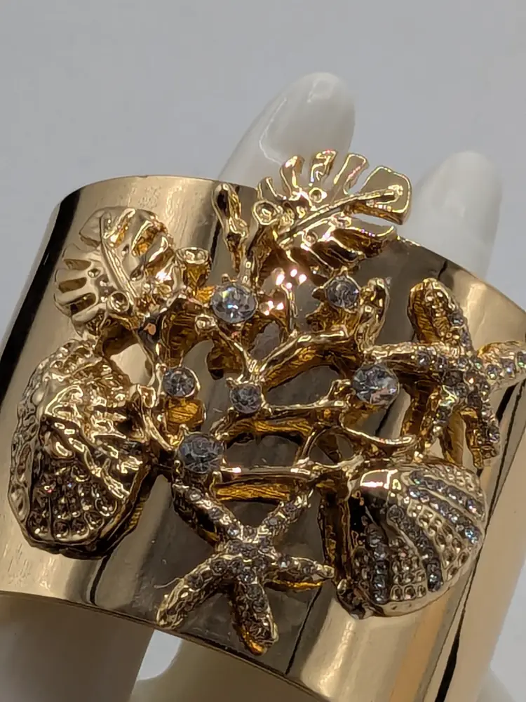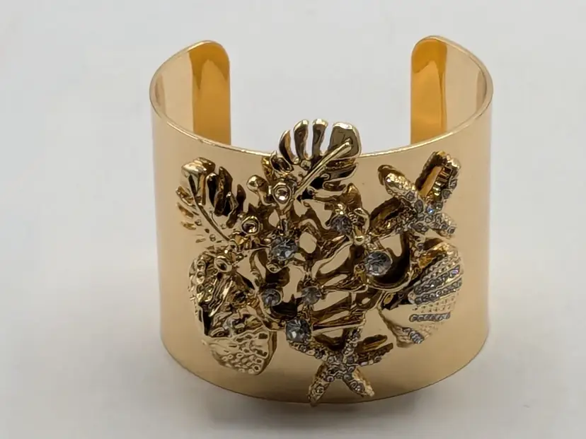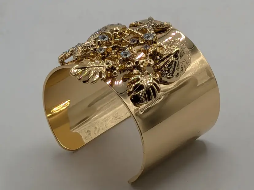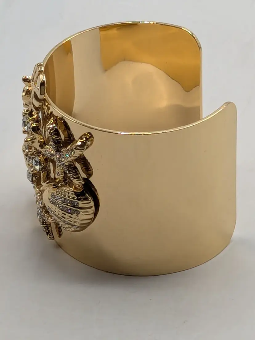 Stunning sea life bracelet! Good condition with three light scratches on side of cuff that is depicted in the last photo. Features a bold sea life motif with sparkling rhinestones. Gold tone is bright and shiny with no color loss. Size 7". wen