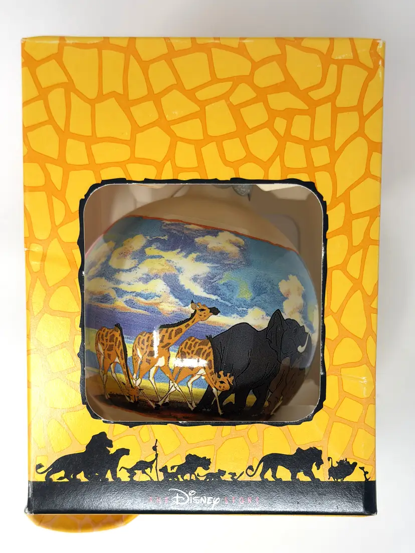DETAILS • Manufacturer: The Disney Store, U.S.A. • Markings: “Disney’s The Lion King 1994” printed graphics • Date/Era: 1994 • Design Style: Pop Art, Retro, Classic • Shape & Style Highlights: Round glass ornament with full panoramic film scene • Material & Color: Glass ball wrapped in printed film; oranges, blues, neutrals • Dimensions: 3.5" diameter; approx. 2 oz weight • Origin: Made in U.S.A. • Condition: New in box; mild shelf wear to box only
