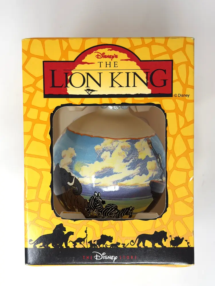 A vintage 1994 Lion King ornament with classic scenes from the film, wrapped around a glass ball and preserved in its original box.