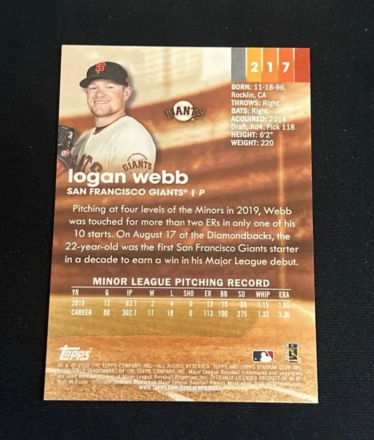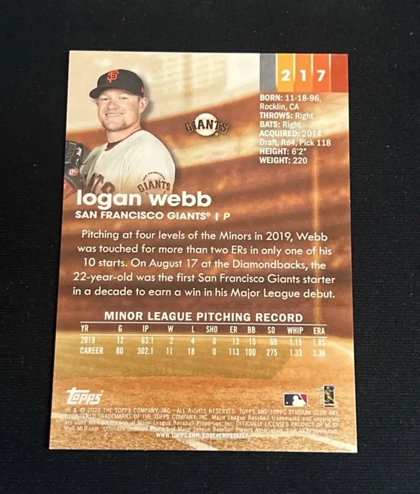 Logan Webb 2020 Stadium Club Sepia #217 RC Rookie San Francisco Giants