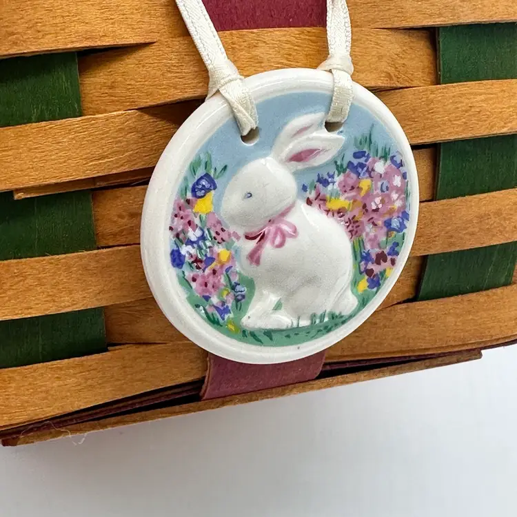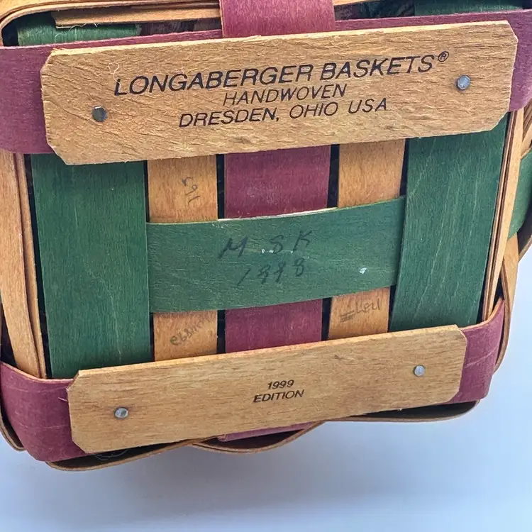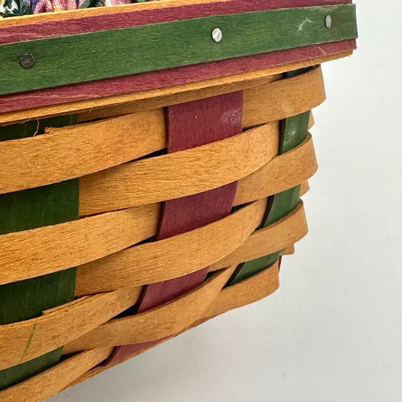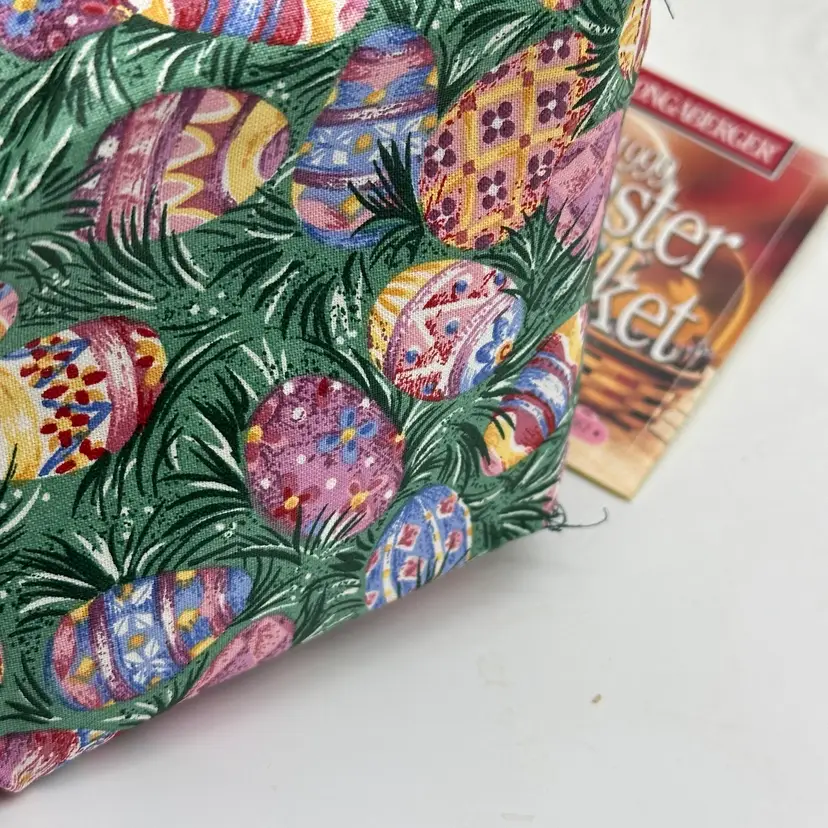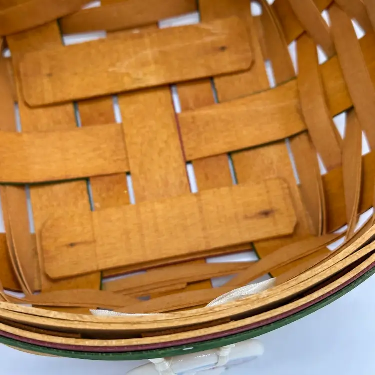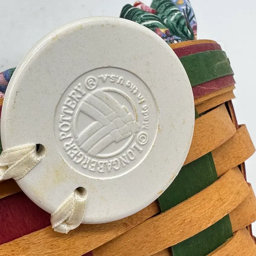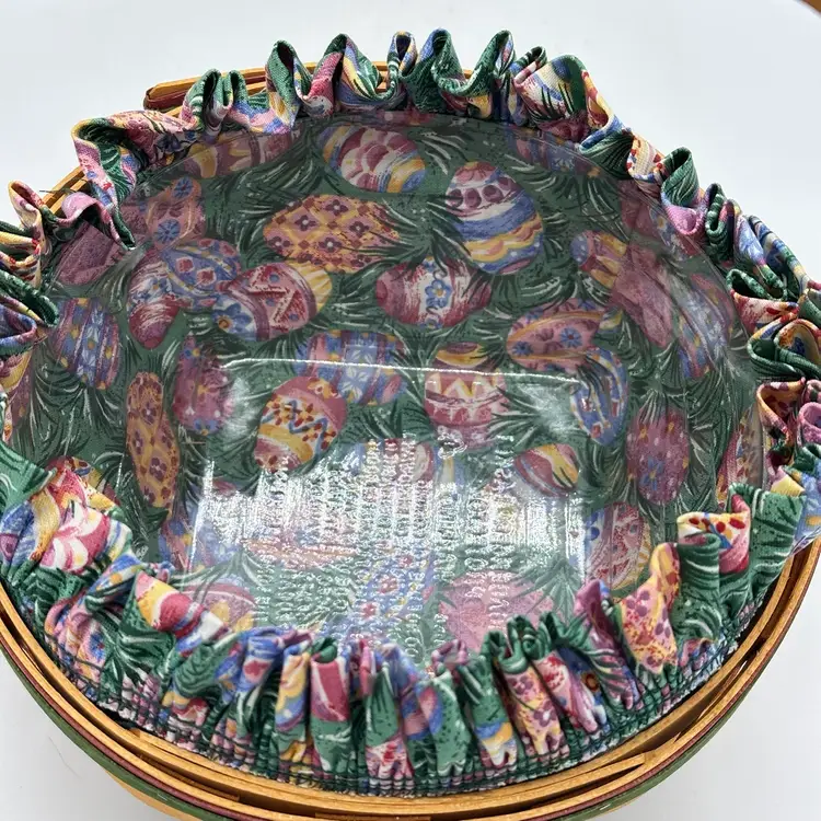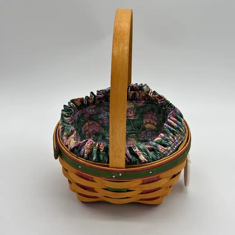 Longaberger 1999 Vintage Easter Basket Bundle Fabric Liner Plastic Protector & Tie On. In good condition. Does not have any damage. Has the fabric and plastic liner with the tie on. Measures 10 1/2 inches tall and 8 inches wide.