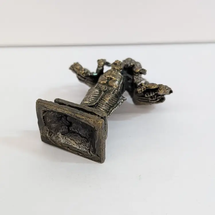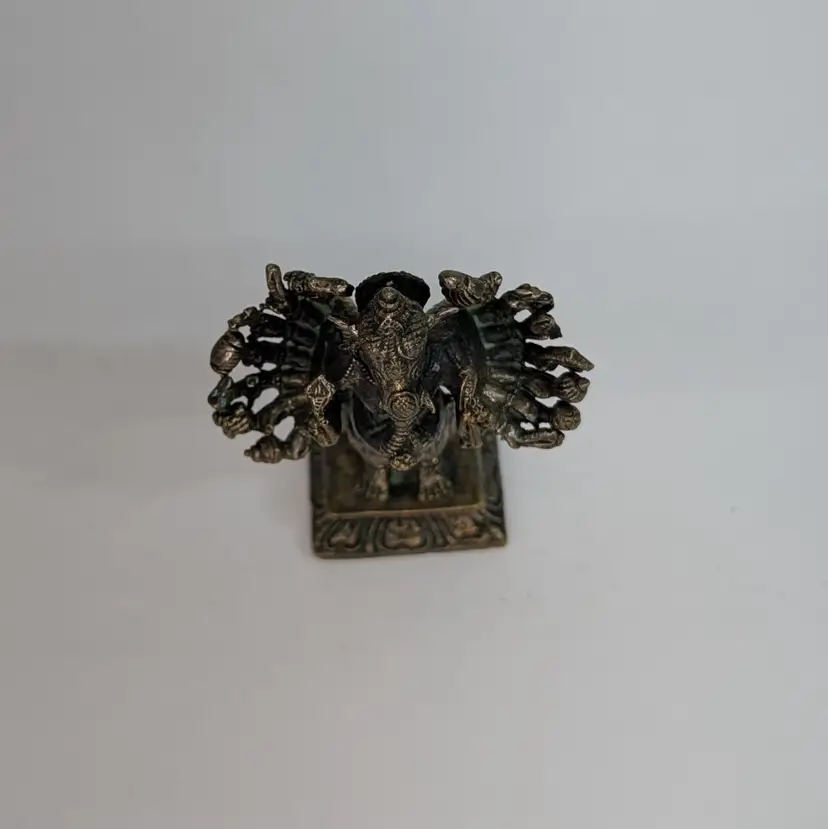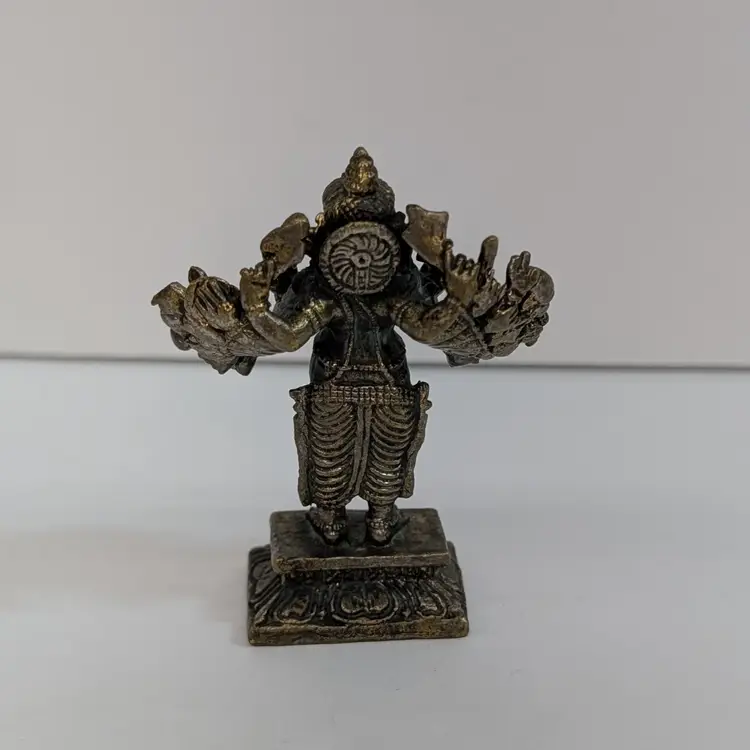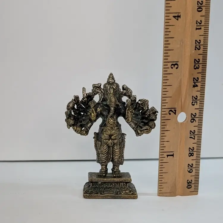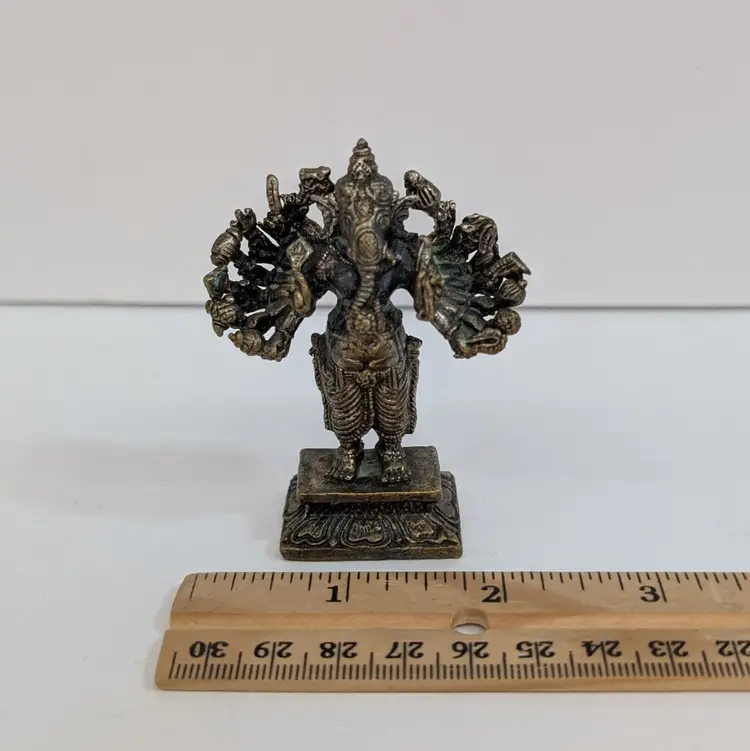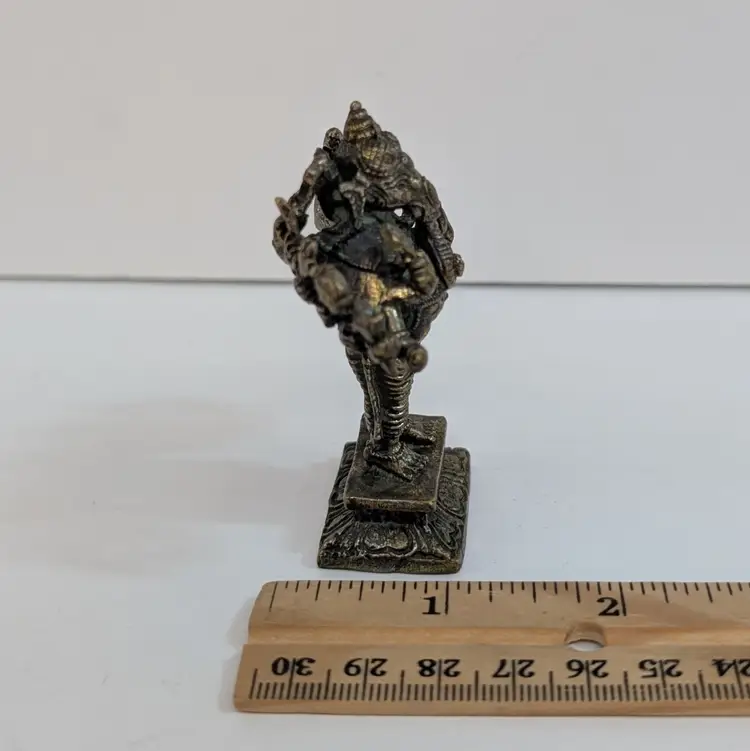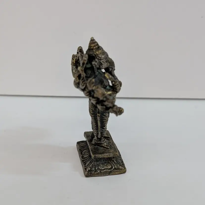 Miniature, metal figurine of Ganesha. Very detailed. In nice, used condition with minimal tarnish on the metal (see pictures). Measurements ~ 2.25 x 1 x 2.75"