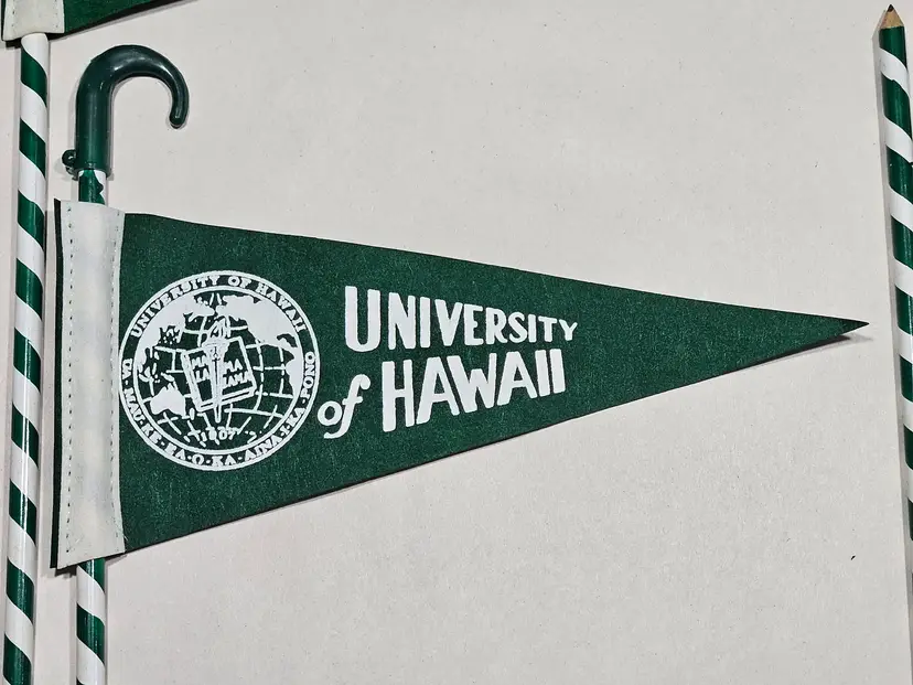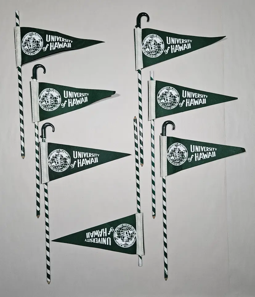 You are buying a lot of 7 vintage University of Hawaii souvenir collectibles. They are long pencils measuring 14-15 inches long (depending on if they have the curved top piece on or not) each with a mini pennant on top. The pennant measures about 8.75 inches long and 4 inches tall. You could always just take the pennants off and sell them by themselves. These were an awesome estate sale find and pretty unique so grab them while you can!