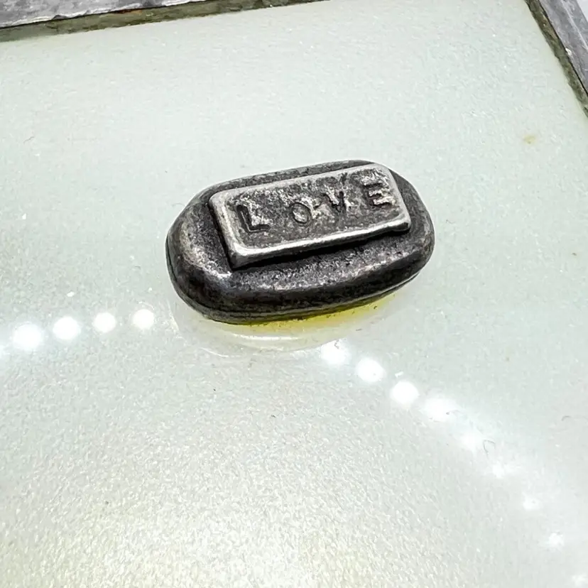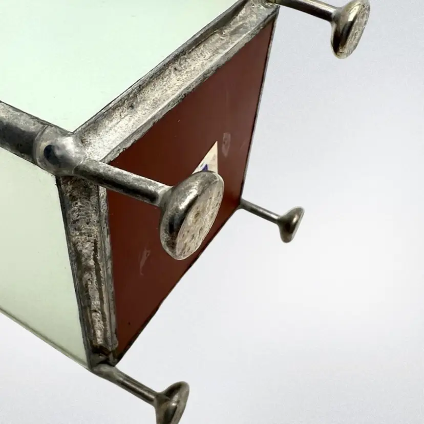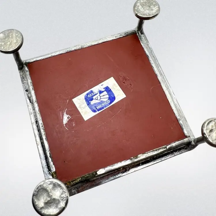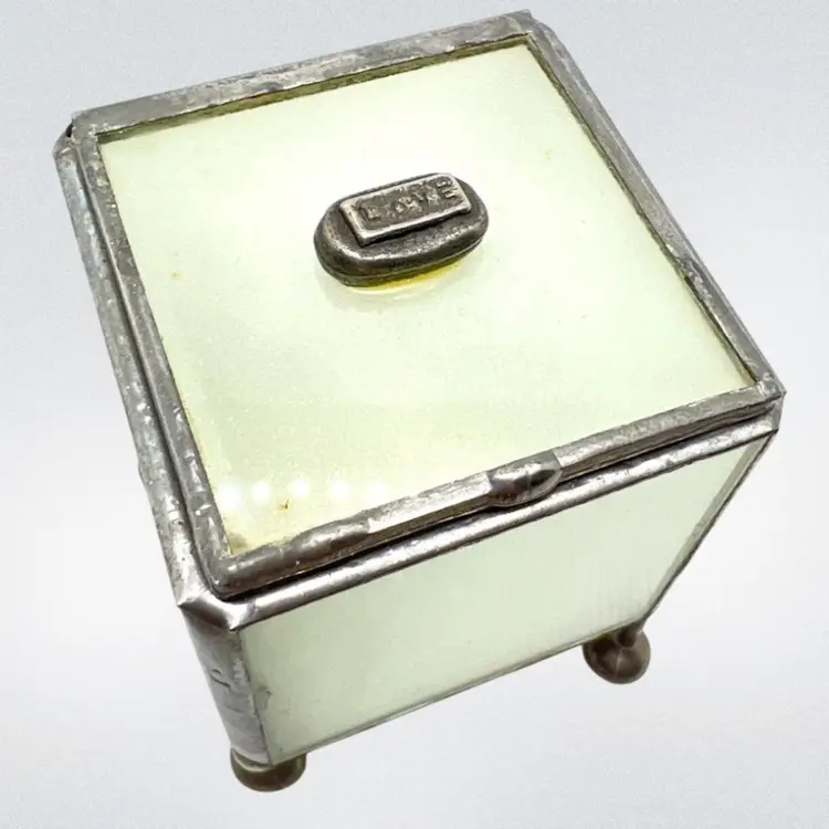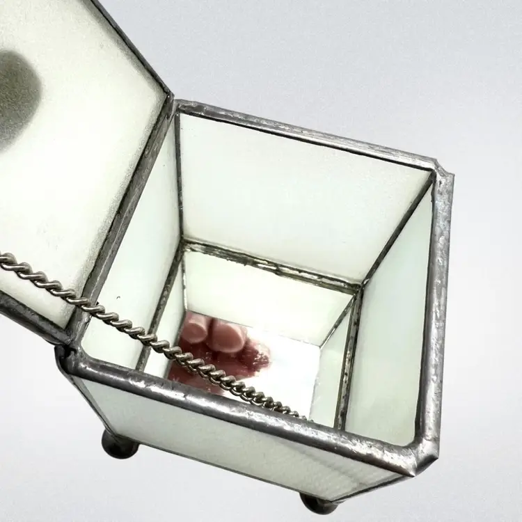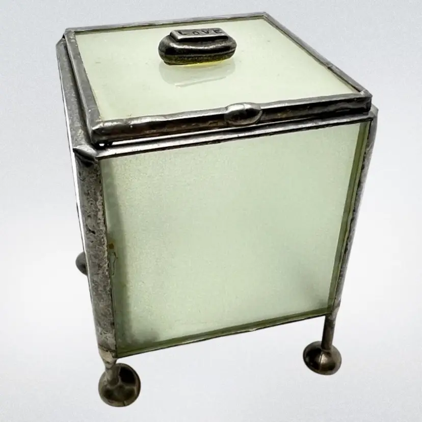Frosted glass sides and top LOVE stamped on top Soldered edges and feet Mirror on inside bottom Chain on inside to prop open lid Made in Mexico partial sticker on exterior bottom 2-1/4” x 2-1/4” x2-1/4” box 2-7/8” tall with legs No chips or cracks