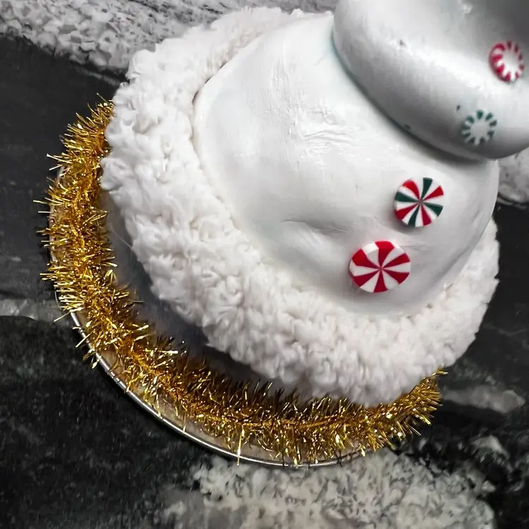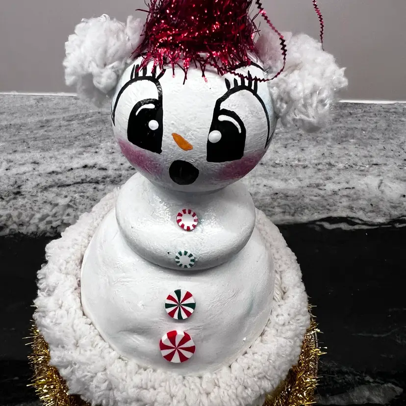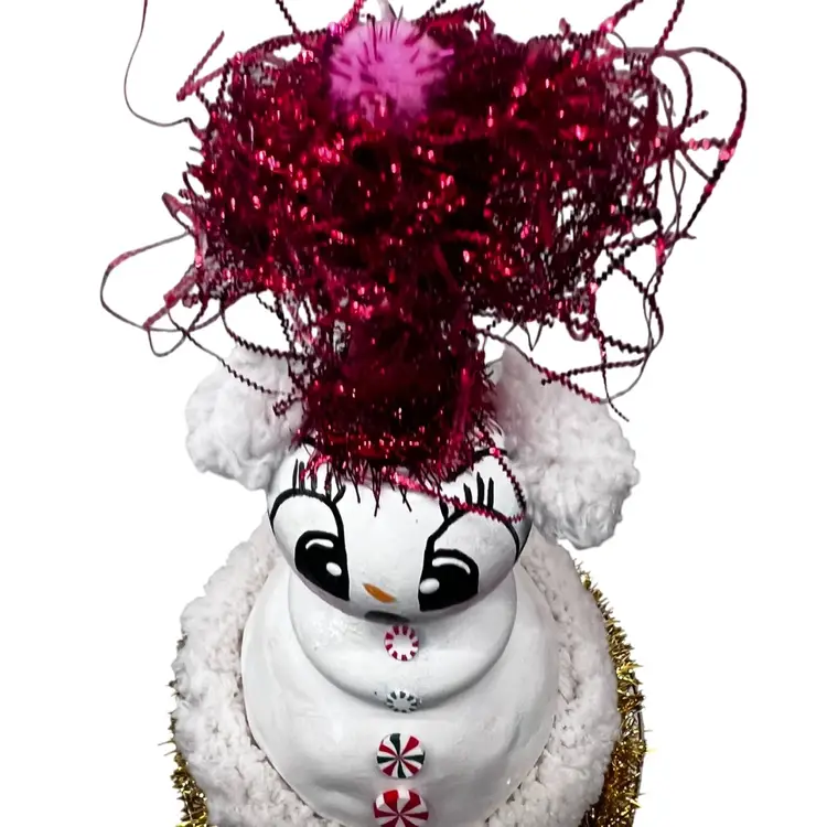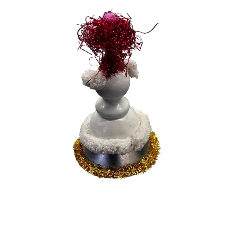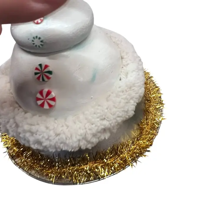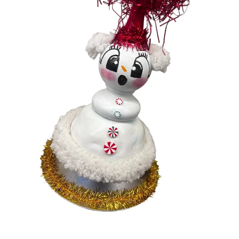 Handmade by me Hand painted sealed made from wood, foam clay, and metal Approximately 7 inches tall The top part are made by vintage spindles and the bottom part. The metal tart tins are vintage. I do have multiples of these. I have two with the red tops and two with the silver tops.